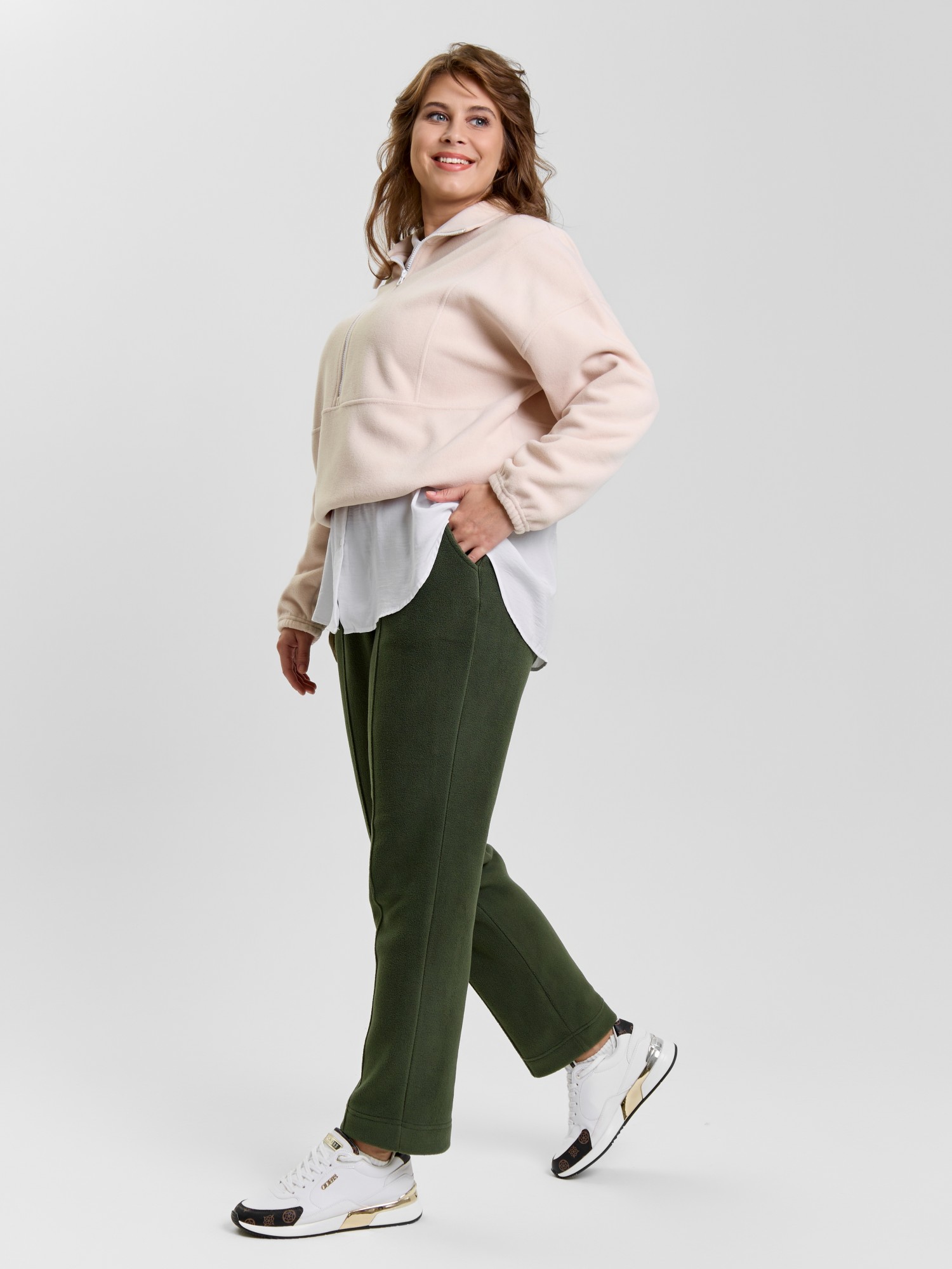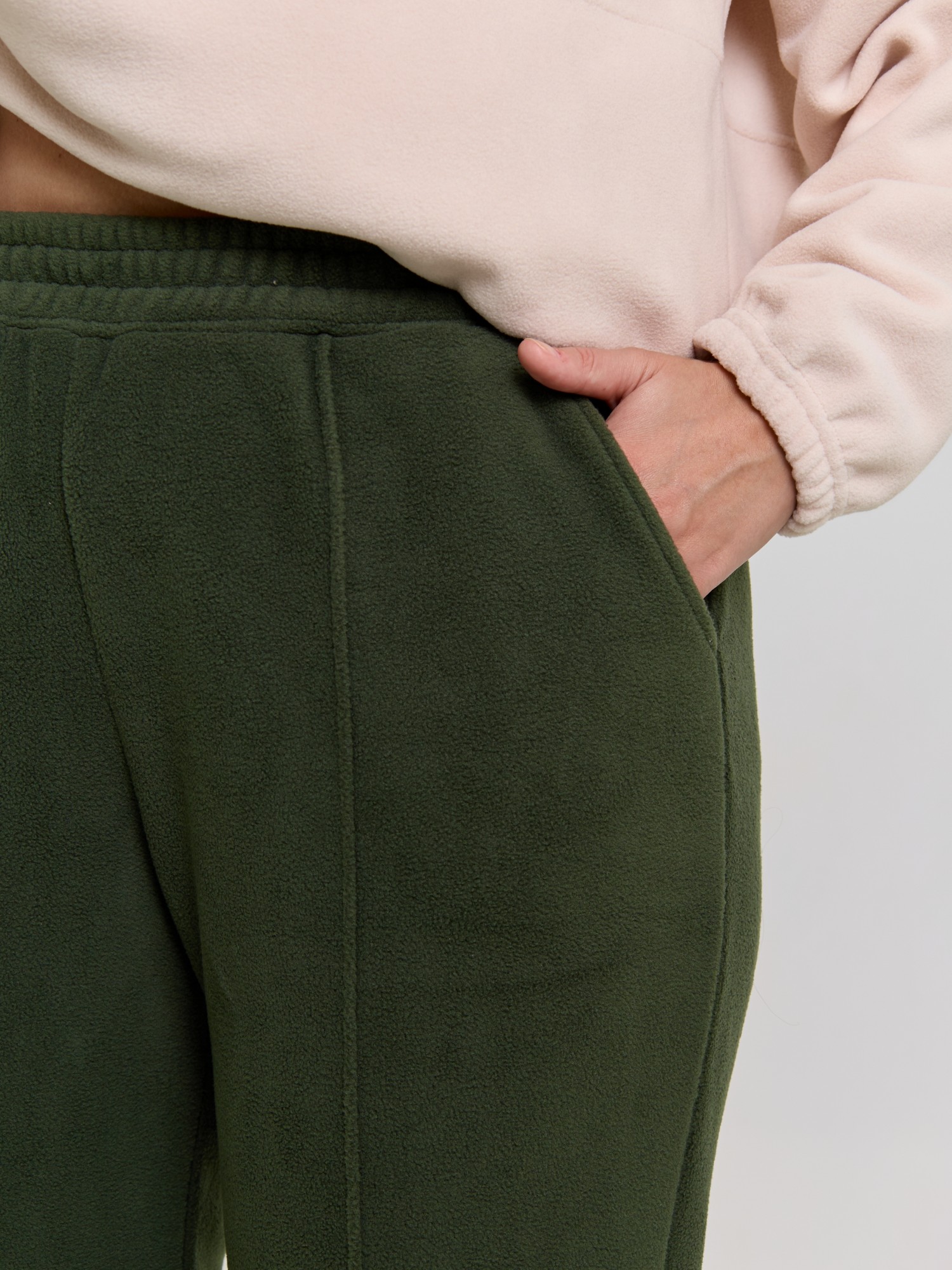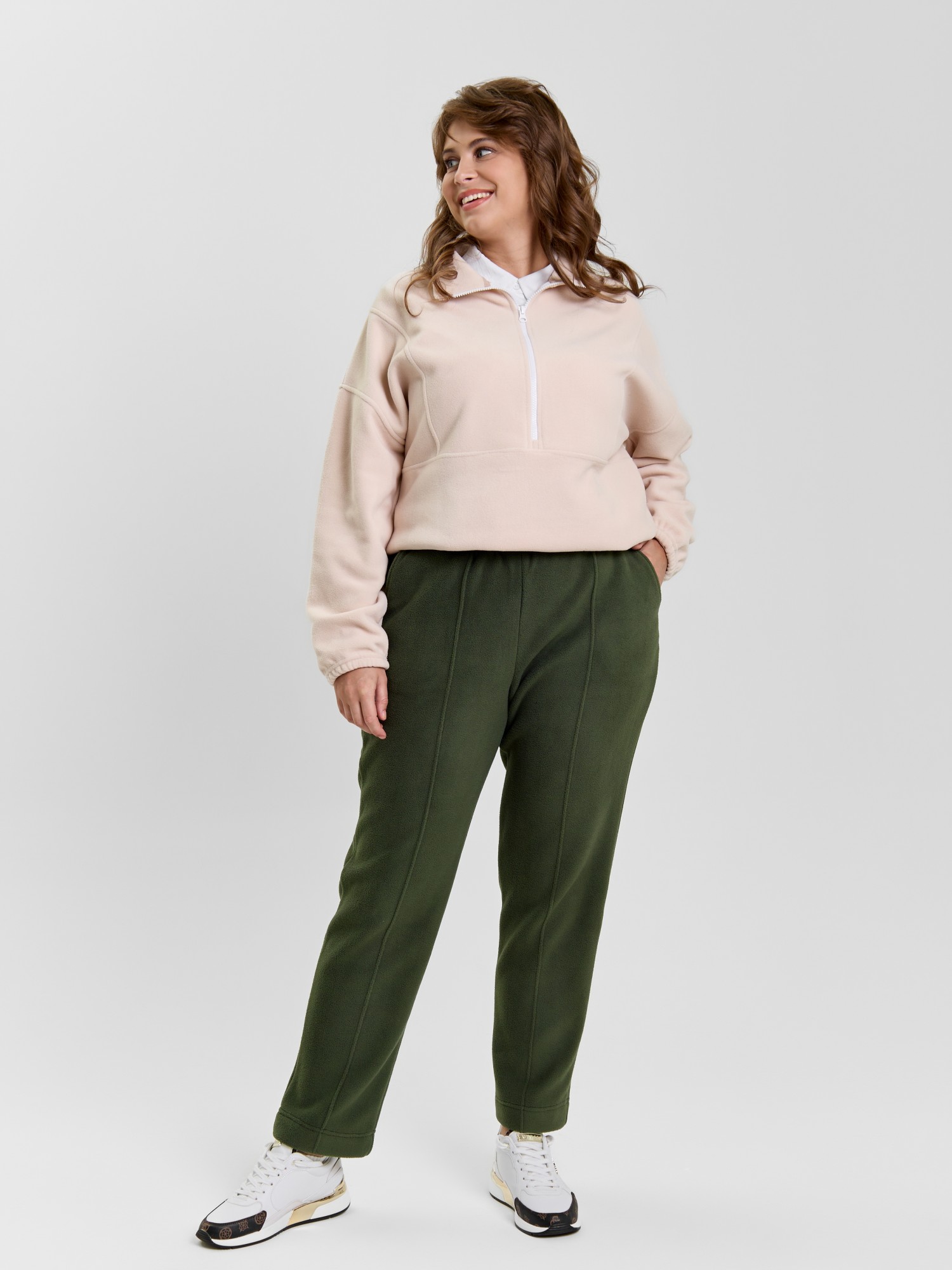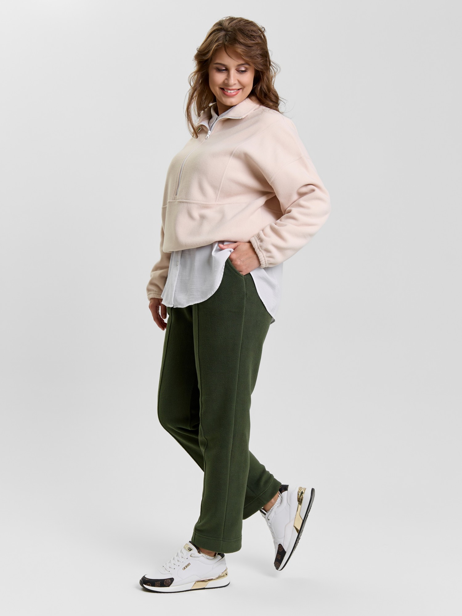 Брюки женские из гладкокрашенного трикотажного полотна «флис», длинные, полуприлегающего силуэта, на притачном поясе с эластичной тесьмой внутри и карманами в боковых швах. Передние половины застрочены по центральным линиям, низ обработан широкой подгибкой.