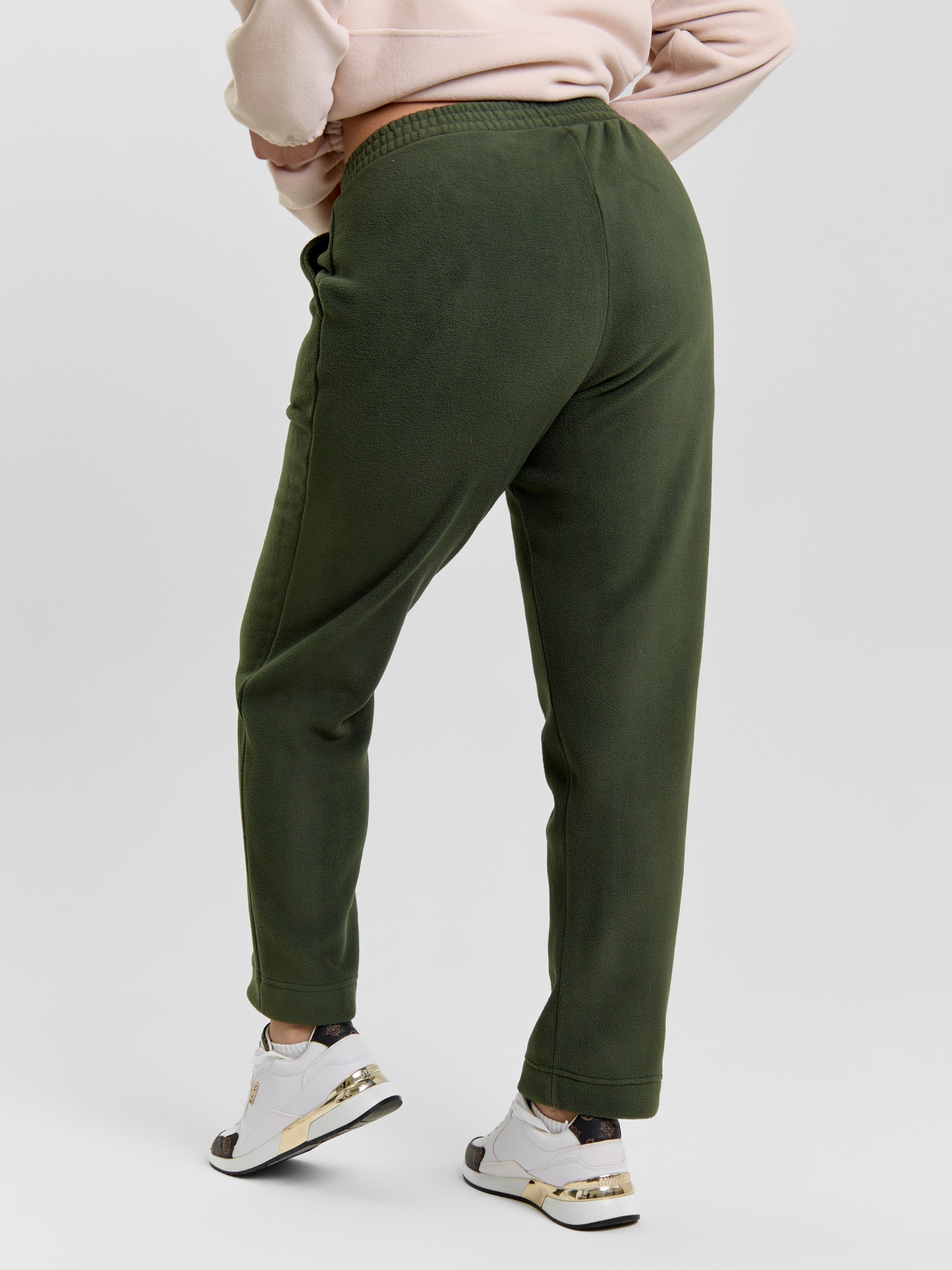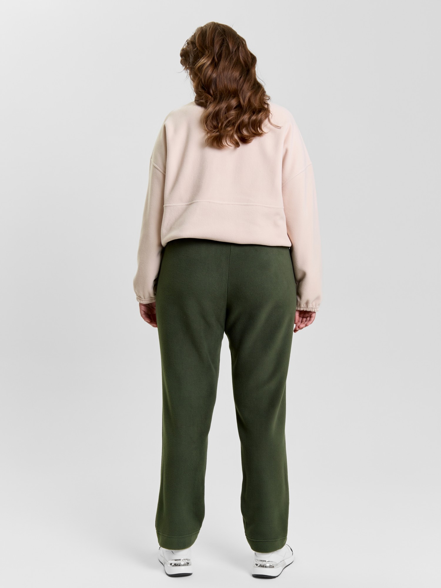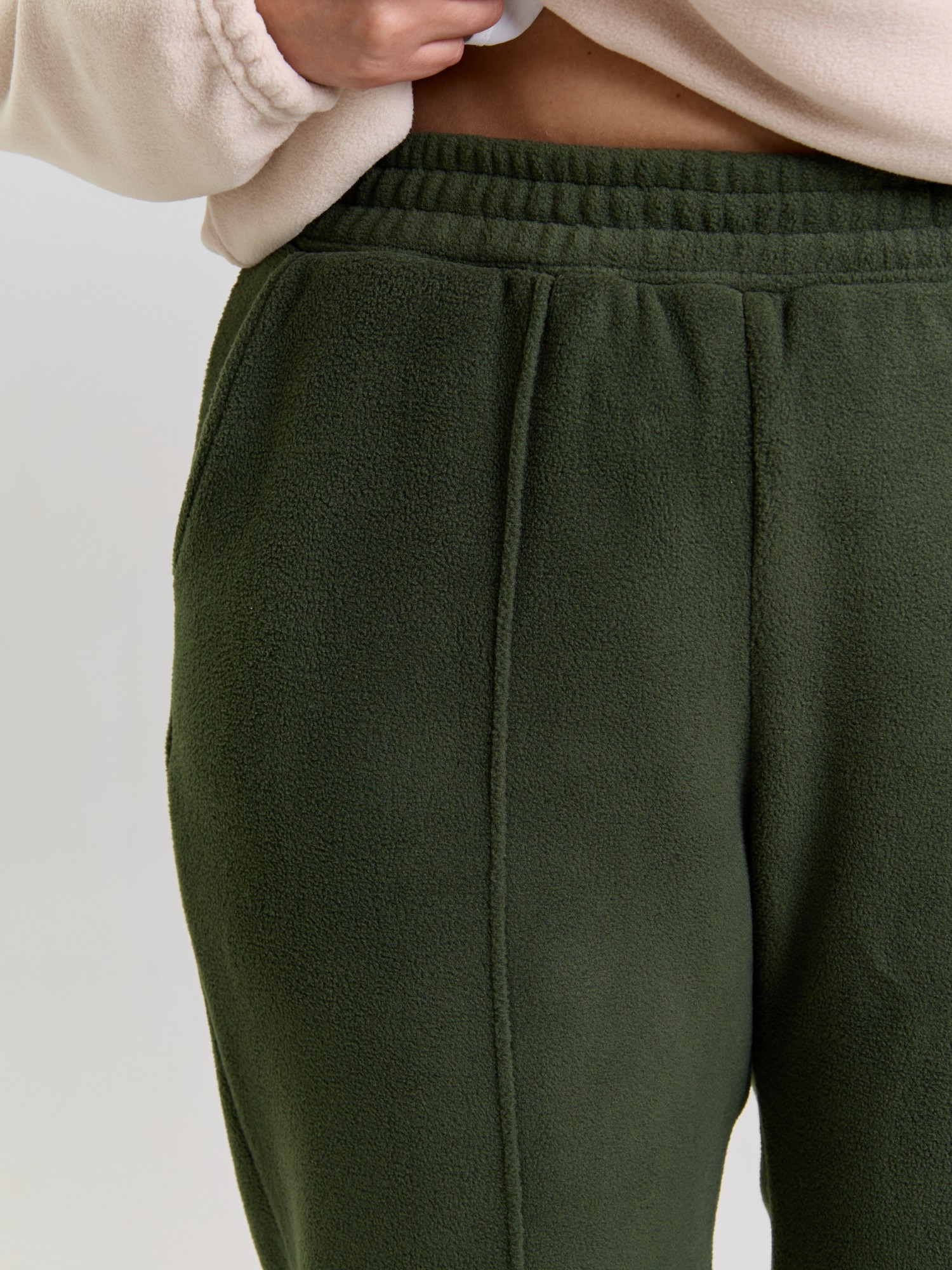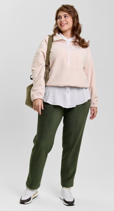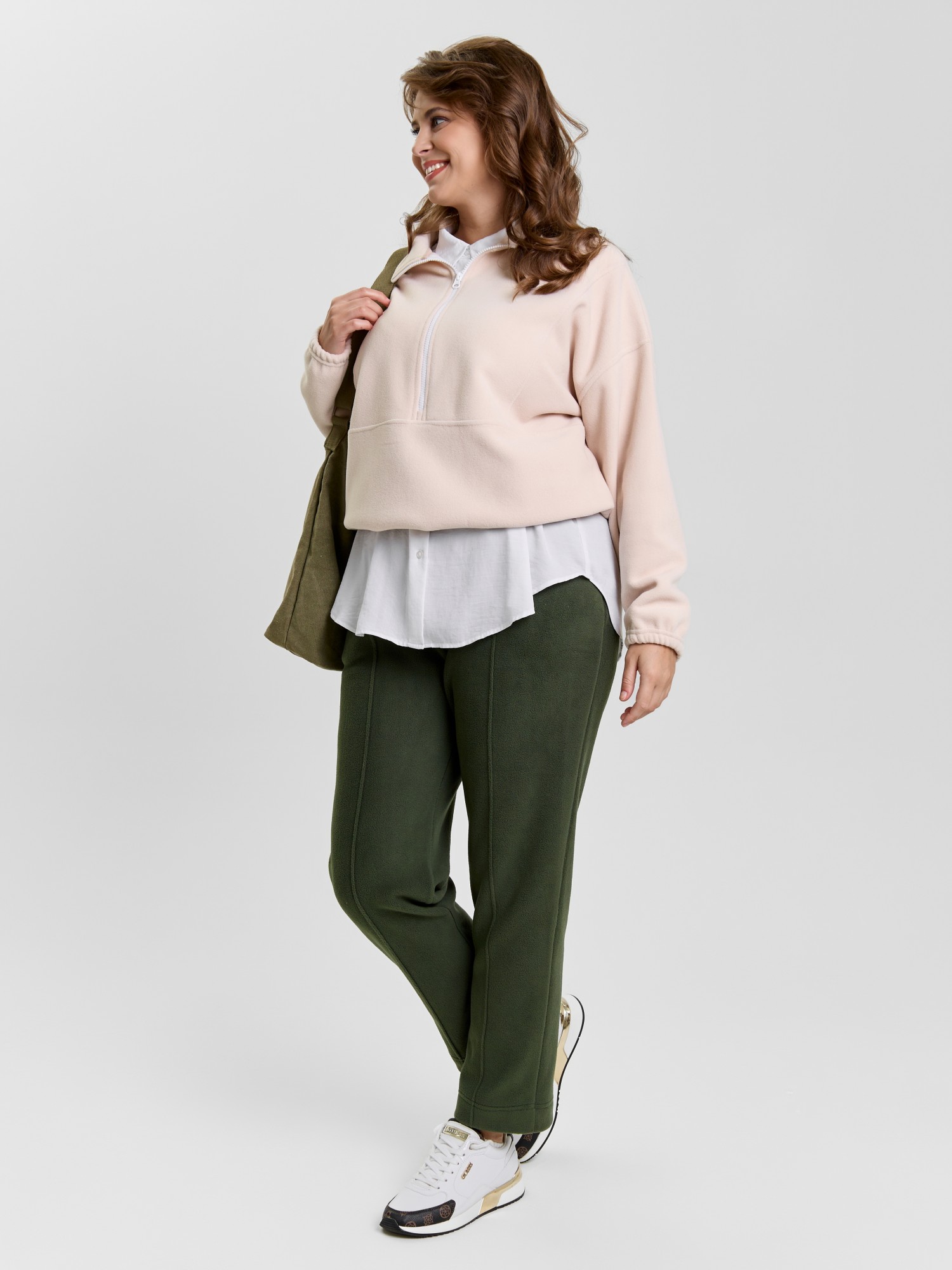 Брюки женские из гладкокрашенного трикотажного полотна «флис», длинные, полуприлегающего силуэта, на притачном поясе с эластичной тесьмой внутри и карманами в боковых швах. Передние половины застрочены по центральным линиям, низ обработан широкой подгибкой.