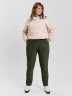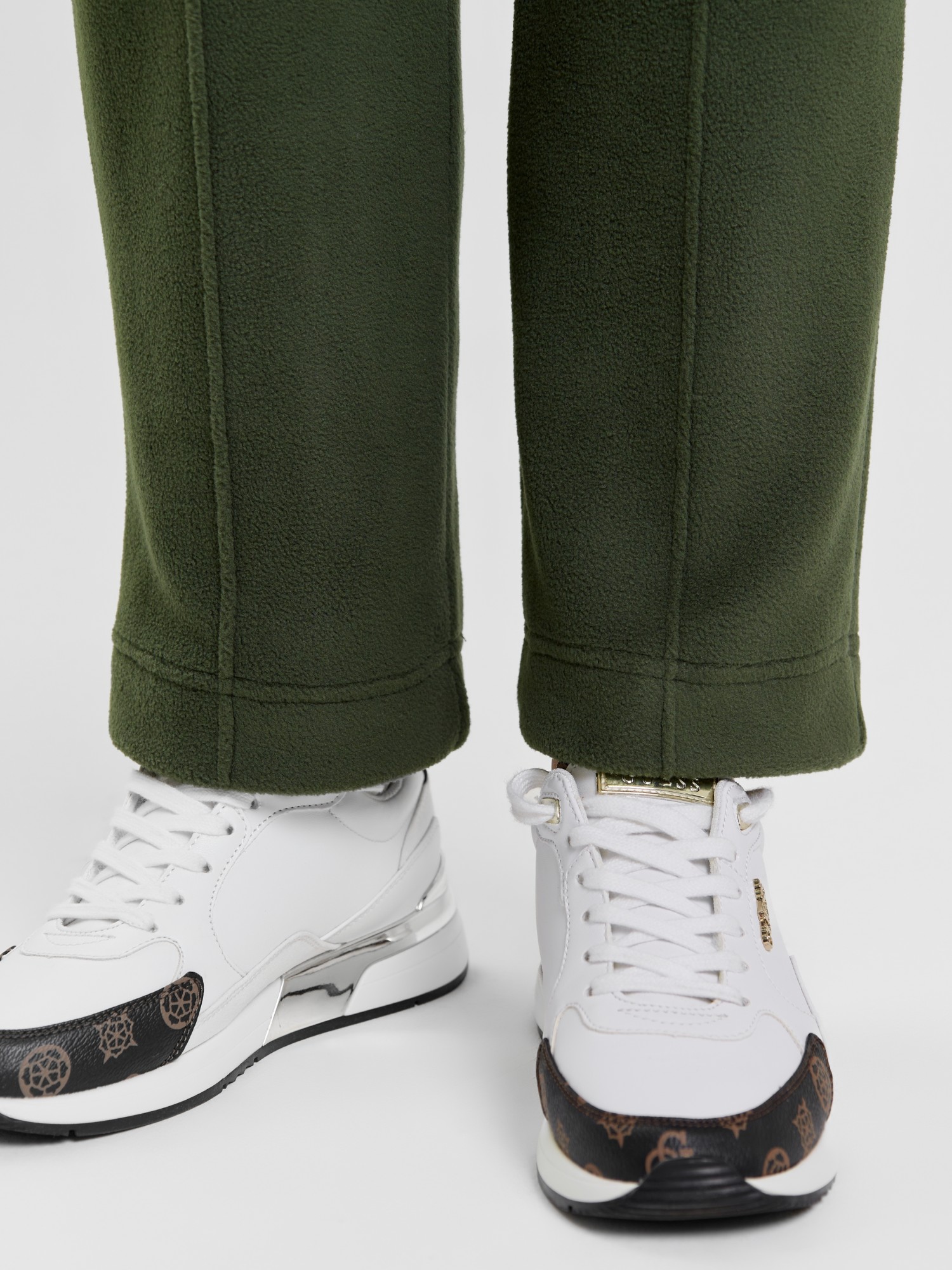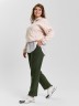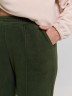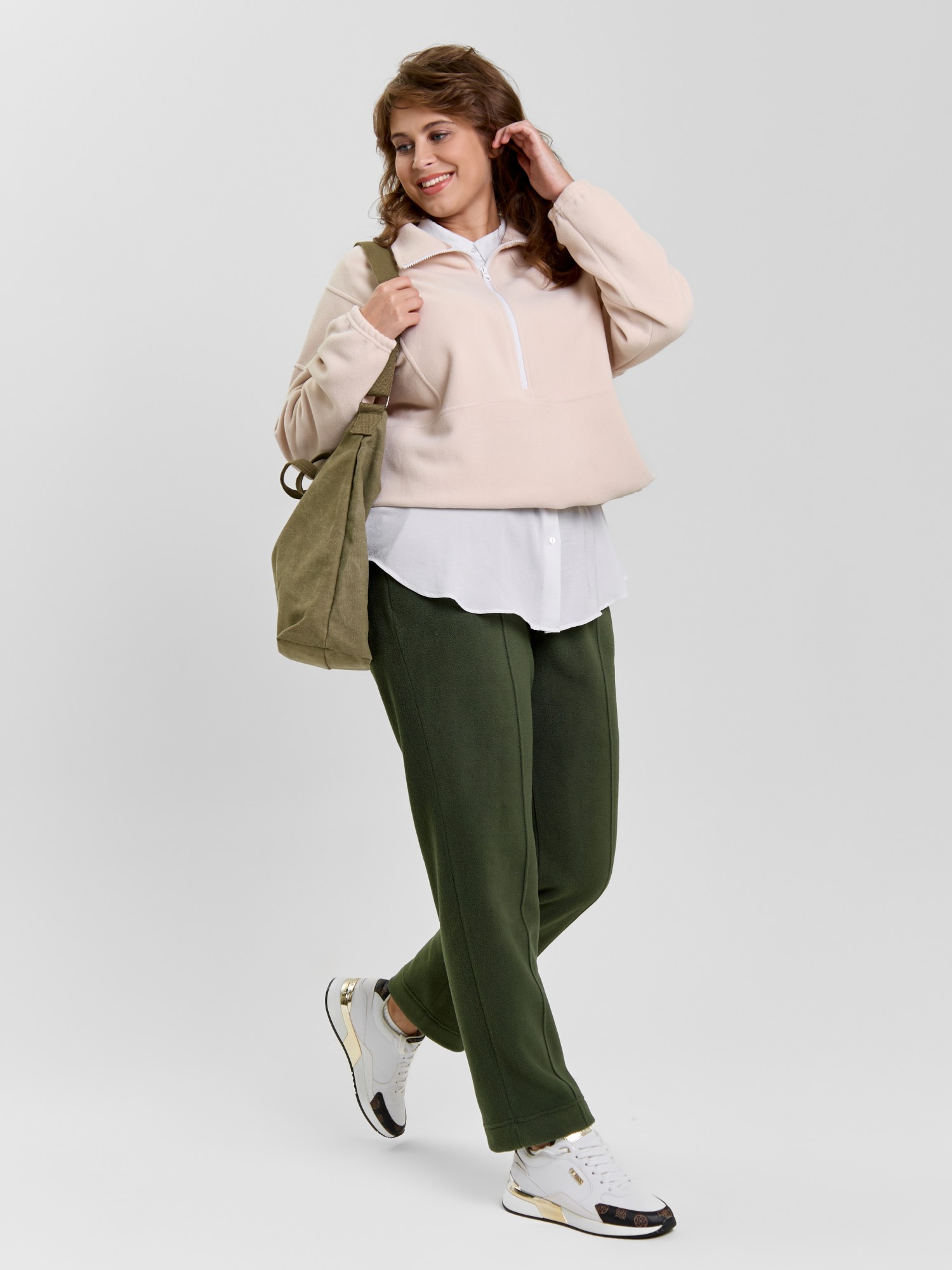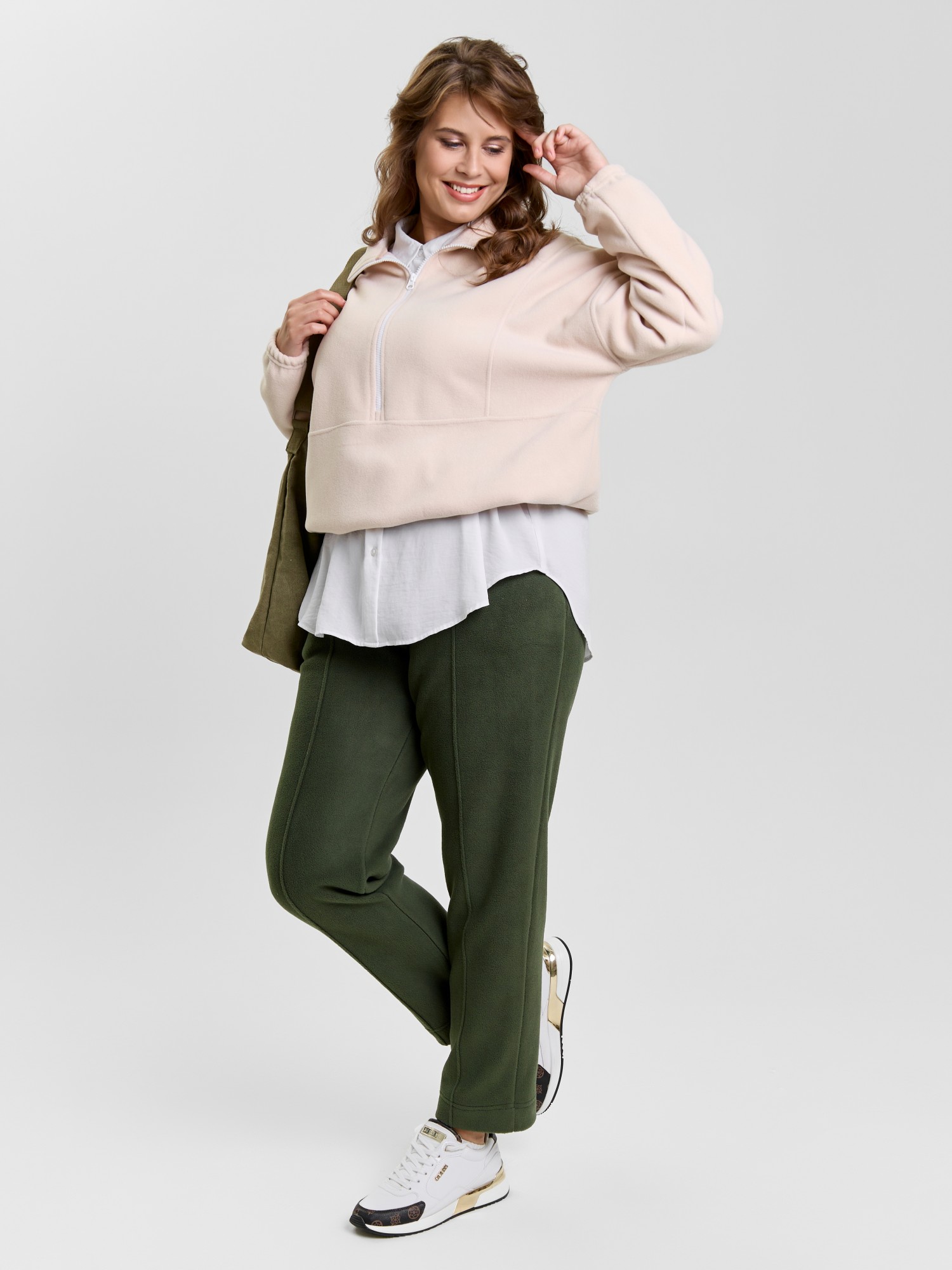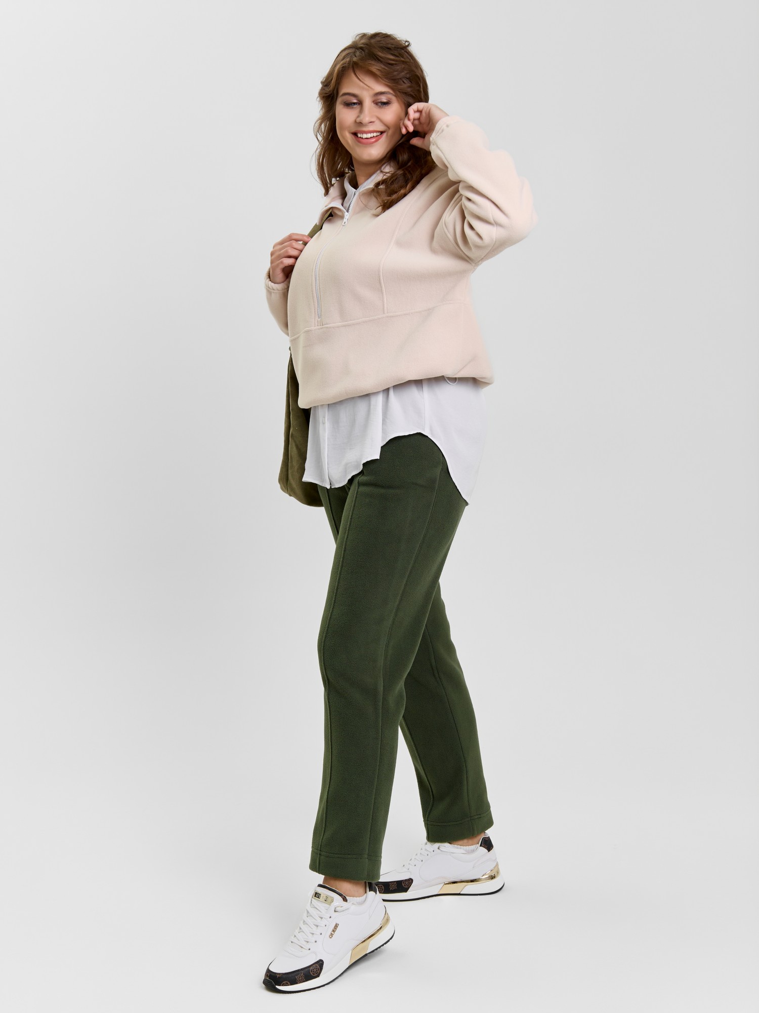 Брюки женские из гладкокрашенного трикотажного полотна «флис», длинные, полуприлегающего силуэта, на притачном поясе с эластичной тесьмой внутри и карманами в боковых швах. Передние половины застрочены по центральным линиям, низ обработан широкой подгибкой.