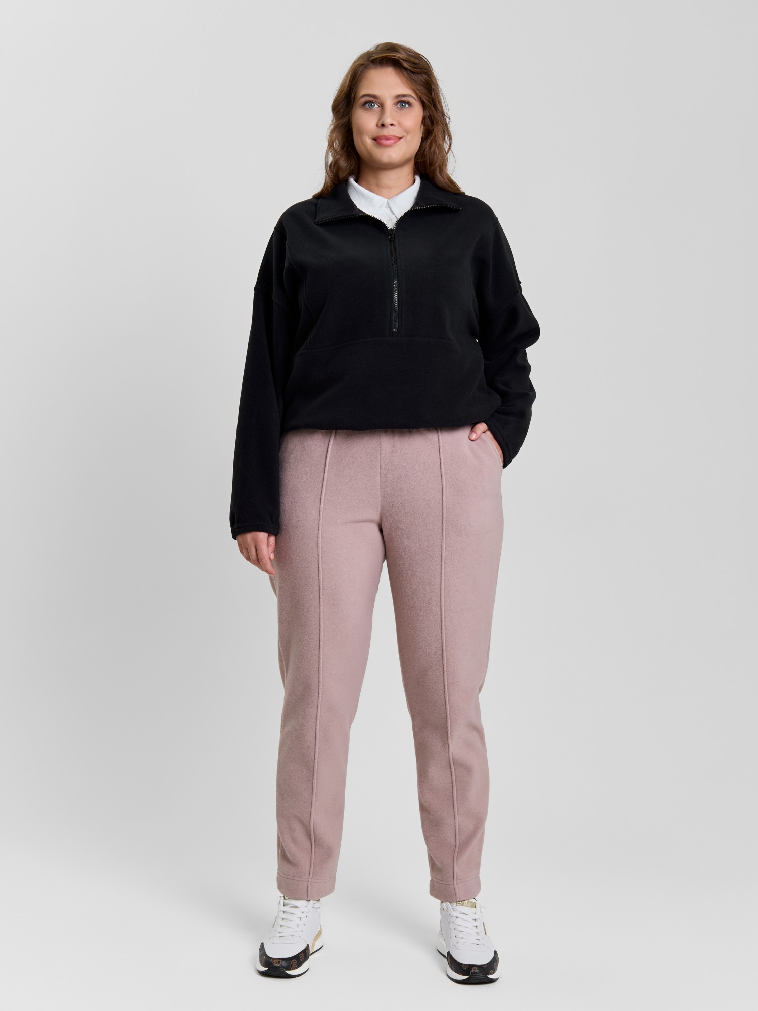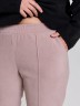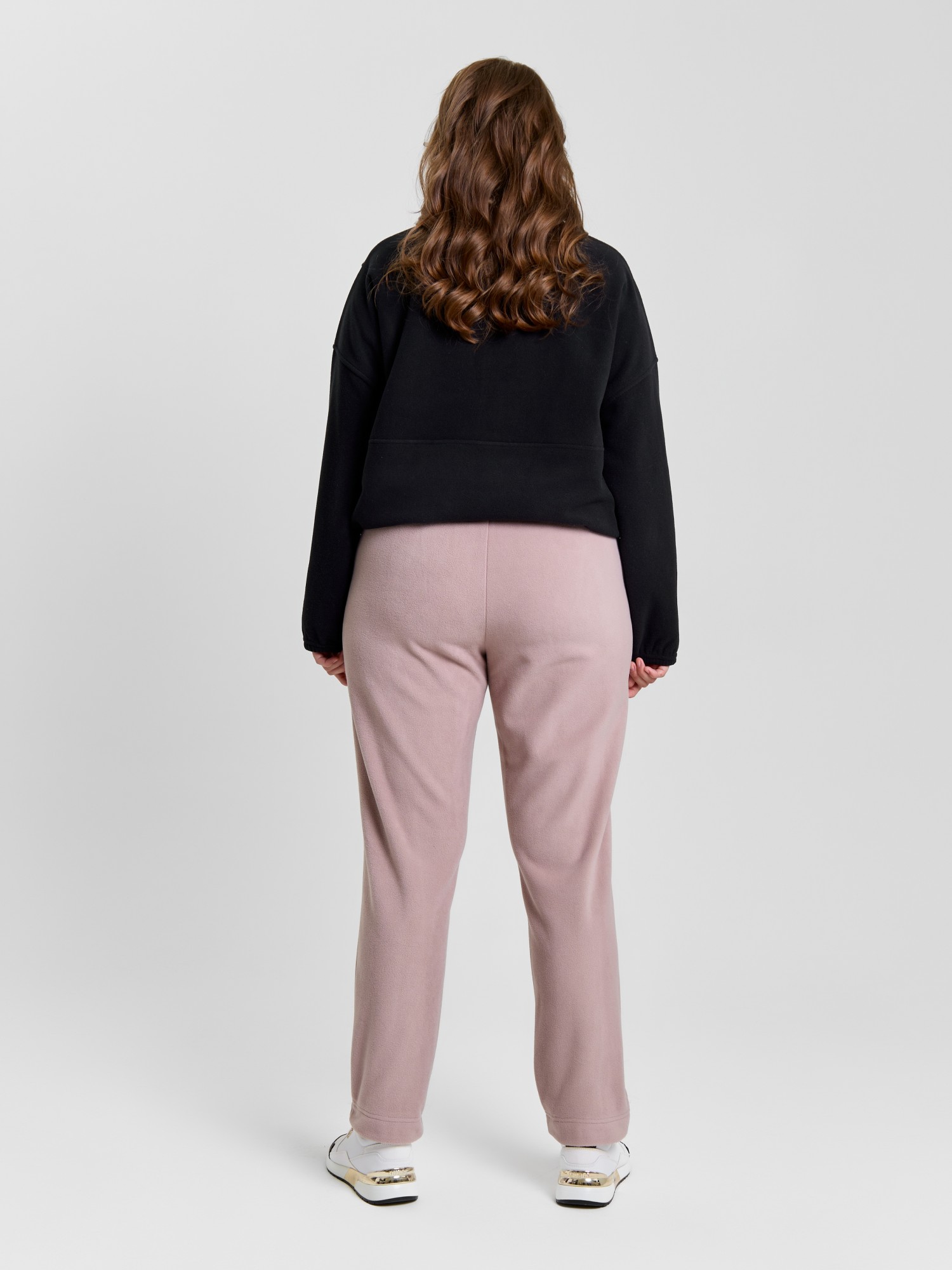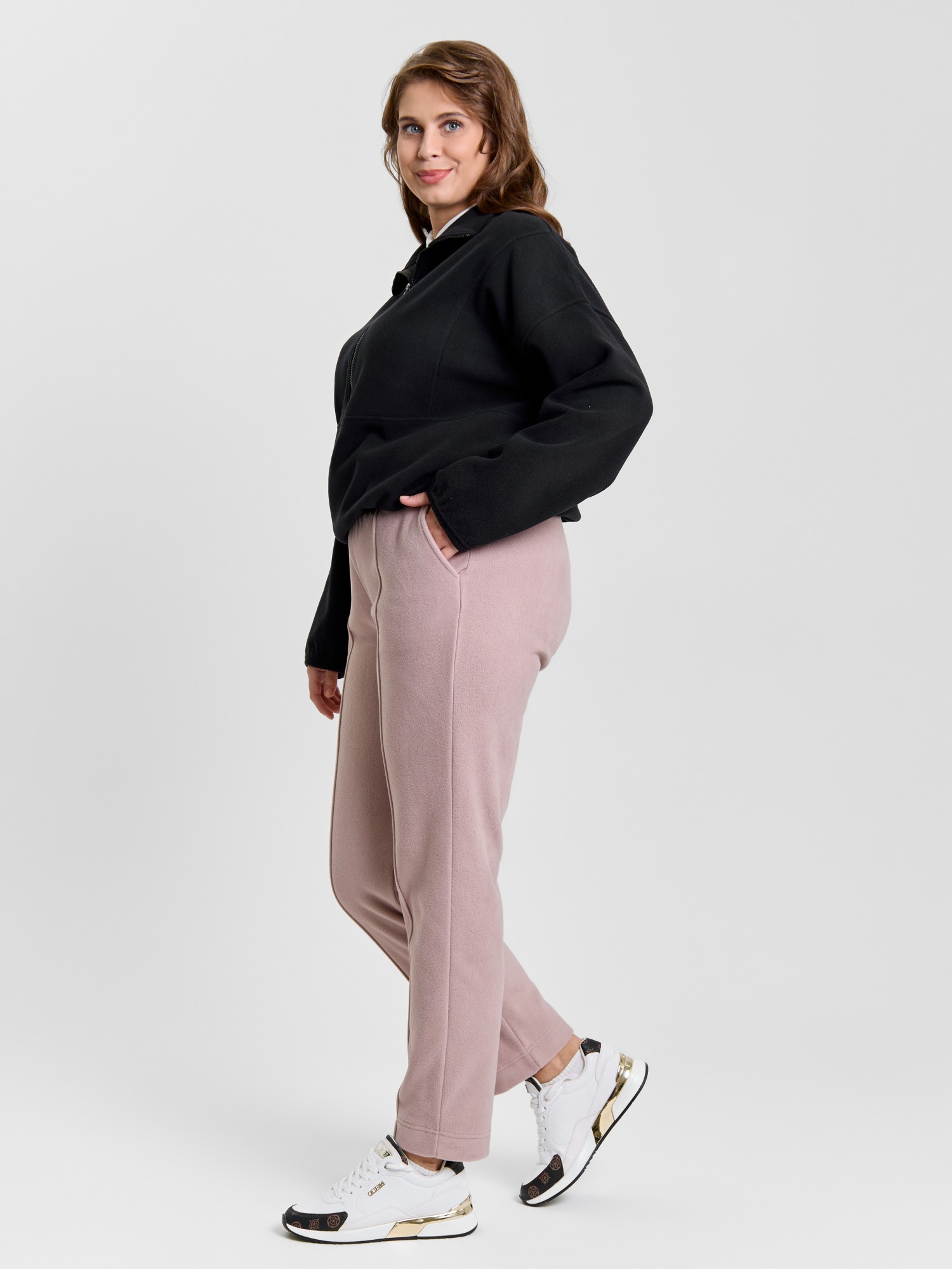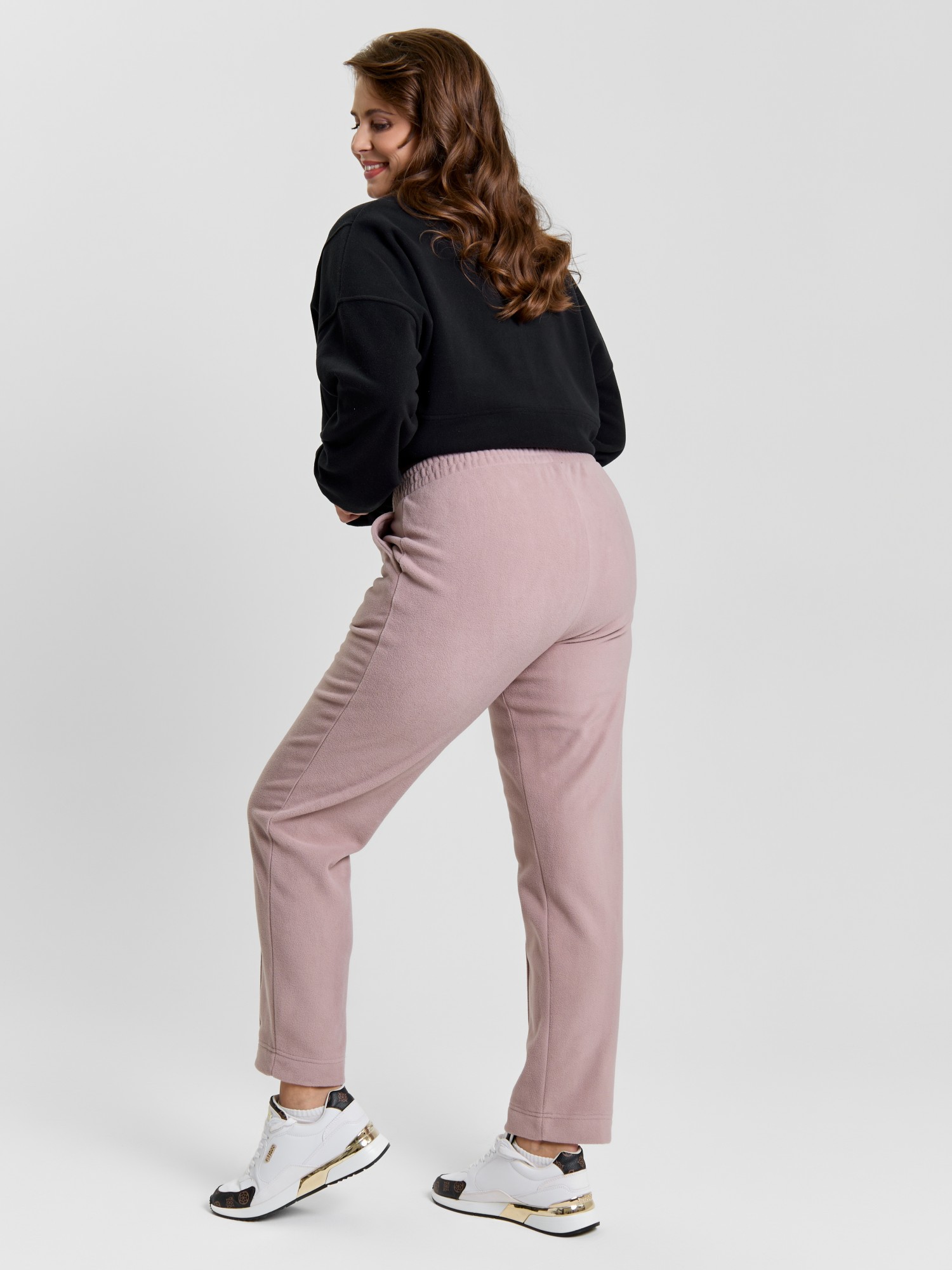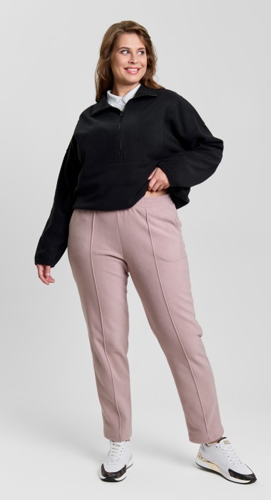 Брюки женские из гладкокрашенного трикотажного полотна «флис», длинные, полуприлегающего силуэта, на притачном поясе с эластичной тесьмой внутри и карманами в боковых швах. Передние половины застрочены по центральным линиям, низ обработан широкой подгибкой.