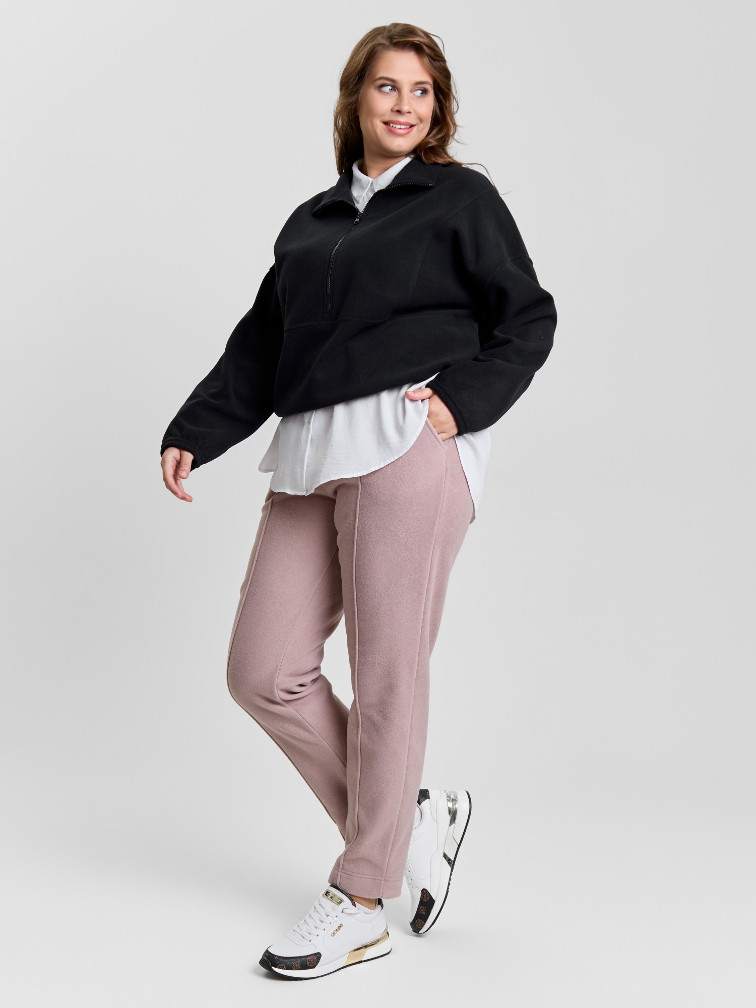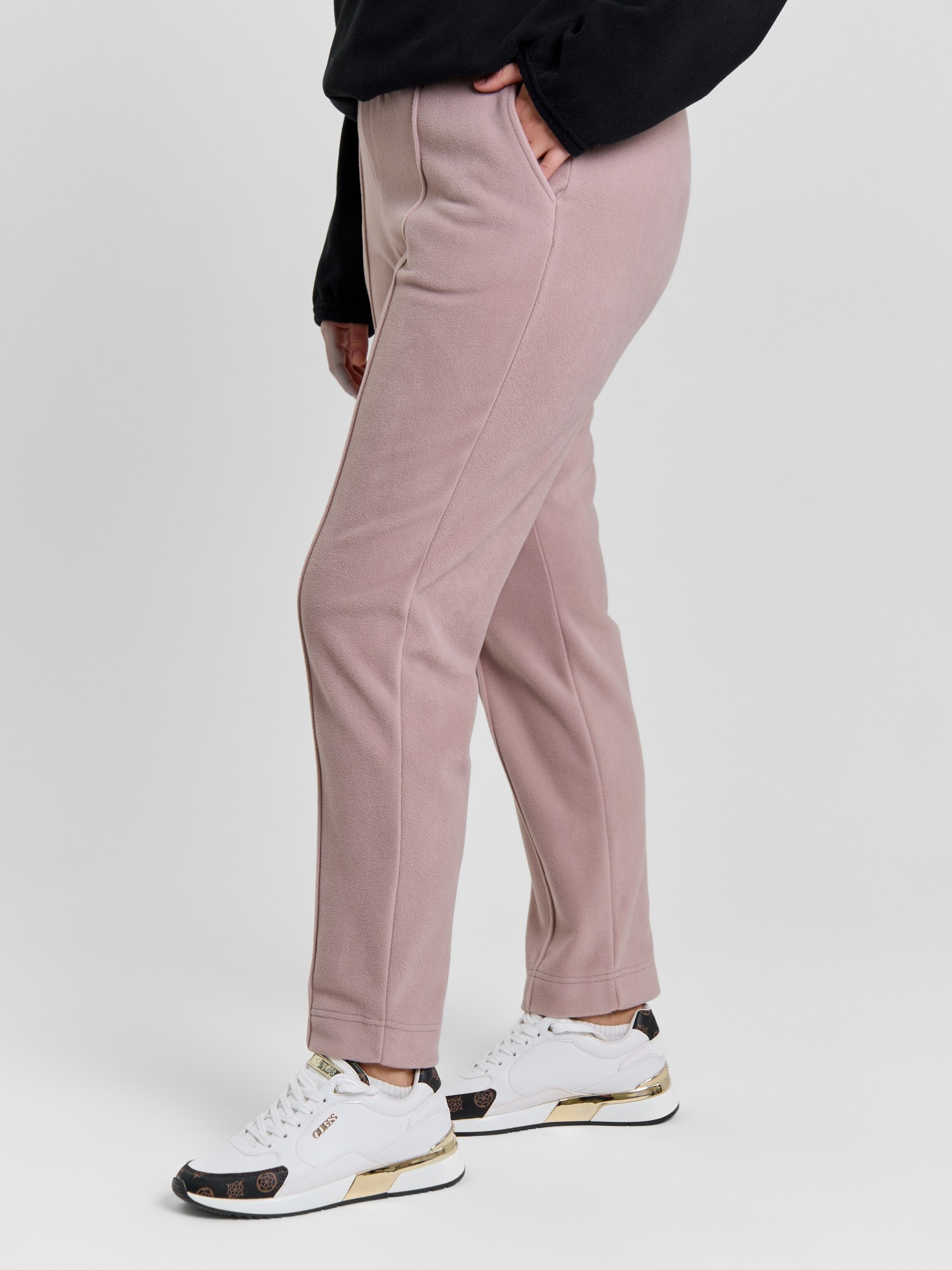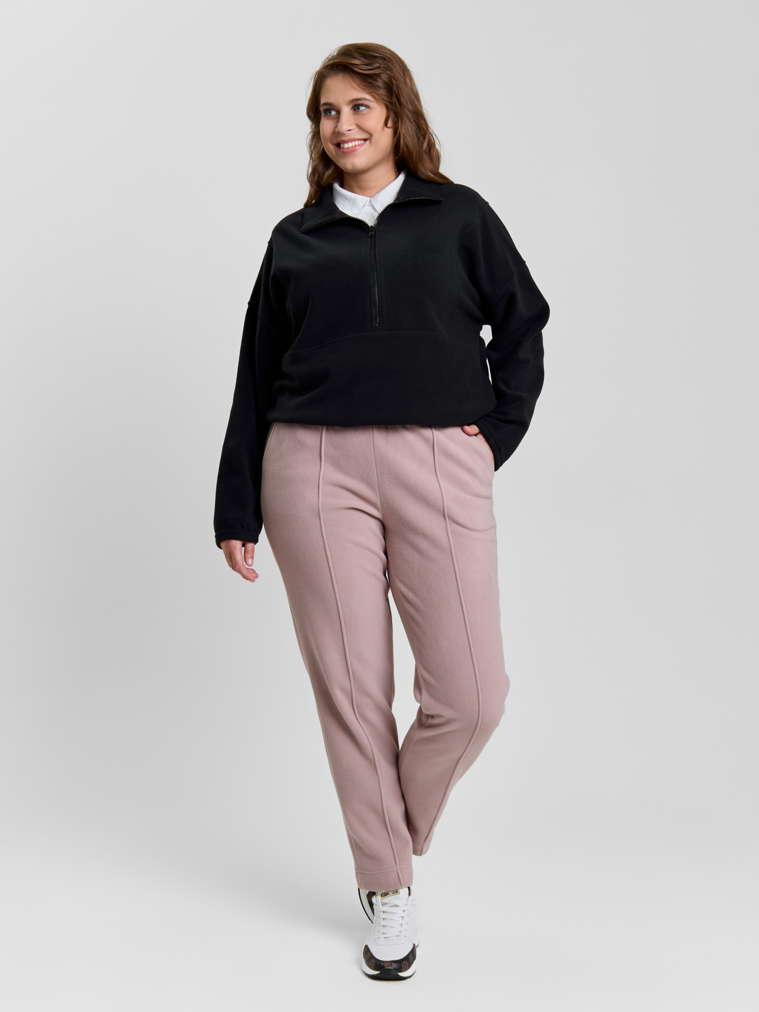 Брюки женские из гладкокрашенного трикотажного полотна «флис», длинные, полуприлегающего силуэта, на притачном поясе с эластичной тесьмой внутри и карманами в боковых швах. Передние половины застрочены по центральным линиям, низ обработан широкой подгибкой.