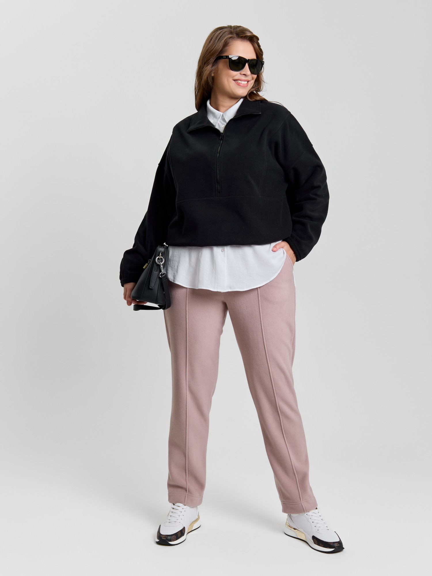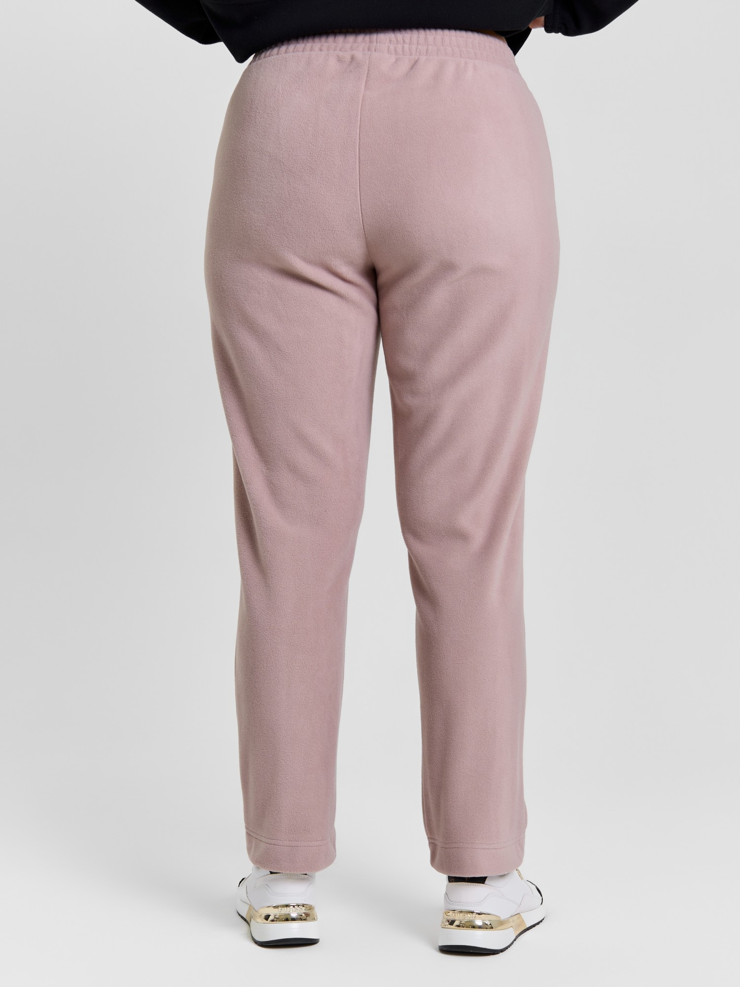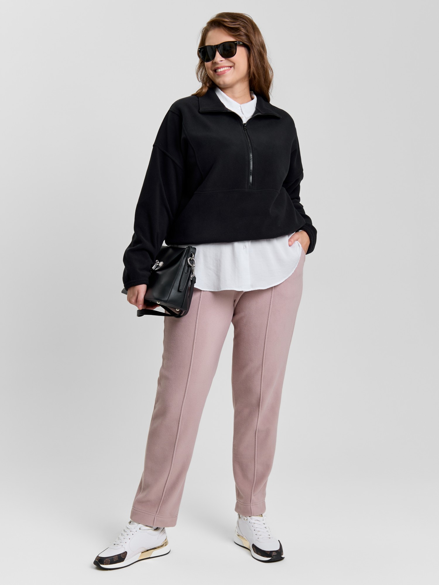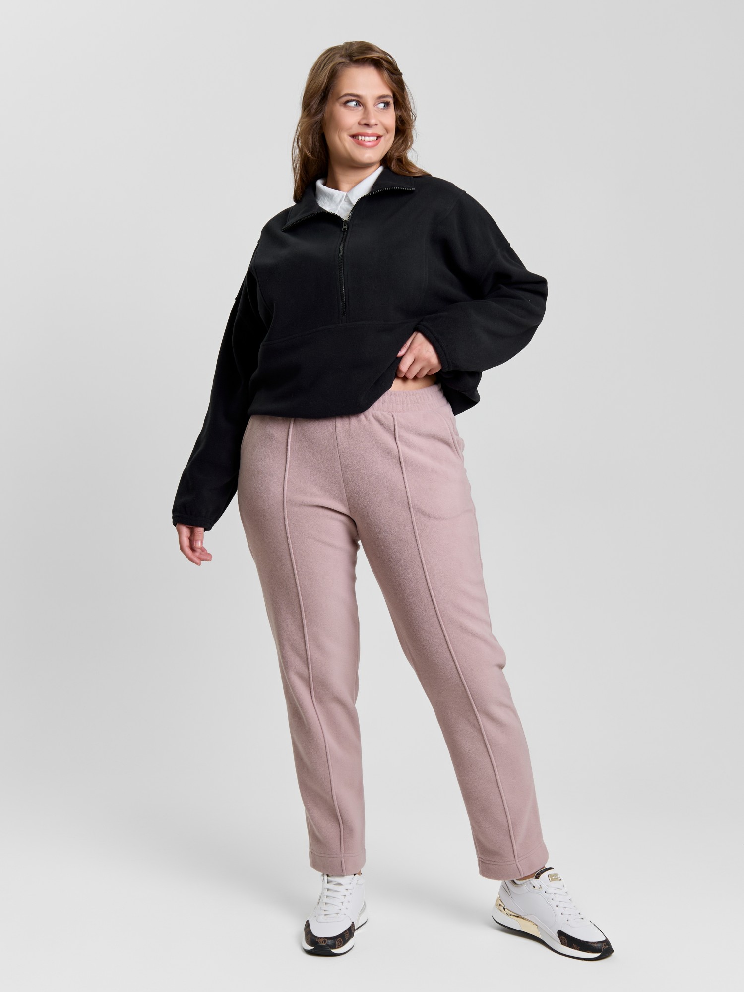 Брюки женские из гладкокрашенного трикотажного полотна «флис», длинные, полуприлегающего силуэта, на притачном поясе с эластичной тесьмой внутри и карманами в боковых швах. Передние половины застрочены по центральным линиям, низ обработан широкой подгибкой.