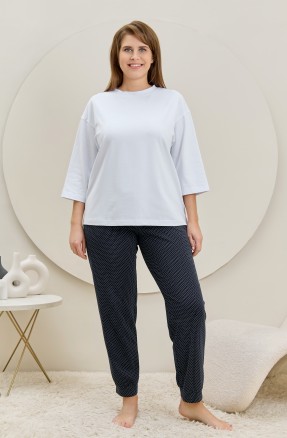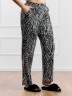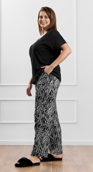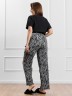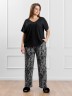 Брюки женские из трикотажного полотна «бурумчук» (шелковый креп) с набивным рисунком, прямого кроя, свободные, с карманами в боковых швах, на притачном поясе с эластичной тесьмой внутри.