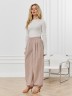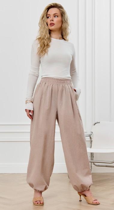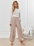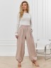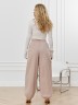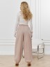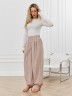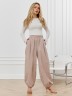 Брюки женские из гладкокрашенного фактурного полотна, свободного покроя, расширенные книзу, на притачном поясе с эластичной тесьмой внутри, с карманами в боковых швах. Нижние срезы брюк присборены и окантованы основным материалом. На передних половинах брюк обработаны складочки-защипы по две с каждой стороны.