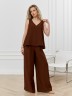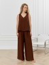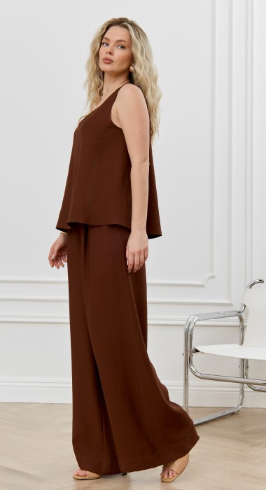 Брюки женские из гладкокрашеного фактурного полотна длинные, широкие по всей длине, на притачном поясе с эластичной тесьмой внутри, с карманами в боковых швах. Модным элементом является широкая подгибка нижних срезов.