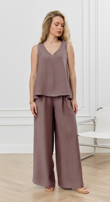 Брюки женские из гладкокрашеного фактурного полотна длинные, широкие по всей длине, на притачном поясе с эластичной тесьмой внутри, с карманами в боковых швах. Модным элементом является широкая подгибка нижних срезов.