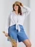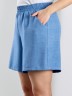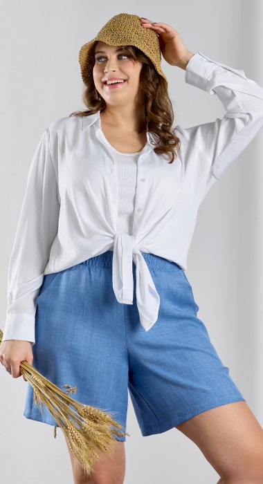 Шорты женские из гладкокрашеного тканого полотна, свободного покроя, средней длины, с карманами в боковых швах, на притачном поясе с эластичной тесьмой внутри.