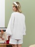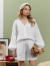 Шорты свободные, средней длины, с карманами в боковых швах, на поясе сиэластичной тесьмой внутри.