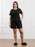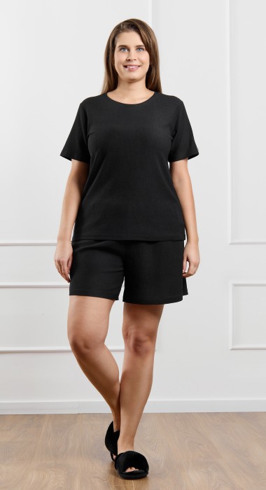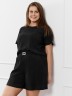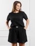 Шорты женские из гладкокрашенного трикотажного полотна «бурумчук», свободные, средней длины, с карманами в боковых швах, на притачном поясе с эластичной тесьмой внутри.