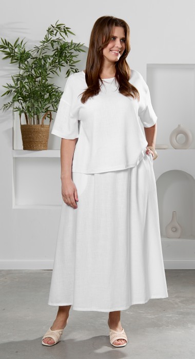 Юбка женская из гладкокрашеного тканого полотна, удлиненная, свободная, с карманами в боковых швах, на притачном поясе с эластичной тесьмой внутри.