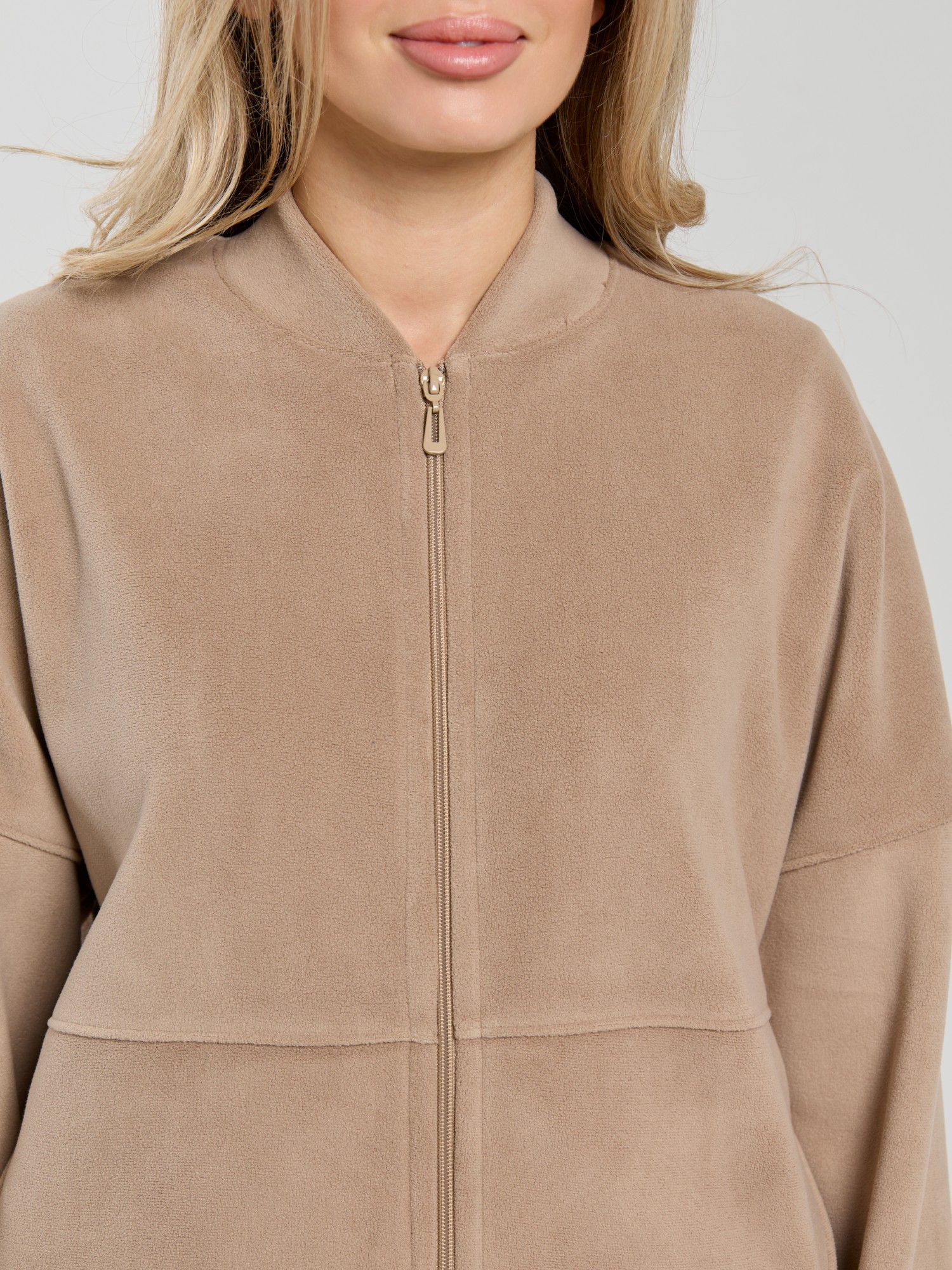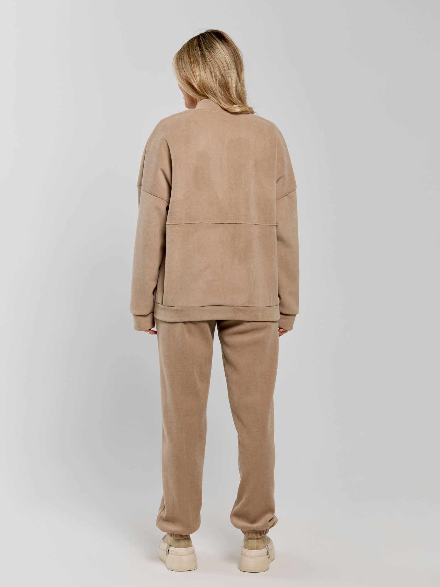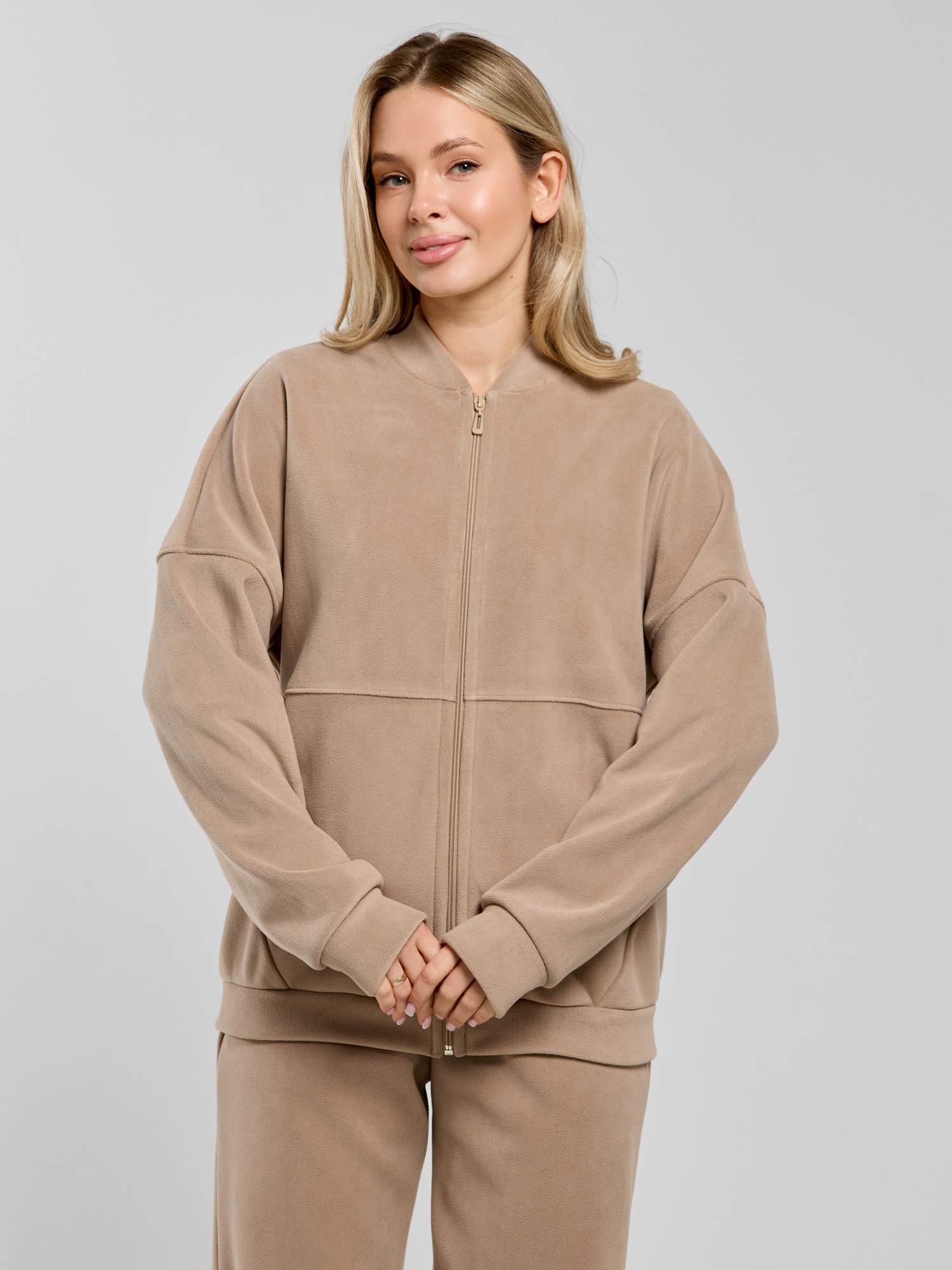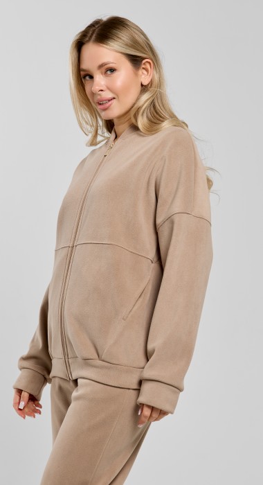 Куртка-бомбер – молодежная из гладкокрашенного трикотажного полотна «дабл-флис» (двухсторонний флис) прямого силуэта, свободная, с длинными втачными рукавами, горловиной овальной формы, обработанной втачной планкой, центральной бортовой застежкой на тесьму «молния». Полочка и спинка состоят из двух деталей, низ изделия с притачным поясом, рукава с притачными манжетами. Пояс, планка горловины, манжеты рукавов выполнены из основного материала.