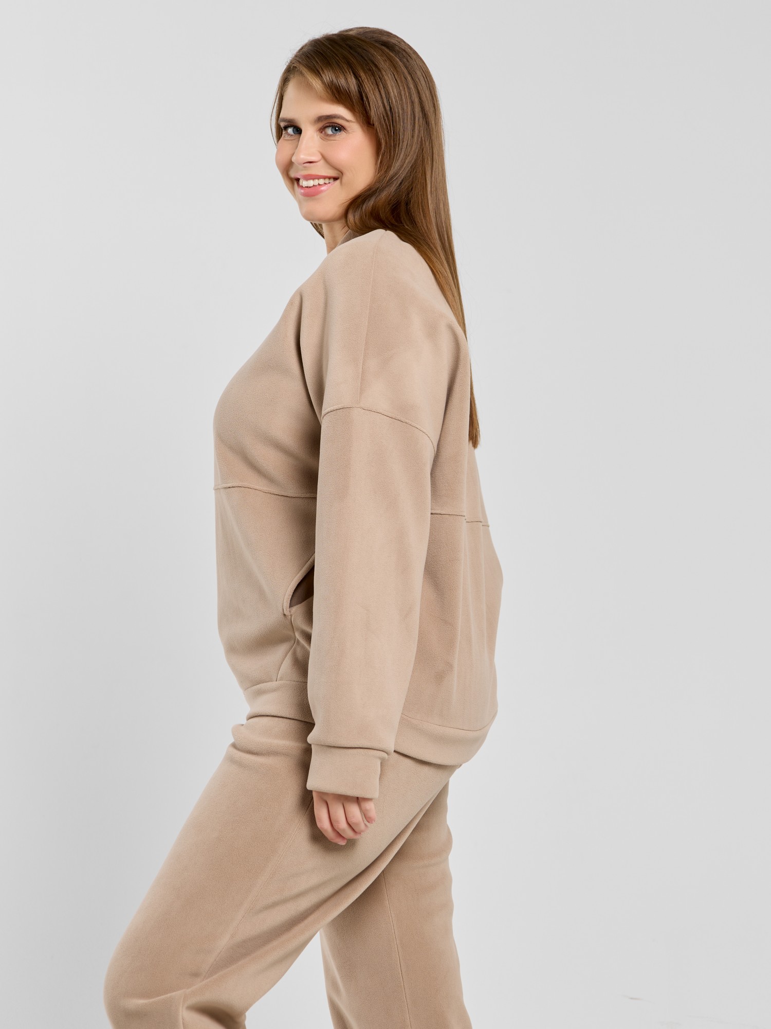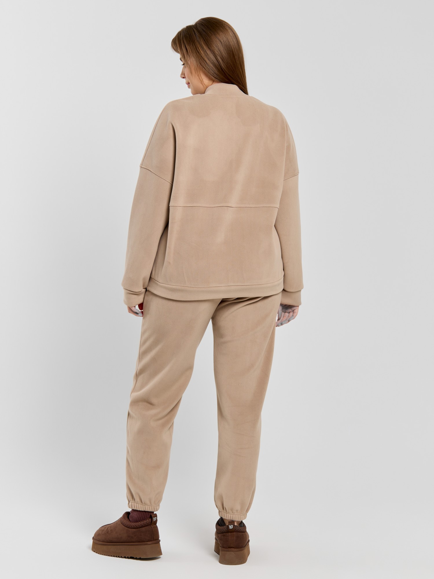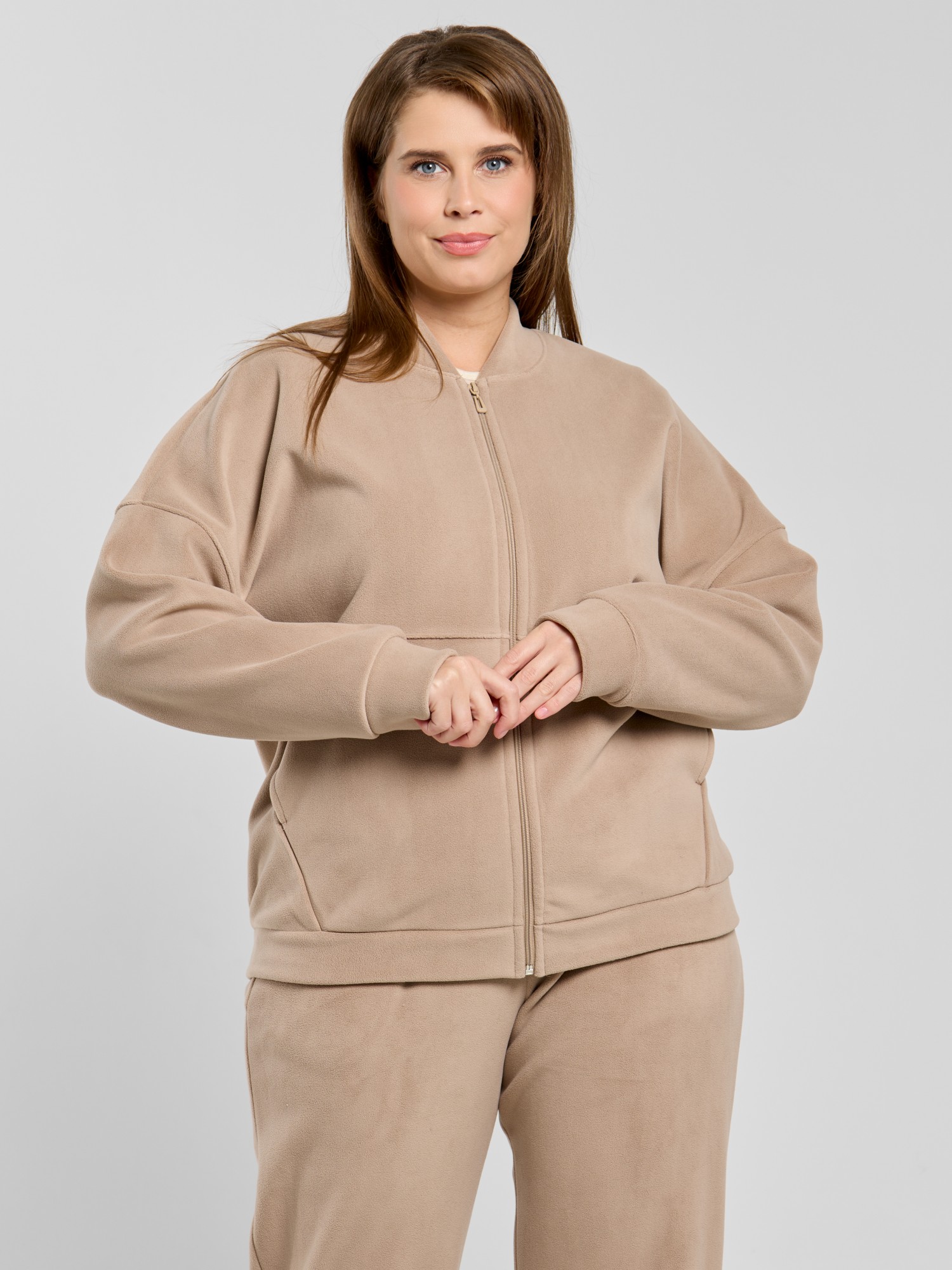 Куртка-бомбер – молодежная из гладкокрашенного трикотажного полотна «дабл-флис» (двухсторонний флис) прямого силуэта, свободная, с длинными втачными рукавами, горловиной овальной формы, обработанной втачной планкой, центральной бортовой застежкой на тесьму «молния». Полочка и спинка состоят из двух деталей, низ изделия с притачным поясом, рукава с притачными манжетами. Пояс, планка горловины, манжеты рукавов выполнены из основного материала.