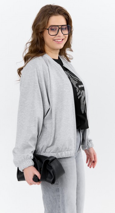 Куртка – бомбер женская из трикотажного гладкокрашенного полотна «скуба» свободная, с горловиной овальной формы обработанной втачной планкой, длинными рукавами кроя «реглан», обработанными подгибкой с эластичной тесьмой внутри, центральной бортовой застежкой на тесьму «молния». На полочке в рельефных швах выполнены карманы. Низ изделия обработан подгибкой с широкой эластичной тесьмой внутри.