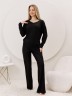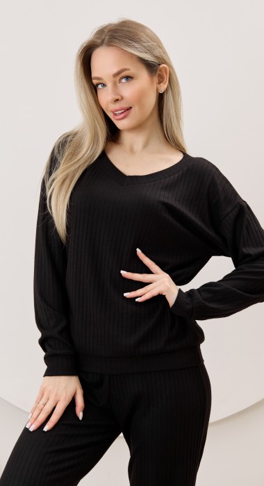 Джемпер женский из гладкокрашенного трикотажного фактурного полотна в «рубчик» с добавлением ангоры, классического покроя, с расширенной V-образной горловиной, обработанной втачной планкой, длинными втачными рукавами. Низ изделия обработан притачным поясом, рукава с манжетами.