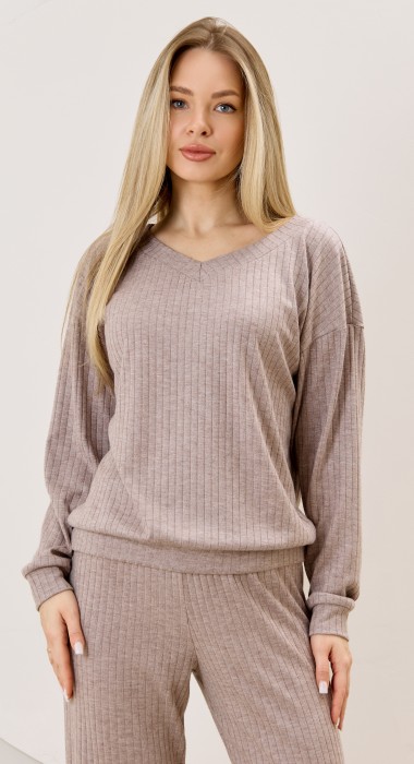 Джемпер женский из гладкокрашенного трикотажного фактурного полотна в «рубчик» с добавлением ангоры, классического покроя, с расширенной V-образной горловиной, обработанной втачной планкой, длинными втачными рукавами. Низ изделия обработан притачным поясом, рукава с манжетами.