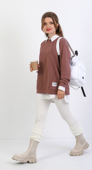 Джемпер молодежный из трикотажного полотна «футер» трехнитка-петля со спущенным плечом, длинными рукавами и горловиной овальной формы, обработанной втачной планкой. На полочке выполнены четыре ассиметричные отделочные строчки. Рукава – с манжетами, низ изделия на притачном поясе, с левой стороны настрочен декоративный элемент.
