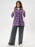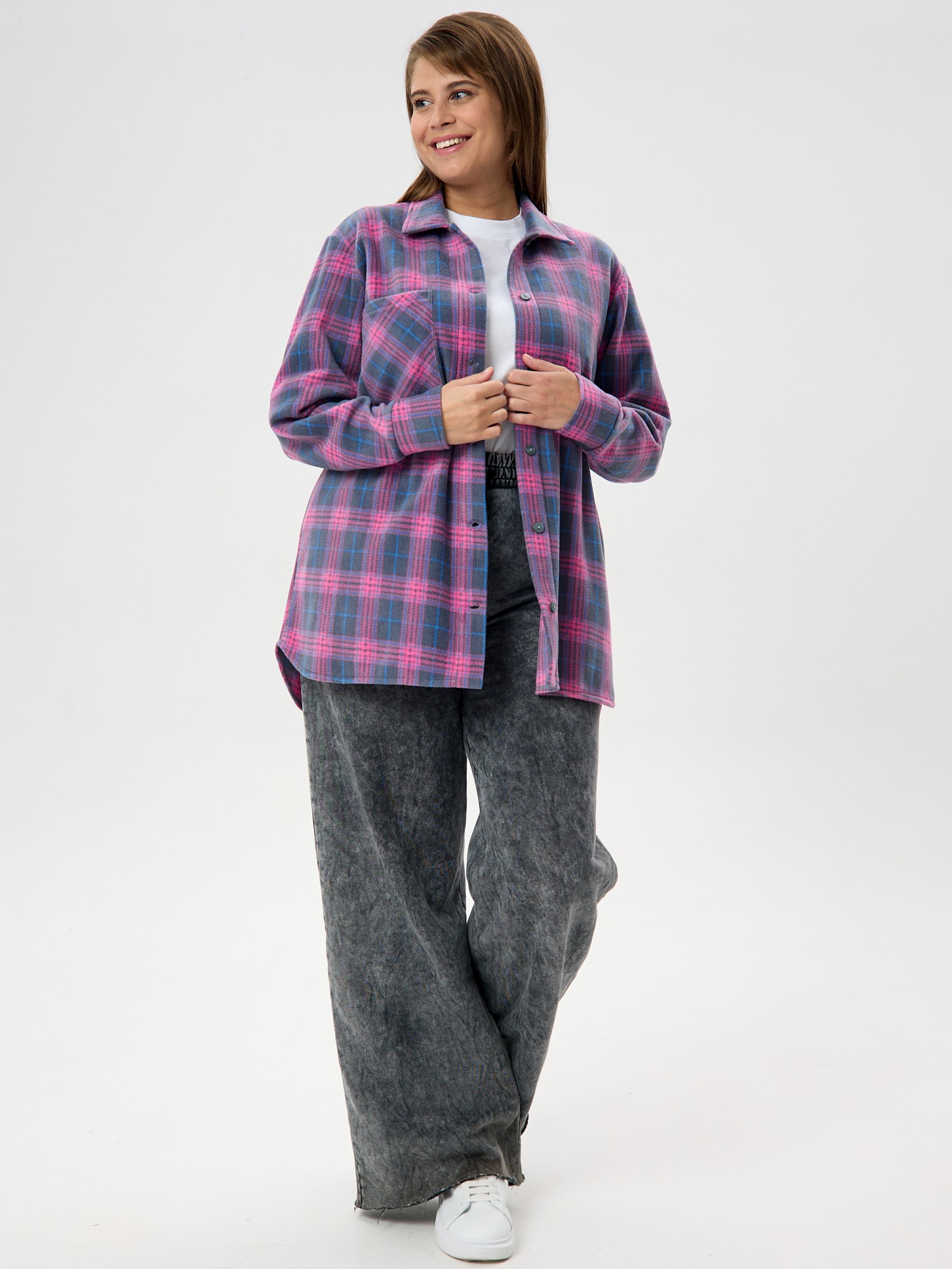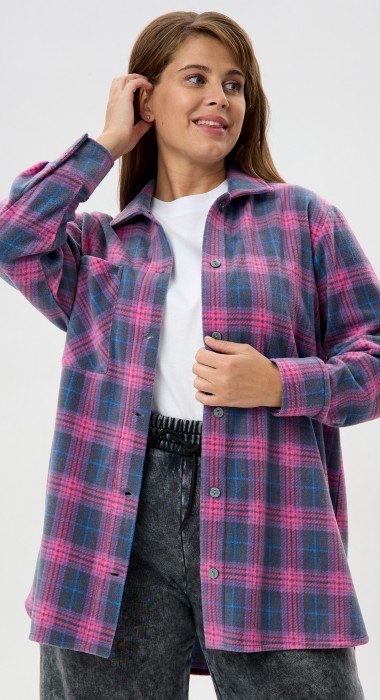 Рубашка (туника) женская из трикотажного полотна «флис» с набивным рисунком «клетка», свободного силуэта, с длинными втачными рукавами напритачных манжетах, стояче-отложным воротником, нагрудным карманом,фигурным низом и центральной бортовой застежкой на петли и пуговицы. Спинка – с отрезной кокеткой и бантовой складкой в центре соединительного шва.