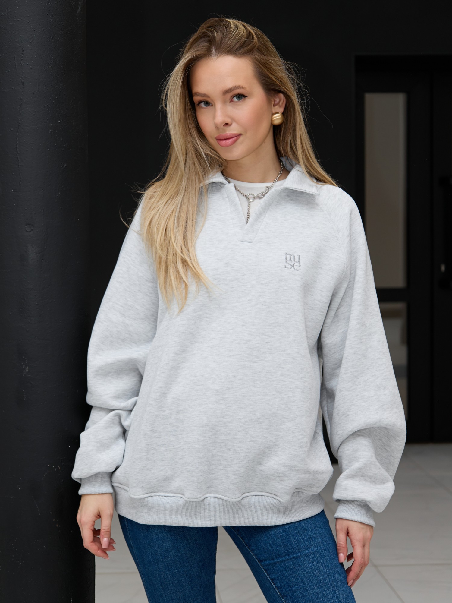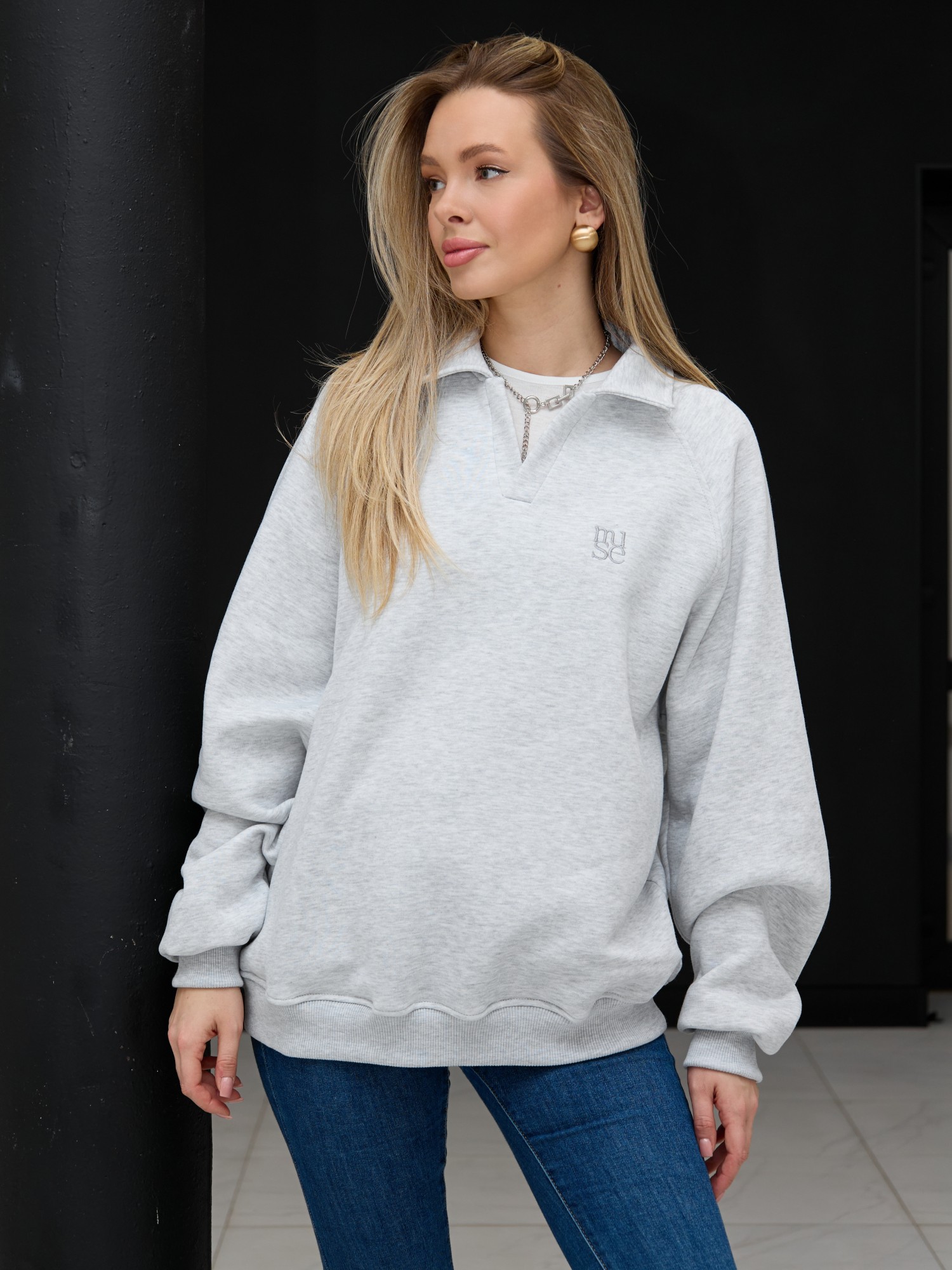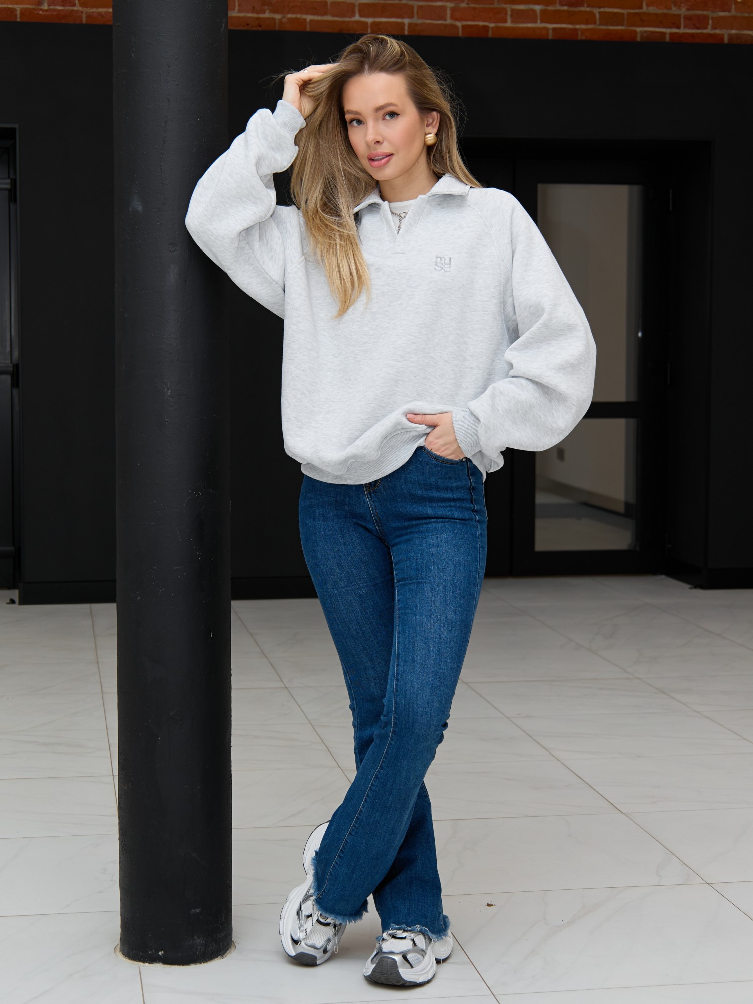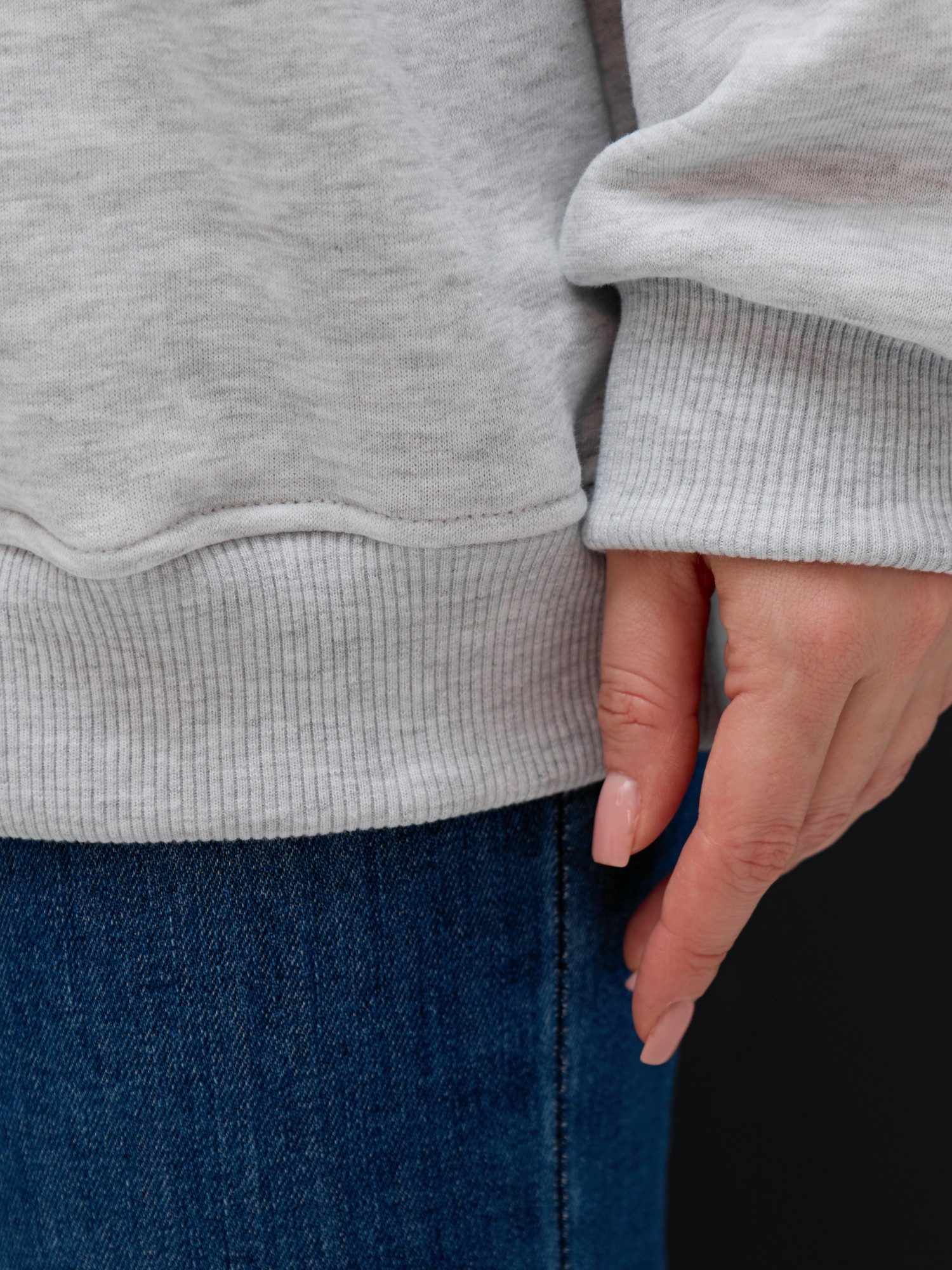 Толстовка женская из трикотажного полотна "кармеланж" с отделкой из полотна "кашкорсе", оверсайз, с рукавами покроя "реглан", стояче-отложным воротником и V-образным вырезом горловины, обработаннм втачными планками и вышивкой на детали переда. Притачной пояс по низу изделия и манжеты рукавов выполнены из полотна "кашкорсе" в цвет основого материала. По воротнику, швам реглана и шву притачивания пояса настрочены отделочные строчки.