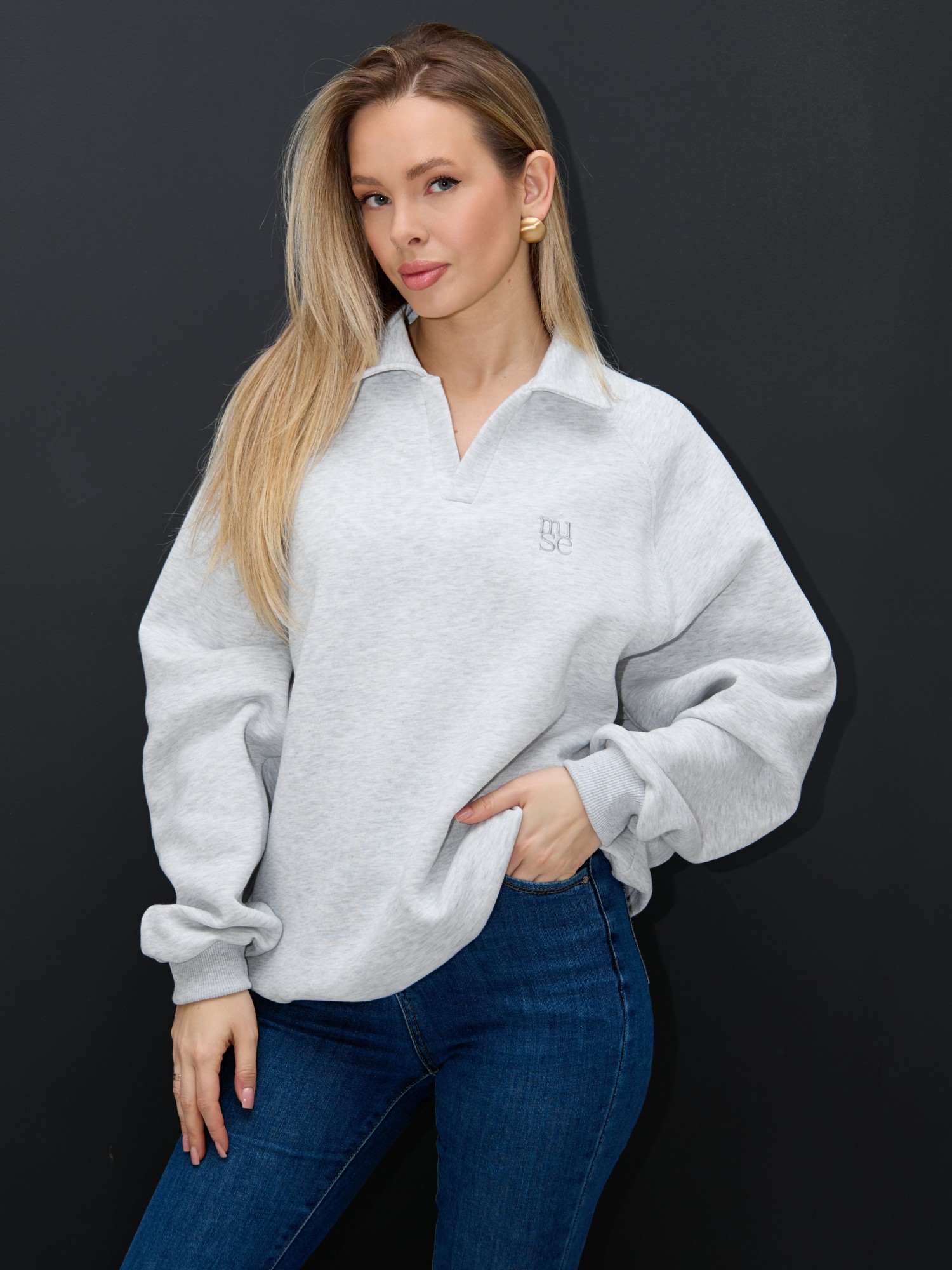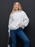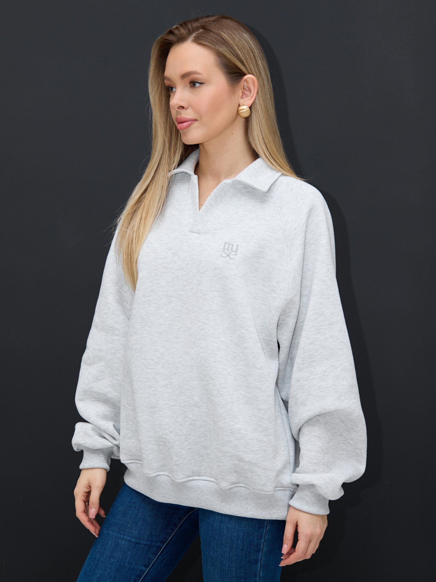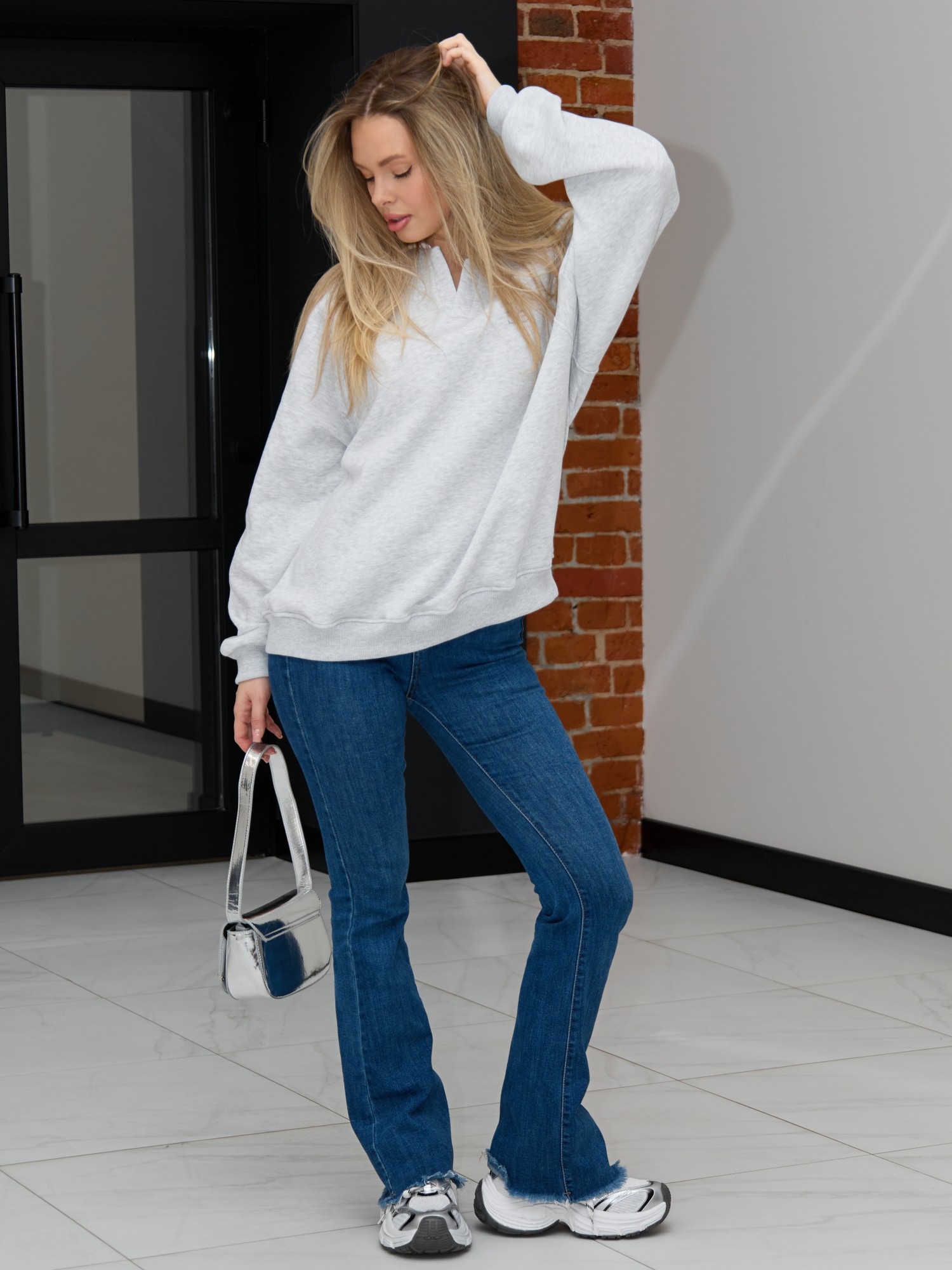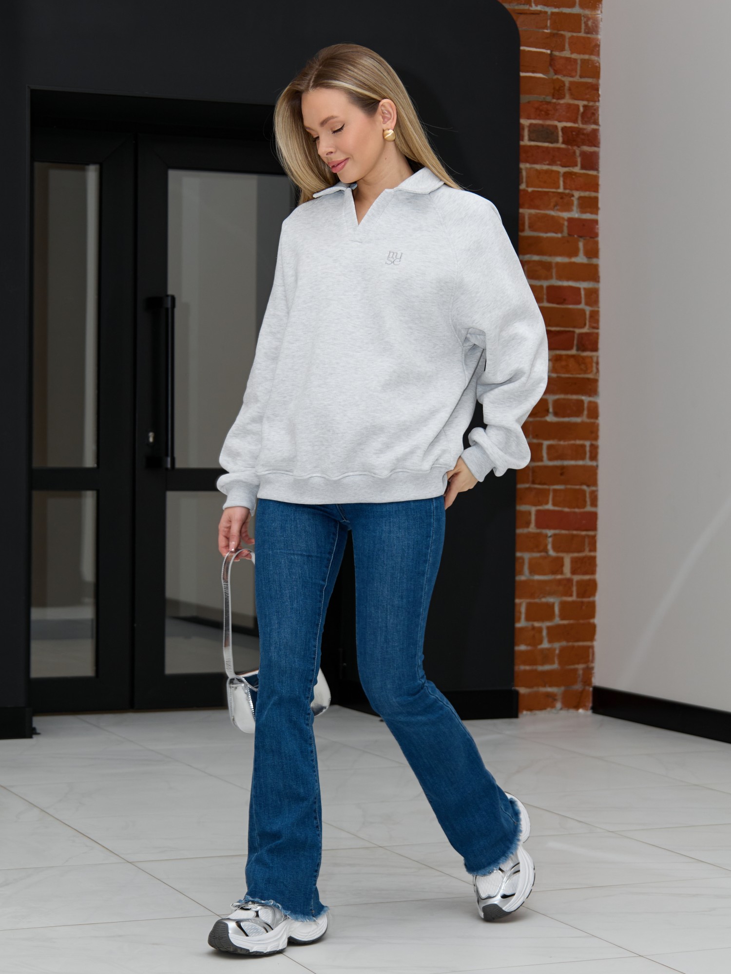 Толстовка женская из трикотажного полотна "кармеланж" с отделкой из полотна "кашкорсе", оверсайз, с рукавами покроя "реглан", стояче-отложным воротником и V-образным вырезом горловины, обработаннм втачными планками и вышивкой на детали переда. Притачной пояс по низу изделия и манжеты рукавов выполнены из полотна "кашкорсе" в цвет основого материала. По воротнику, швам реглана и шву притачивания пояса настрочены отделочные строчки.