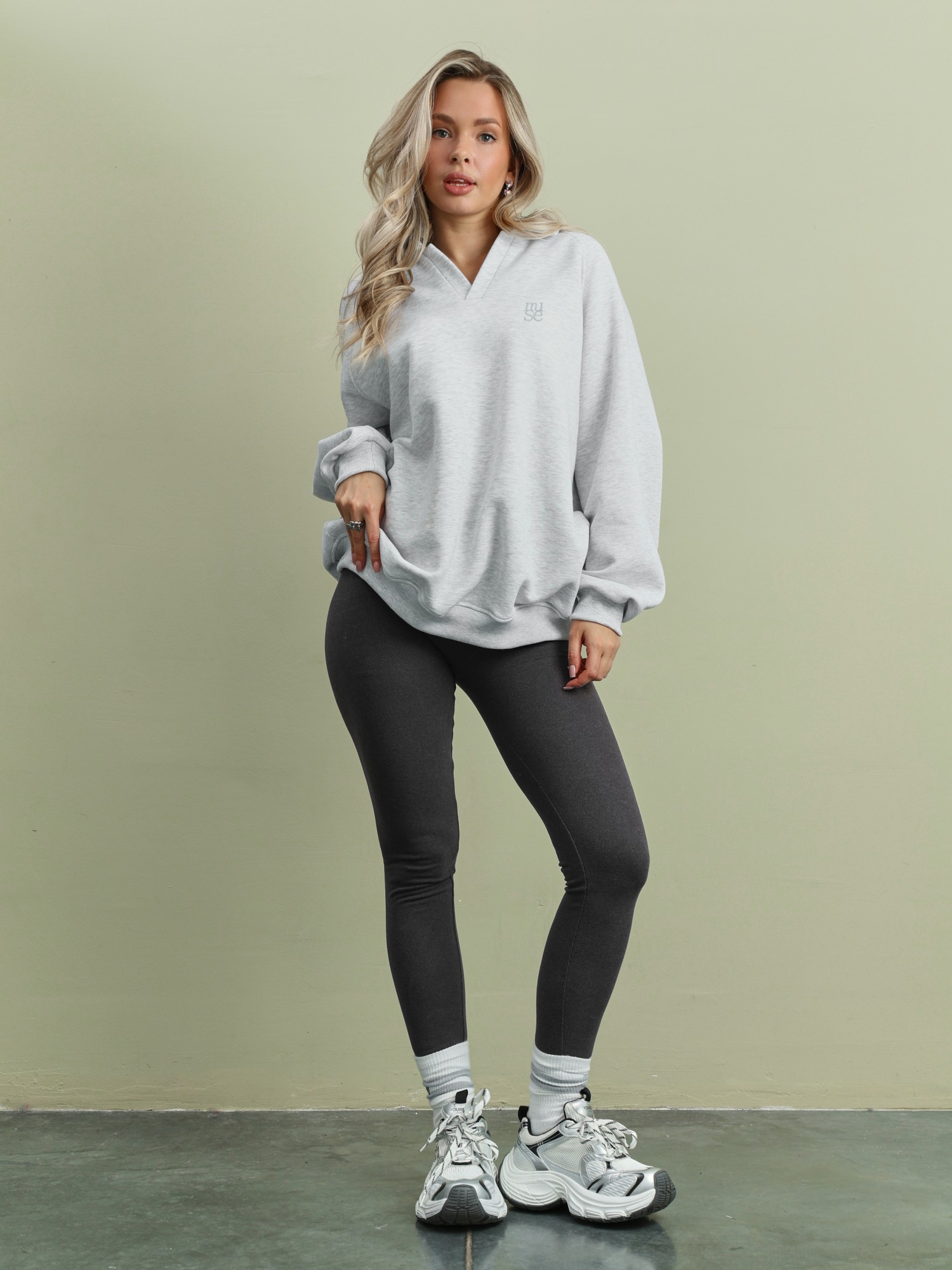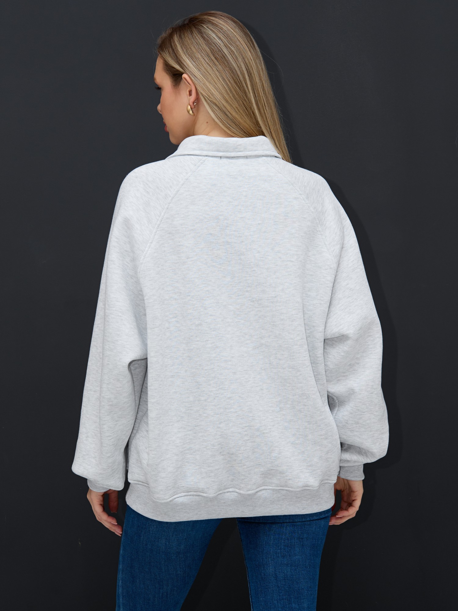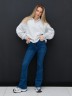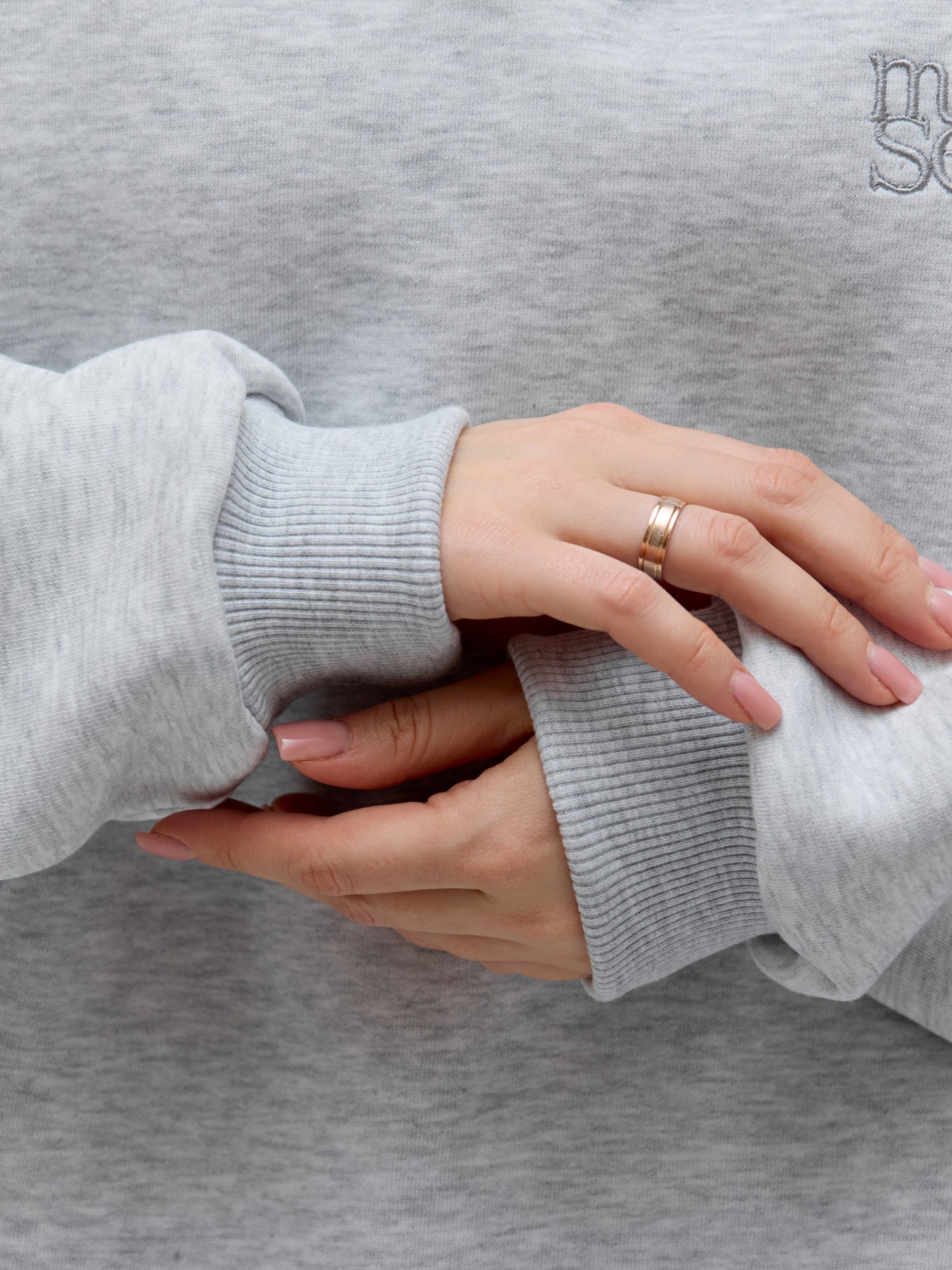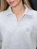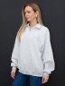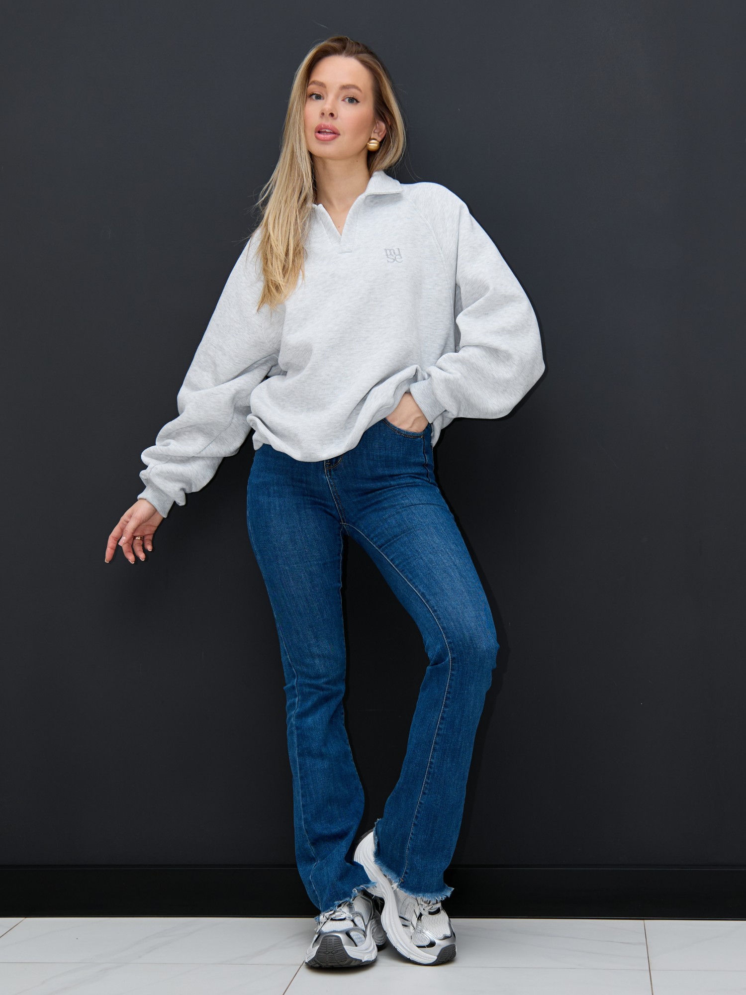 Толстовка женская из трикотажного полотна "кармеланж" с отделкой из полотна "кашкорсе", оверсайз, с рукавами покроя "реглан", стояче-отложным воротником и V-образным вырезом горловины, обработаннм втачными планками и вышивкой на детали переда. Притачной пояс по низу изделия и манжеты рукавов выполнены из полотна "кашкорсе" в цвет основого материала. По воротнику, швам реглана и шву притачивания пояса настрочены отделочные строчки.