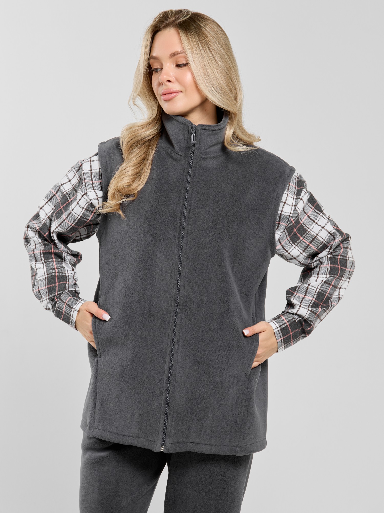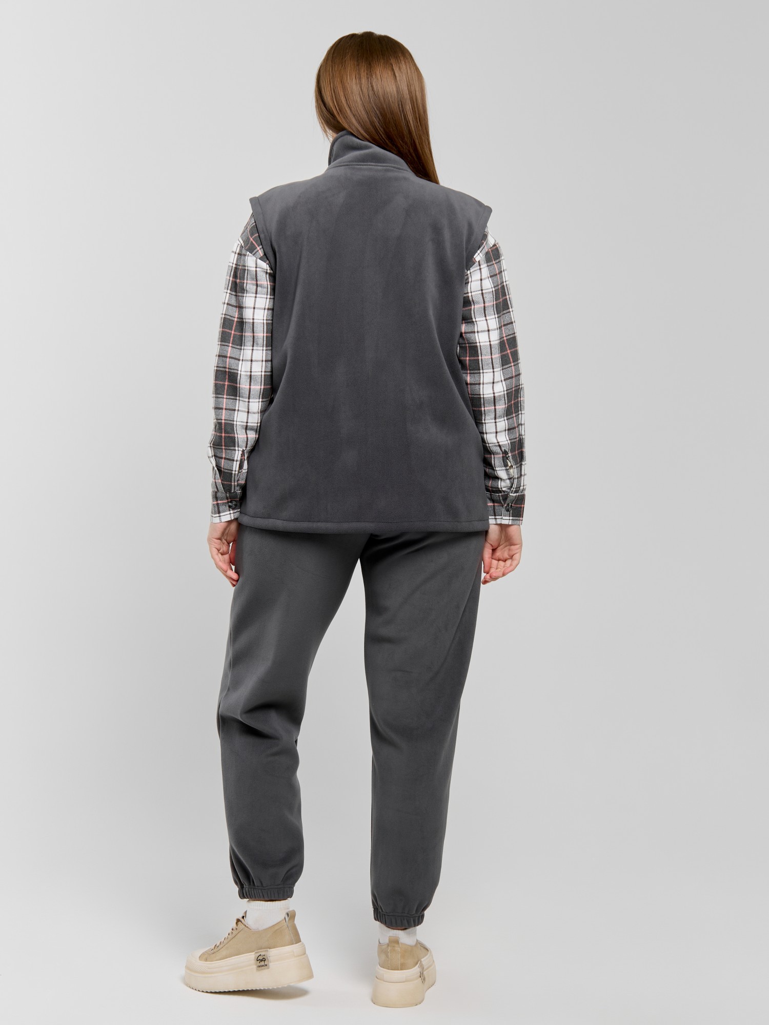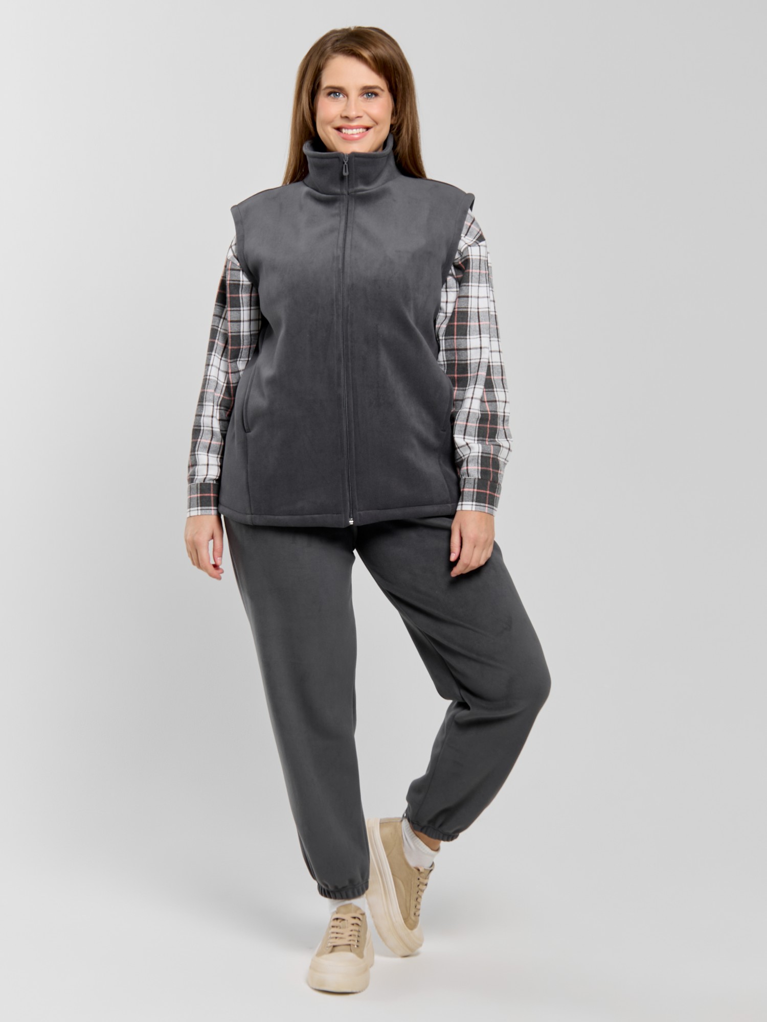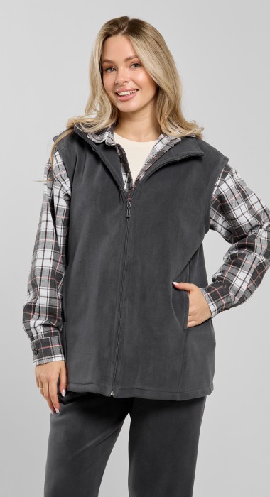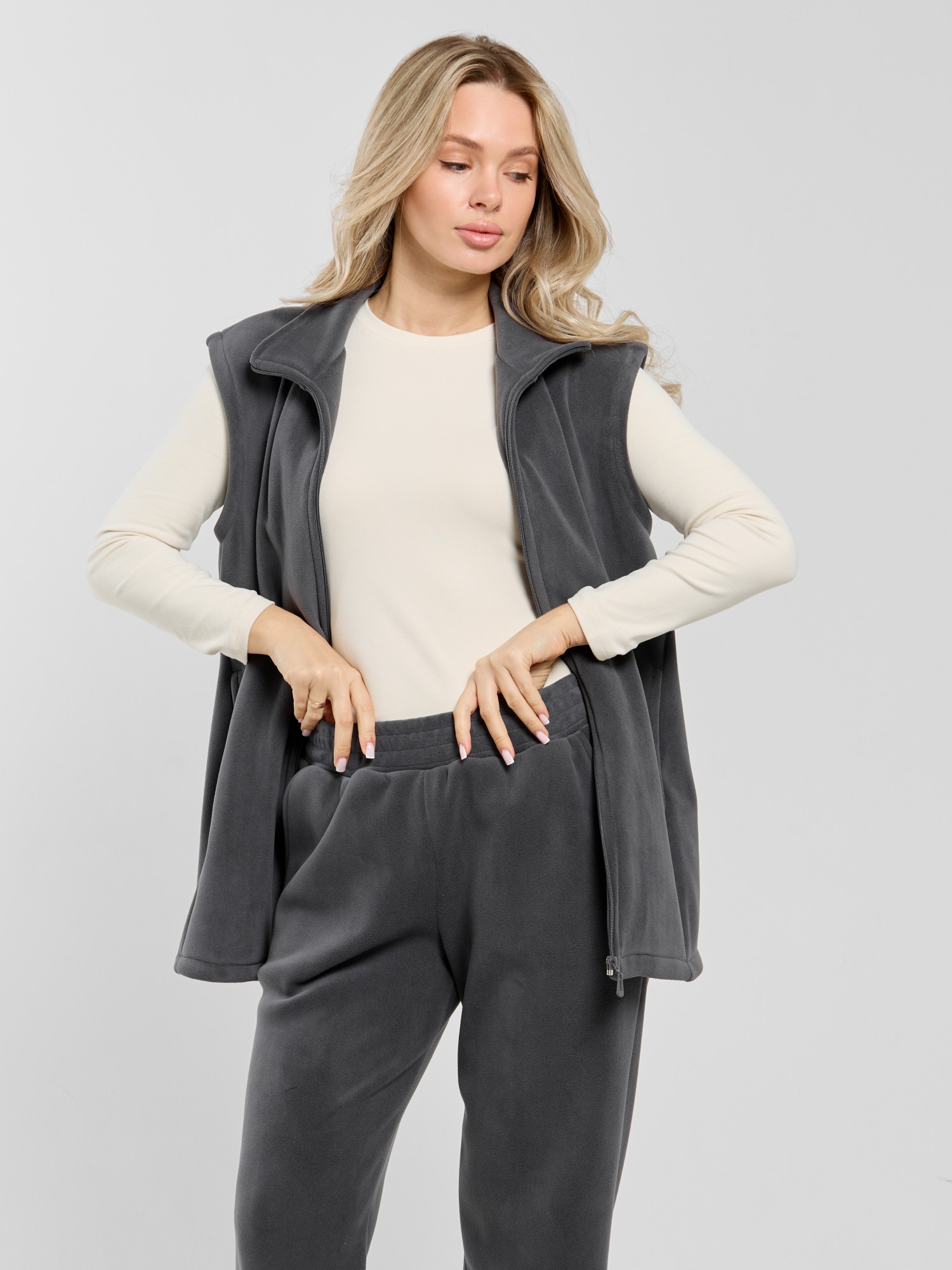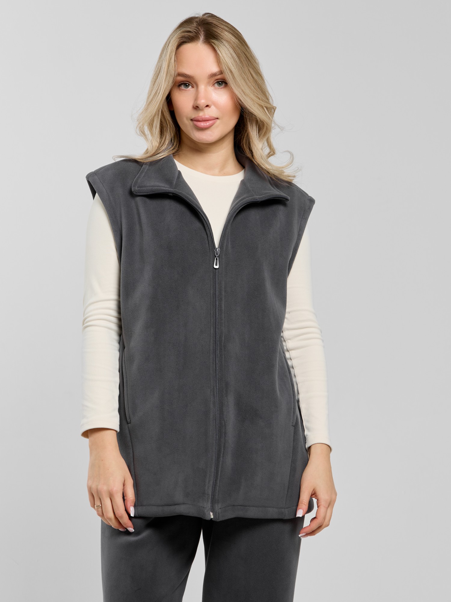 Жилет молодежный из трикотажного полотна «дабл-флис» (двухсторонний флис), прямого силуэта, с воротником «стойка», центральной бортовой застежкой на тесьму «молния». Для создания диагональных линий боковые швы переведены на полочку и оформлены в рельефные швы, в которых обработаны карманы.