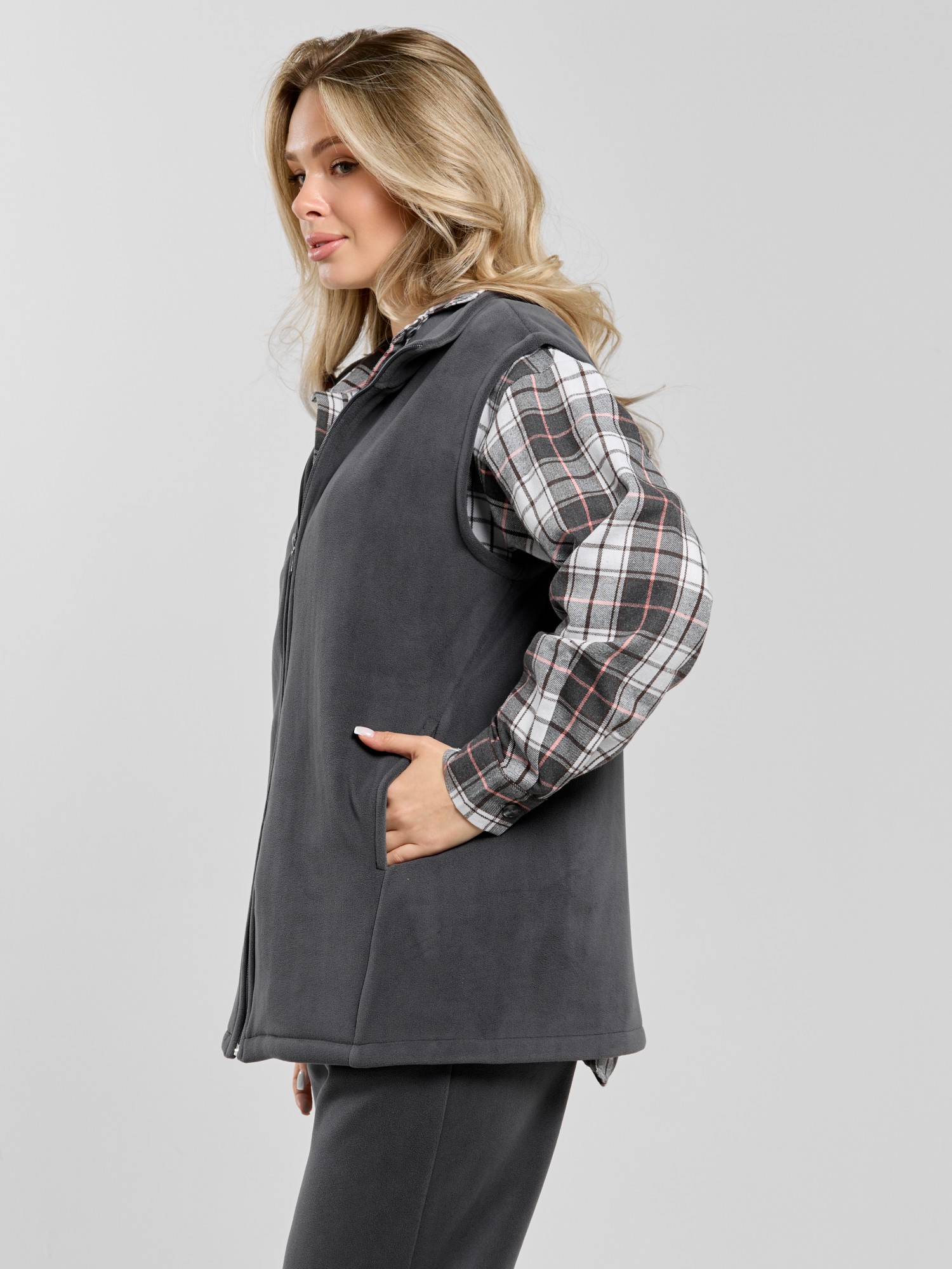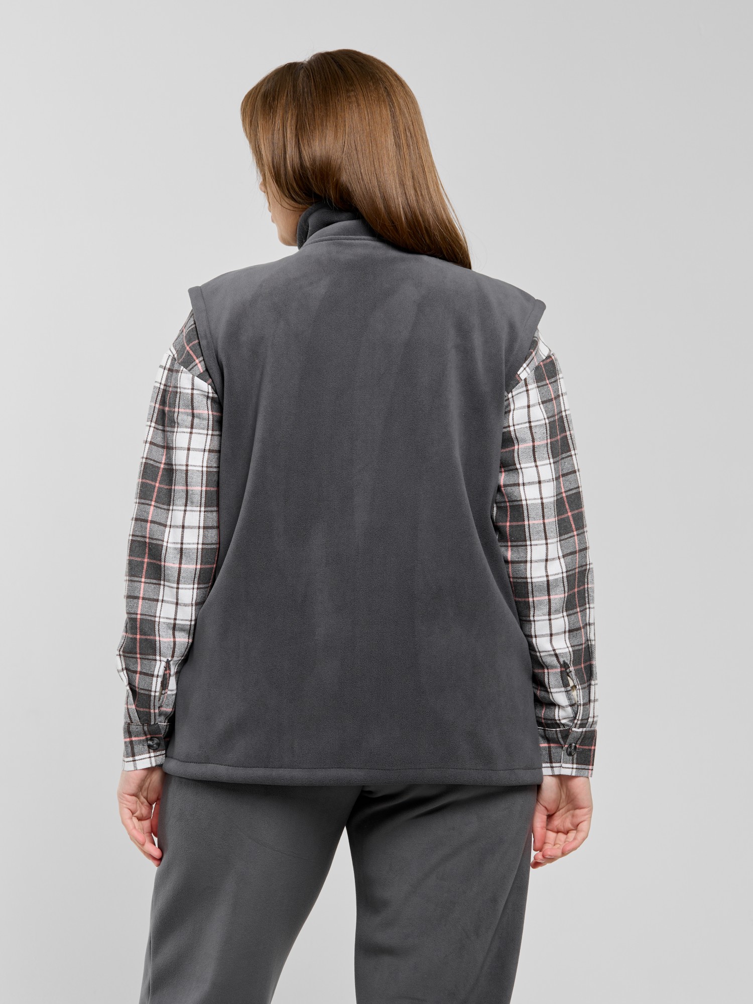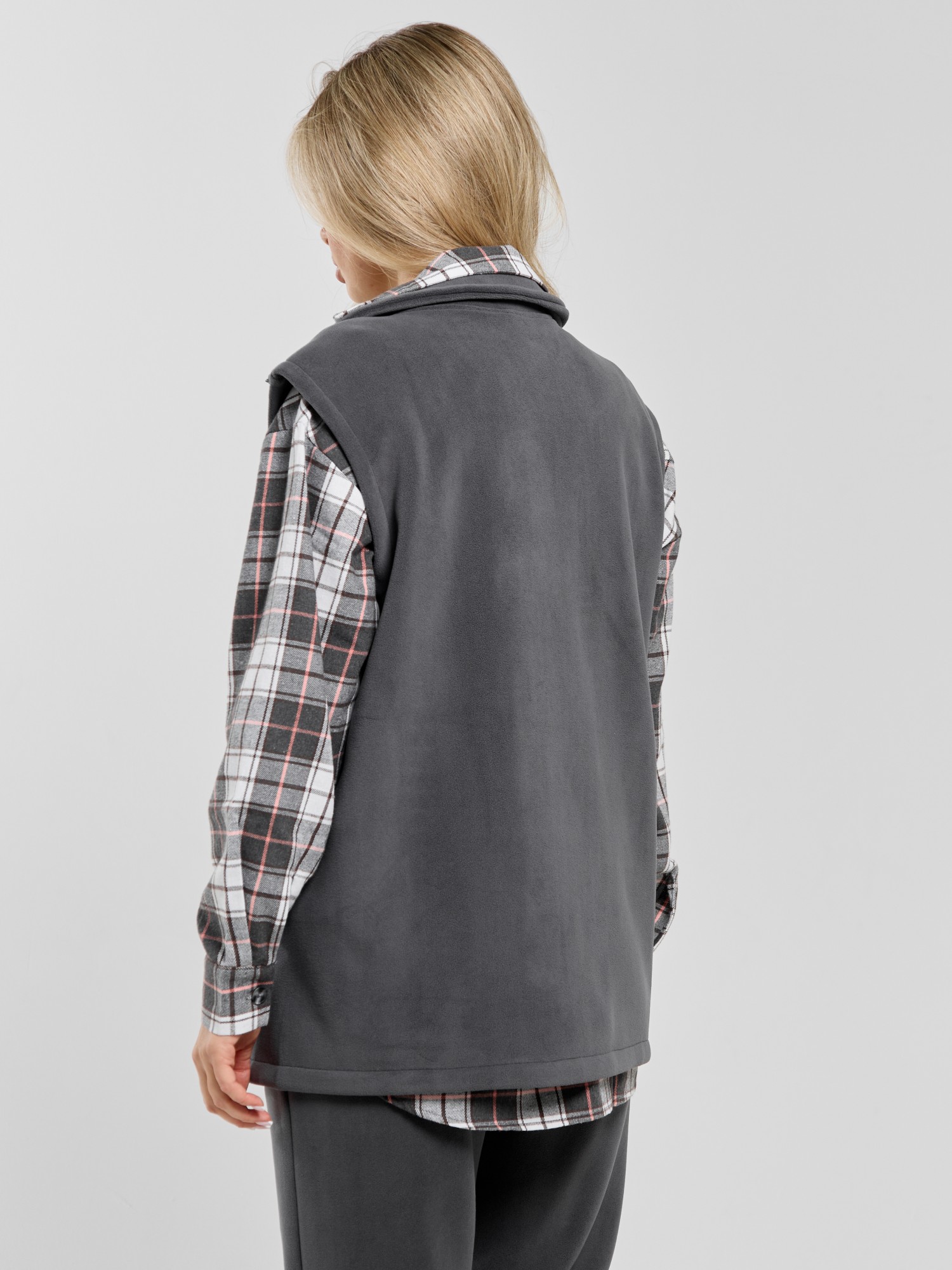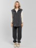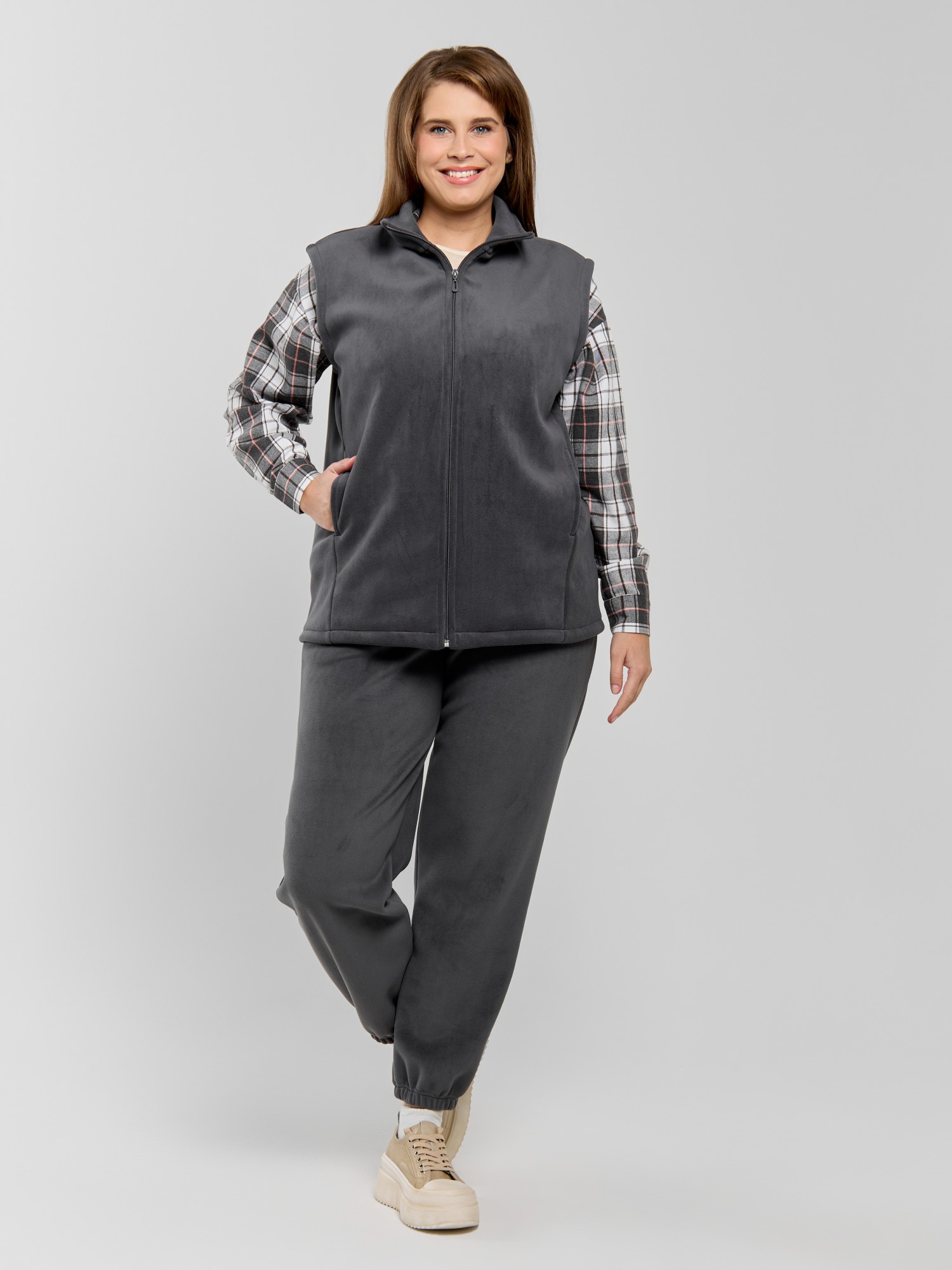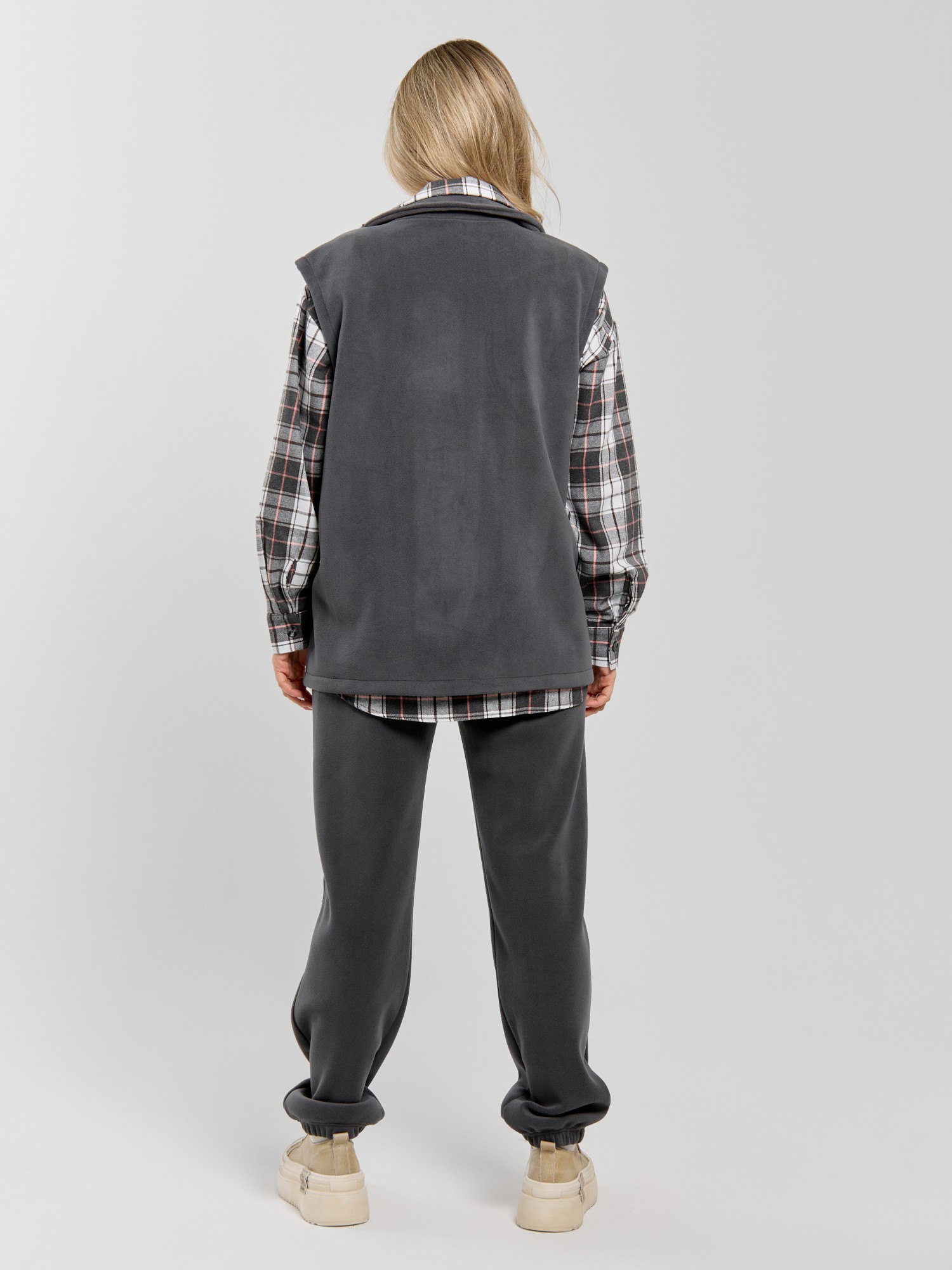 Жилет молодежный из трикотажного полотна «дабл-флис» (двухсторонний флис), прямого силуэта, с воротником «стойка», центральной бортовой застежкой на тесьму «молния». Для создания диагональных линий боковые швы переведены на полочку и оформлены в рельефные швы, в которых обработаны карманы.