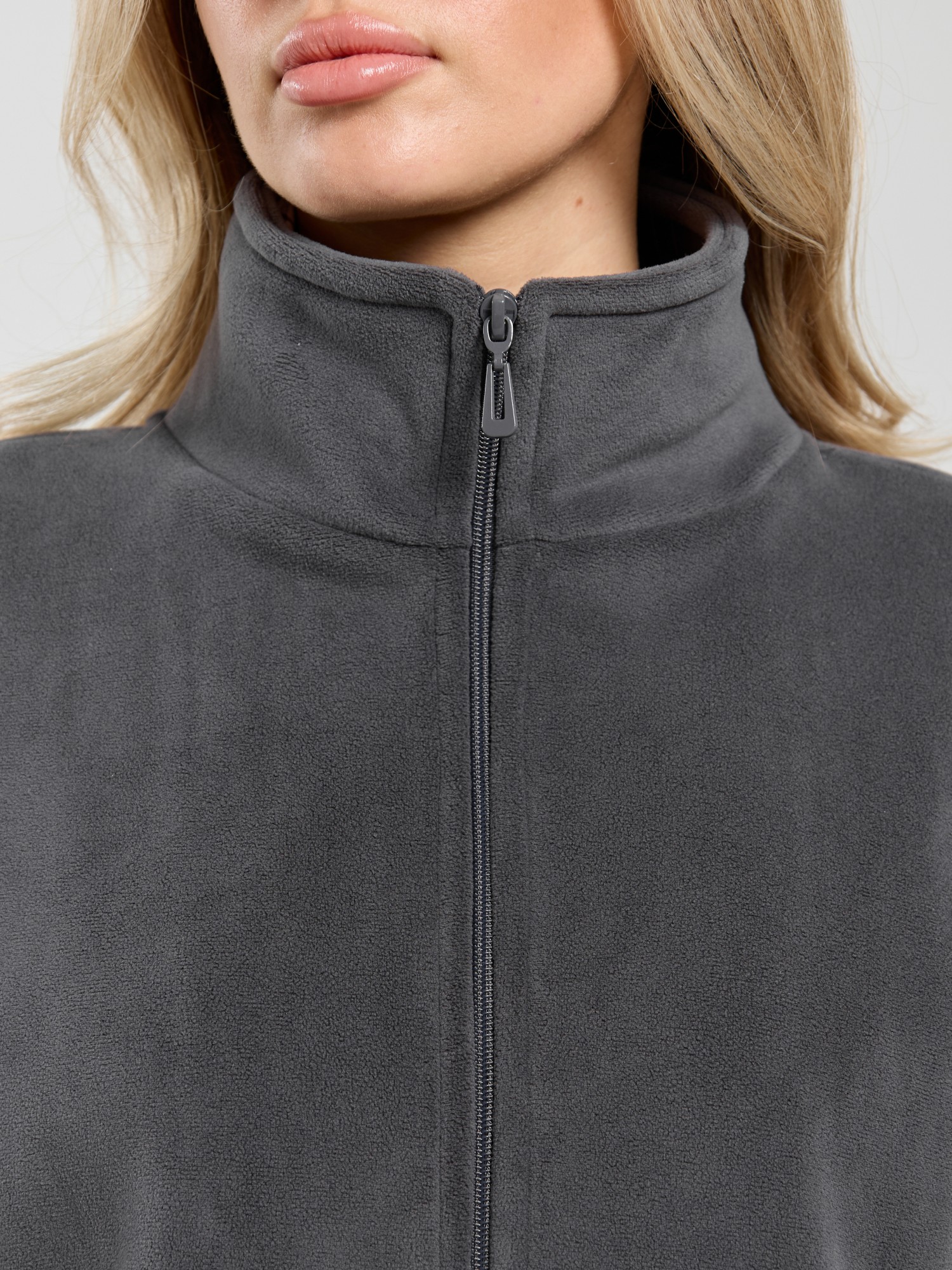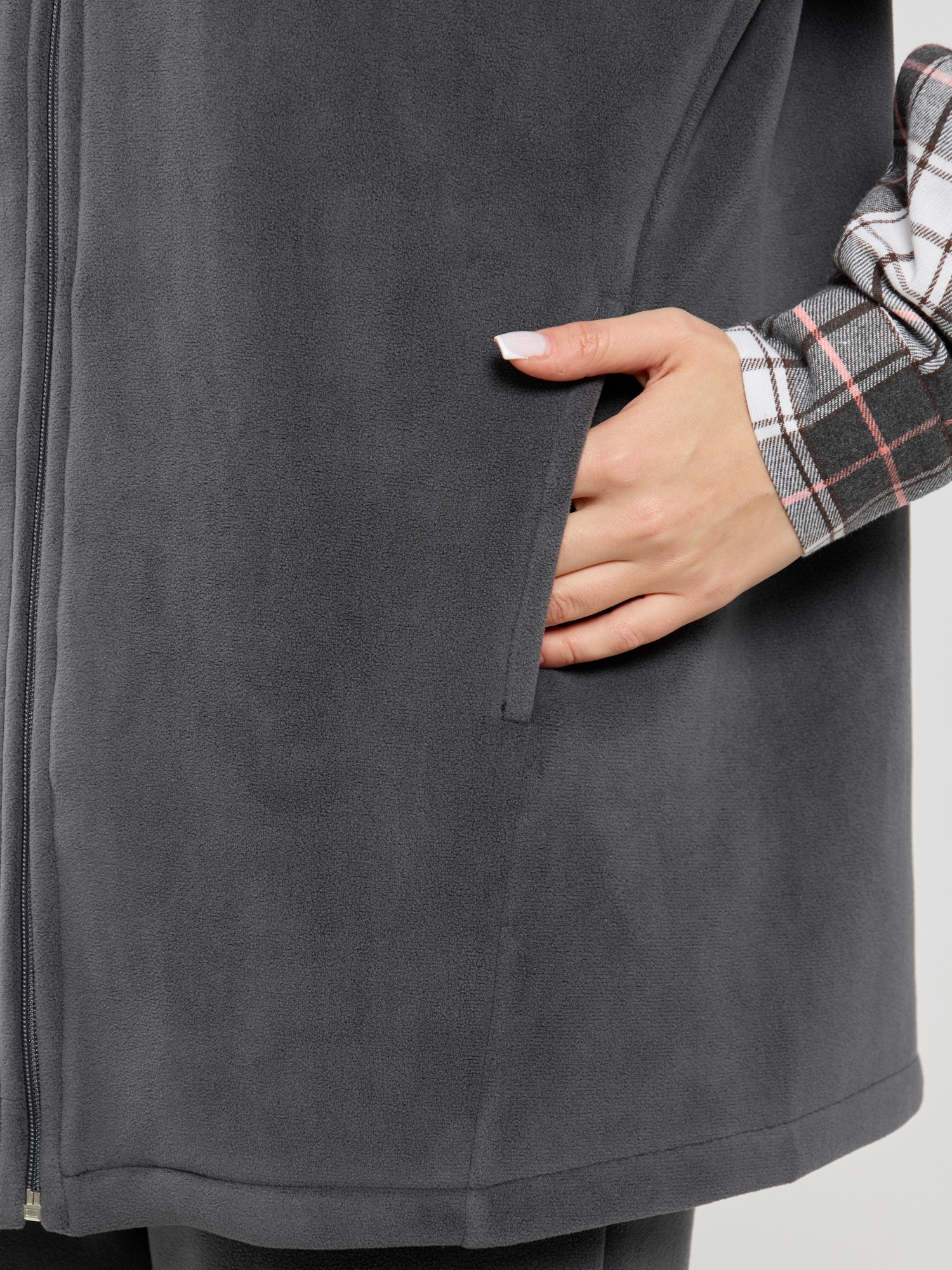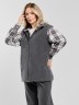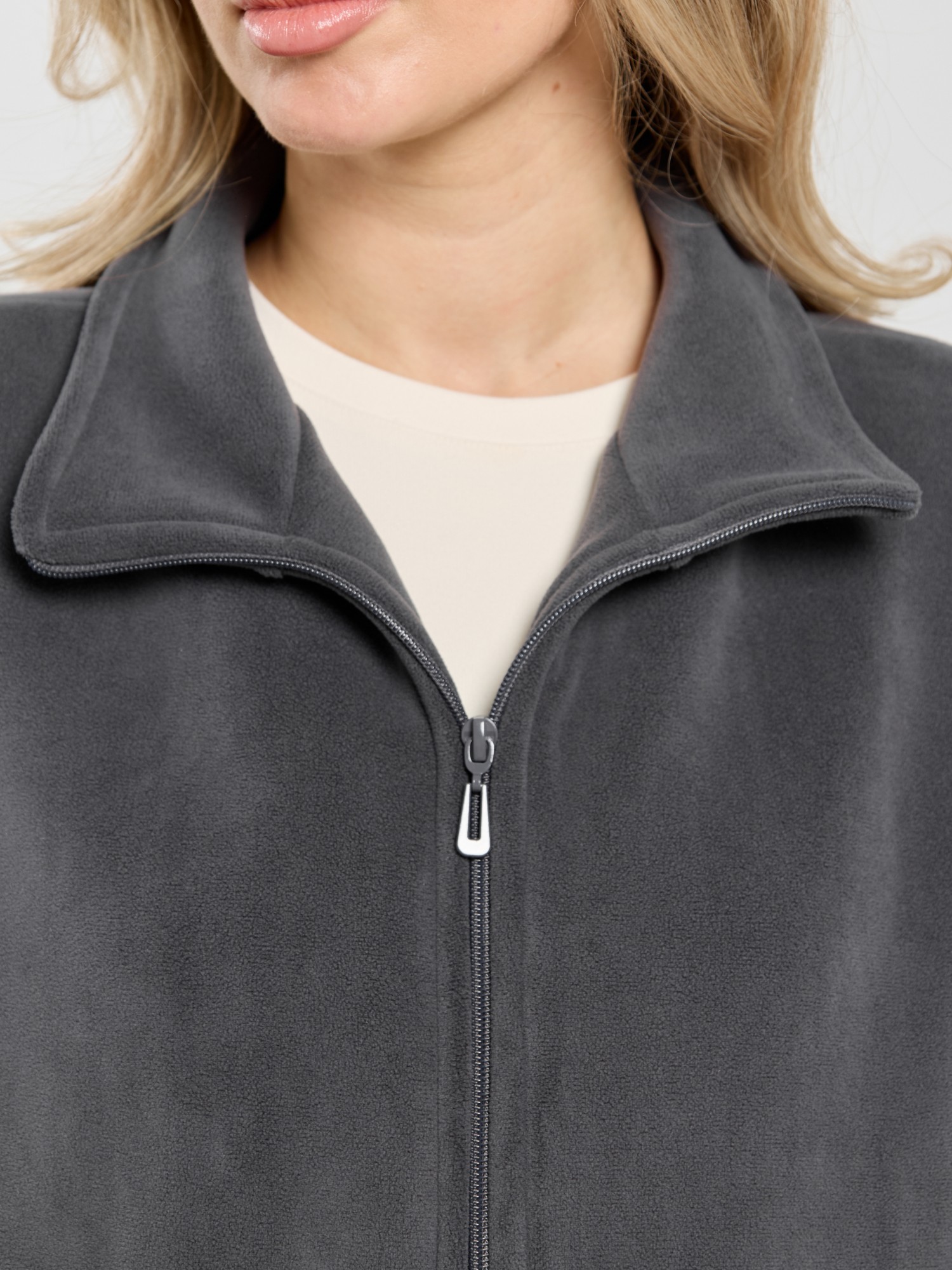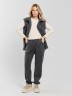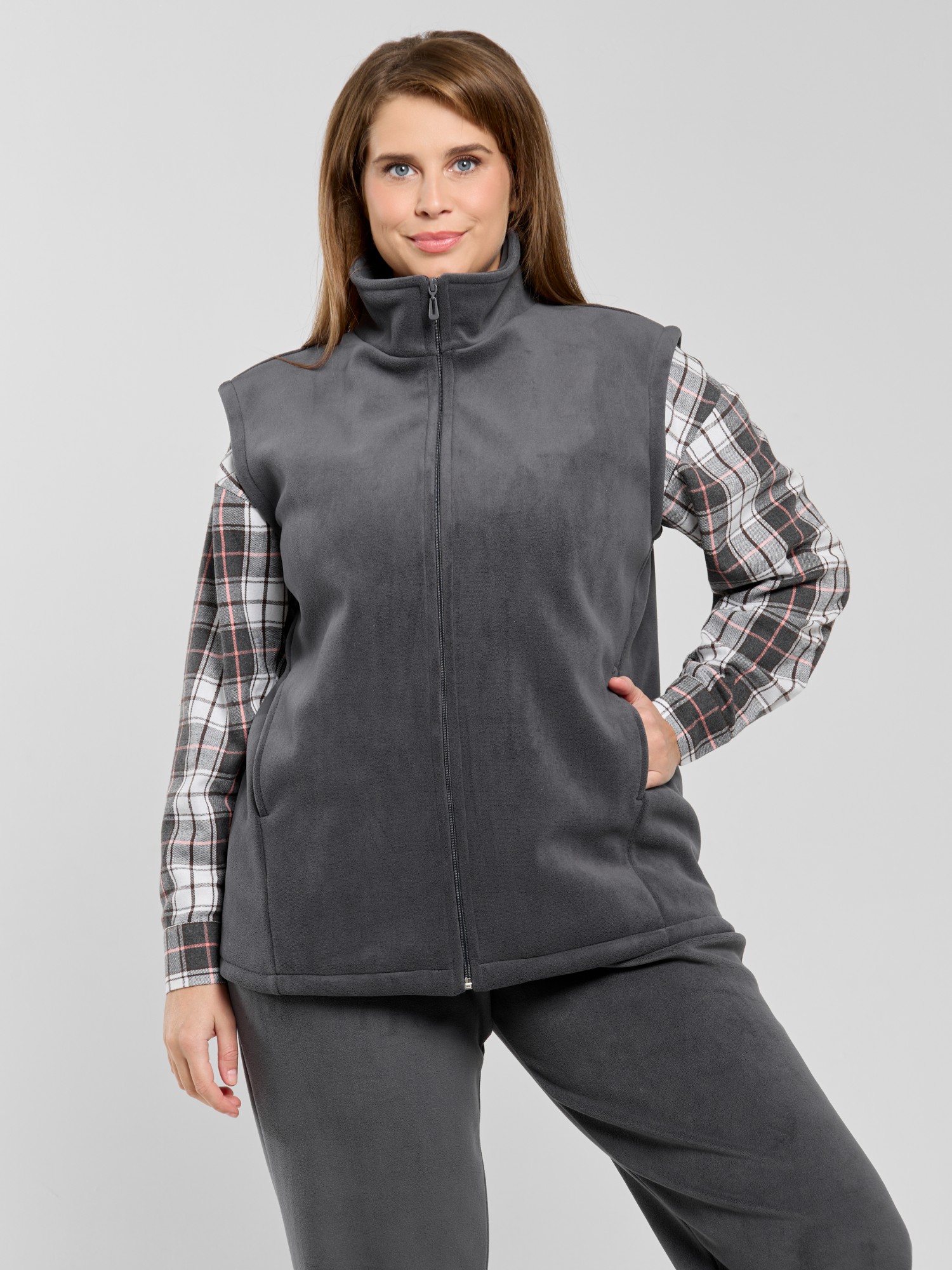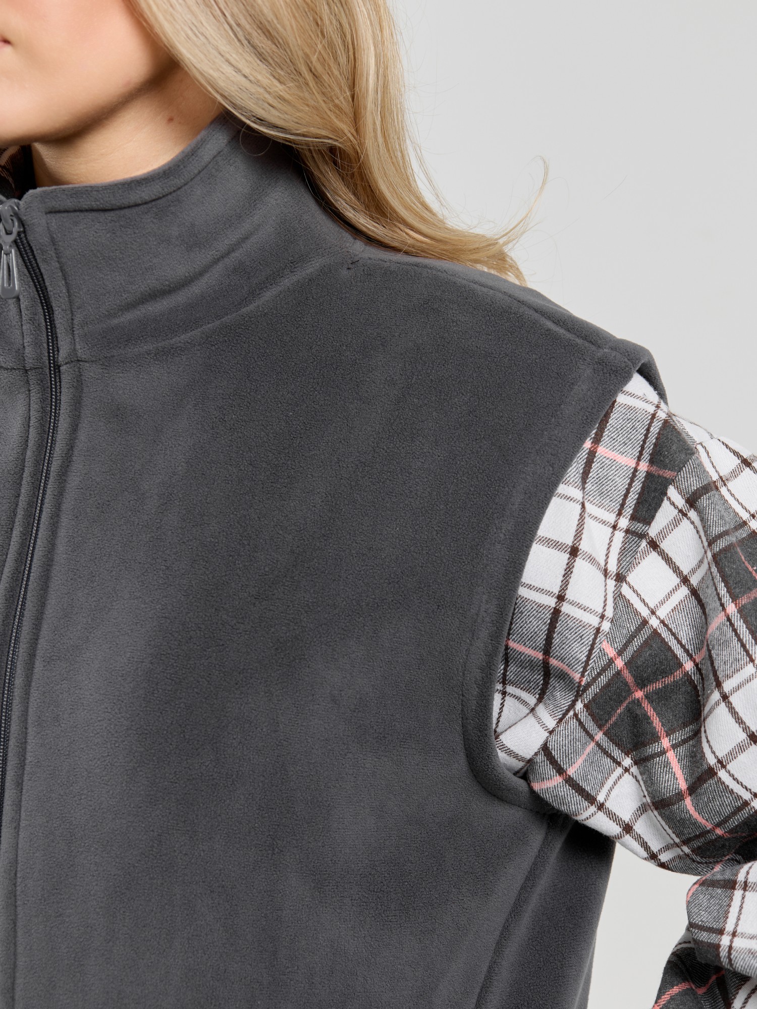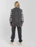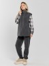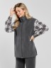 Жилет молодежный из трикотажного полотна «дабл-флис» (двухсторонний флис), прямого силуэта, с воротником «стойка», центральной бортовой застежкой на тесьму «молния». Для создания диагональных линий боковые швы переведены на полочку и оформлены в рельефные швы, в которых обработаны карманы.