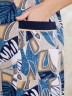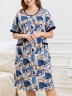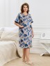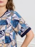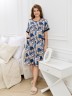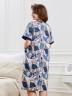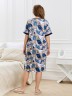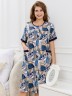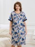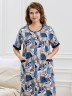 Халат женский из трикотажного полотна «кулирка» с набивным рисунком, прямого силуэта, с короткими втачными рукавами, с горловиной овальной формы, окантованной основным материалом, с рельефами, выходящими из пройм, двумя накладными карманами на уровне бедер и центральной бортовой застежкой на обметанные петли и пуговицы. Нижние срезы рукавов обработаны притачными манжетами, верхние срезы карманов – с притачными планками. В швах соединения манжет и планок с деталями – узкий кант контрастного цвета.
