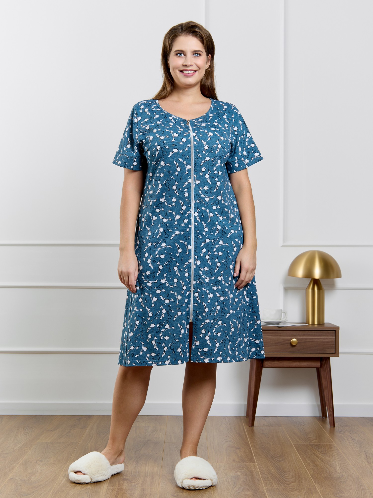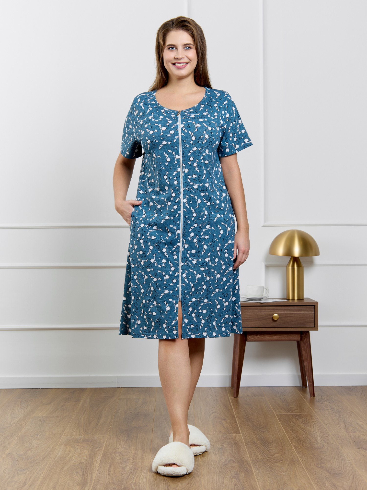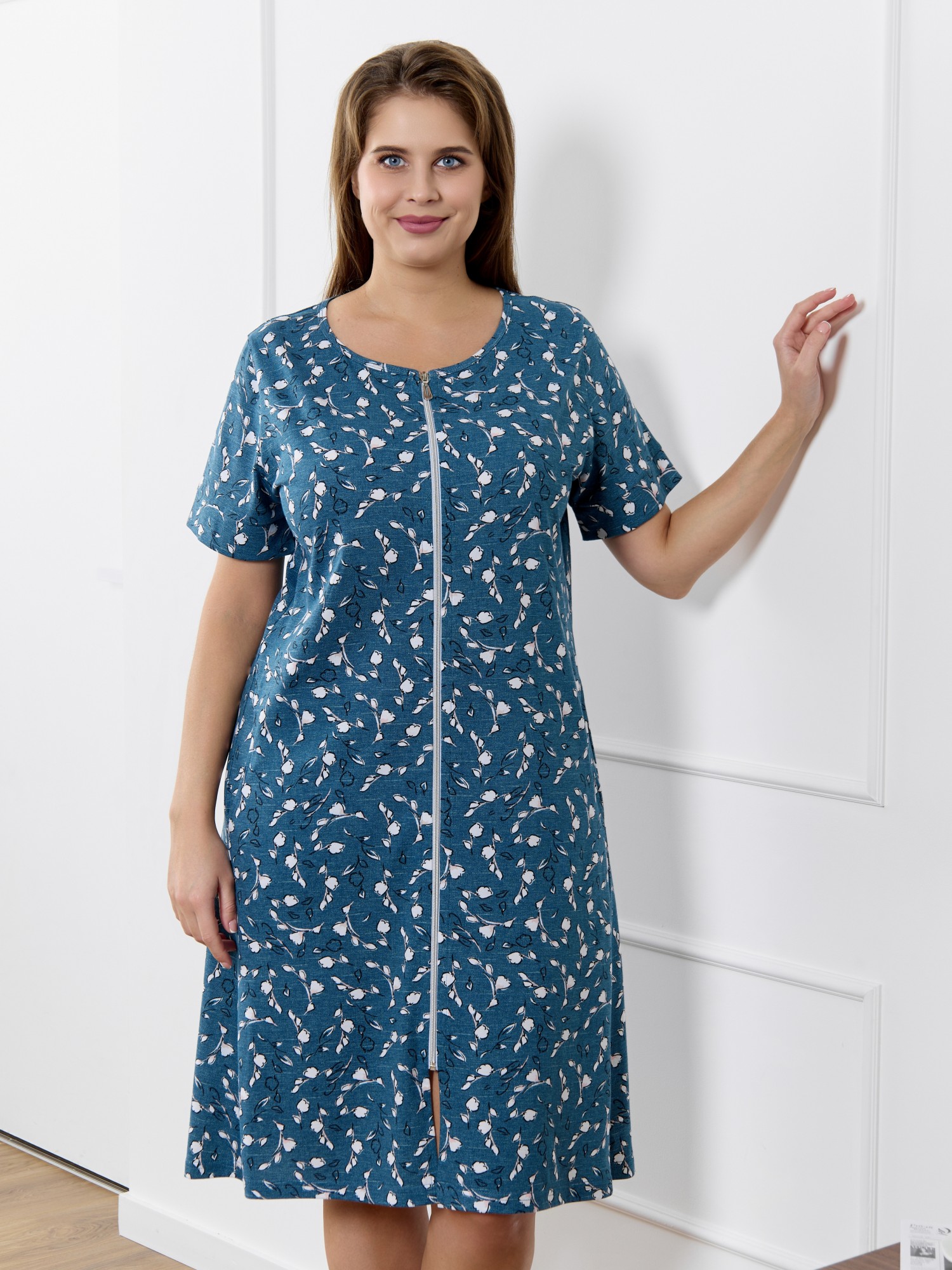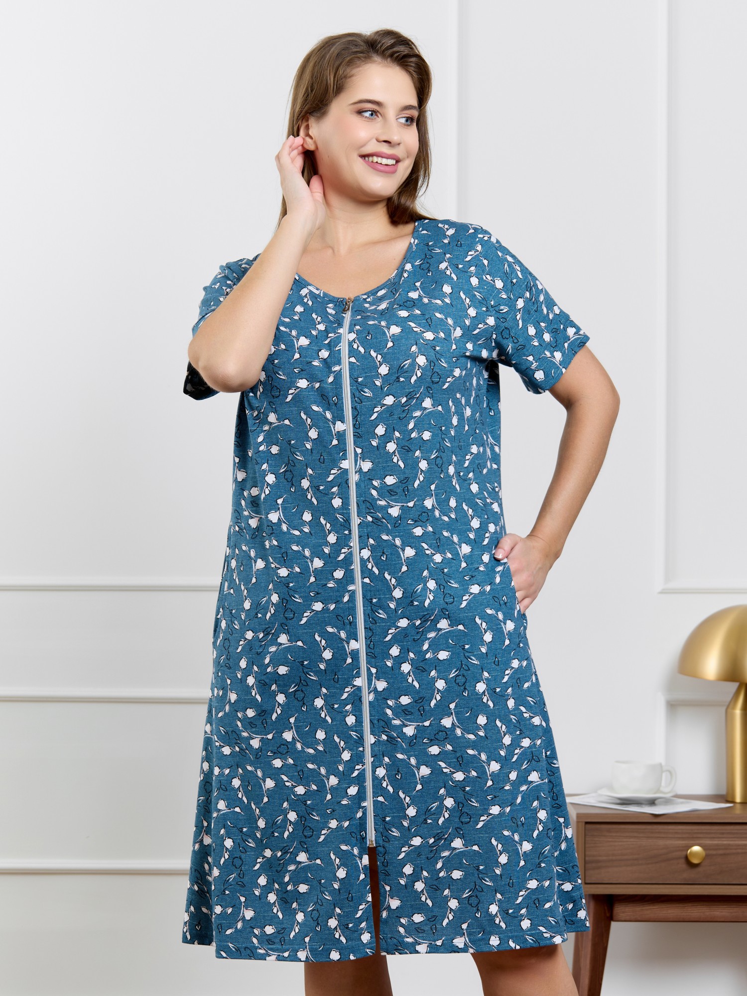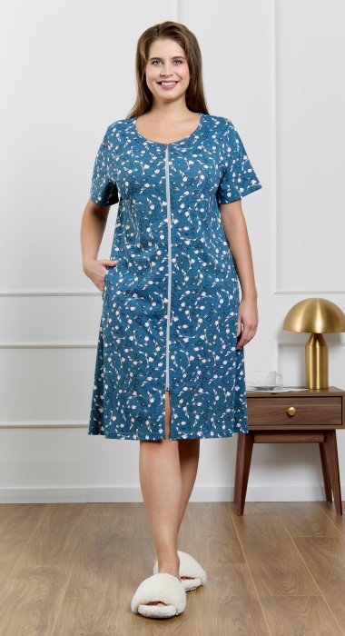 Халат женский из трикотажного полотна кулирка с набивным рисунком, прямого силуэта, с короткими втачными рукавами, обработанными манжетами, бортовой застежкой на тесьму «молния» и карманами в боковых швах. Горловина овальной формы окантована основным материалом.