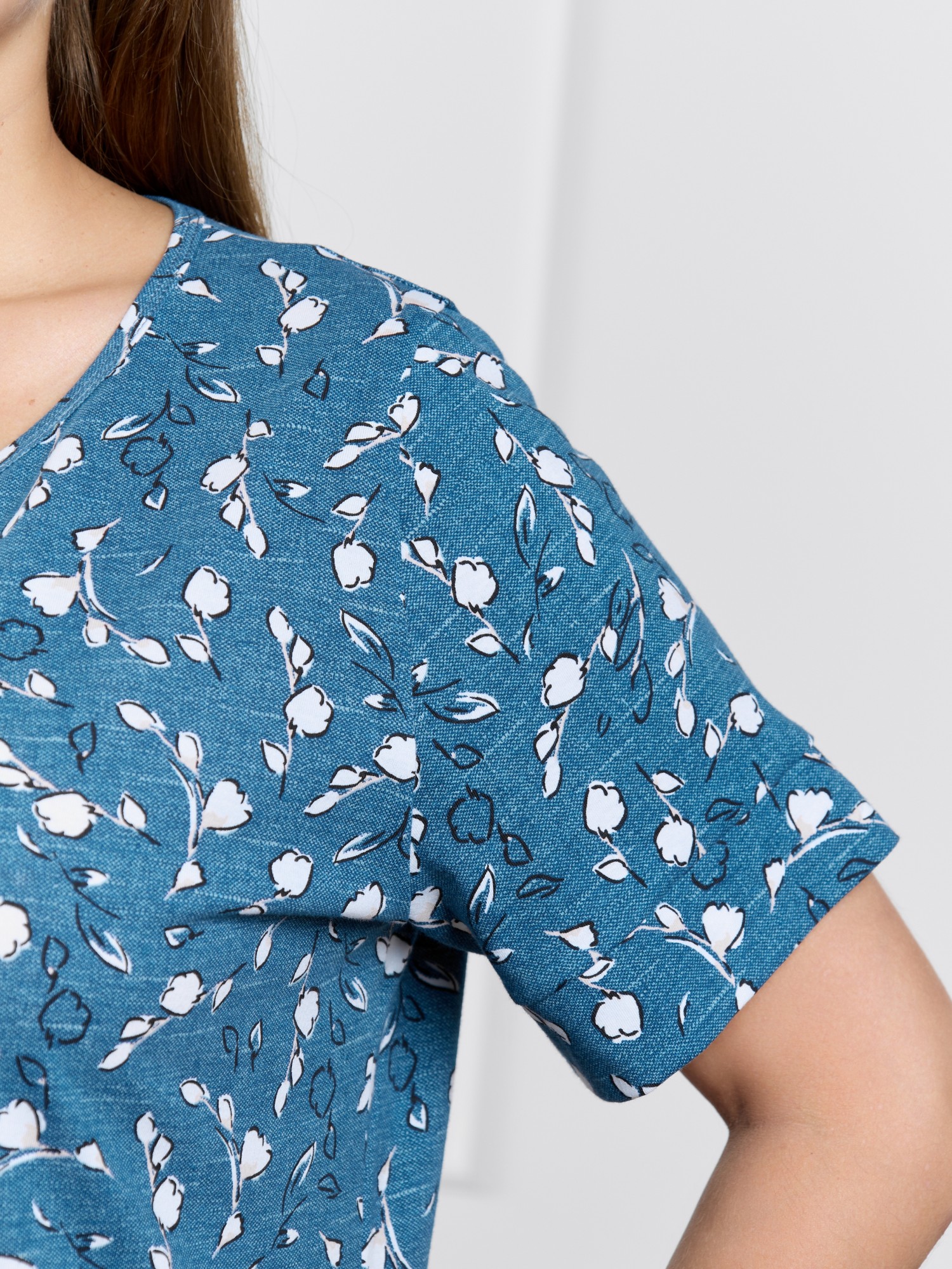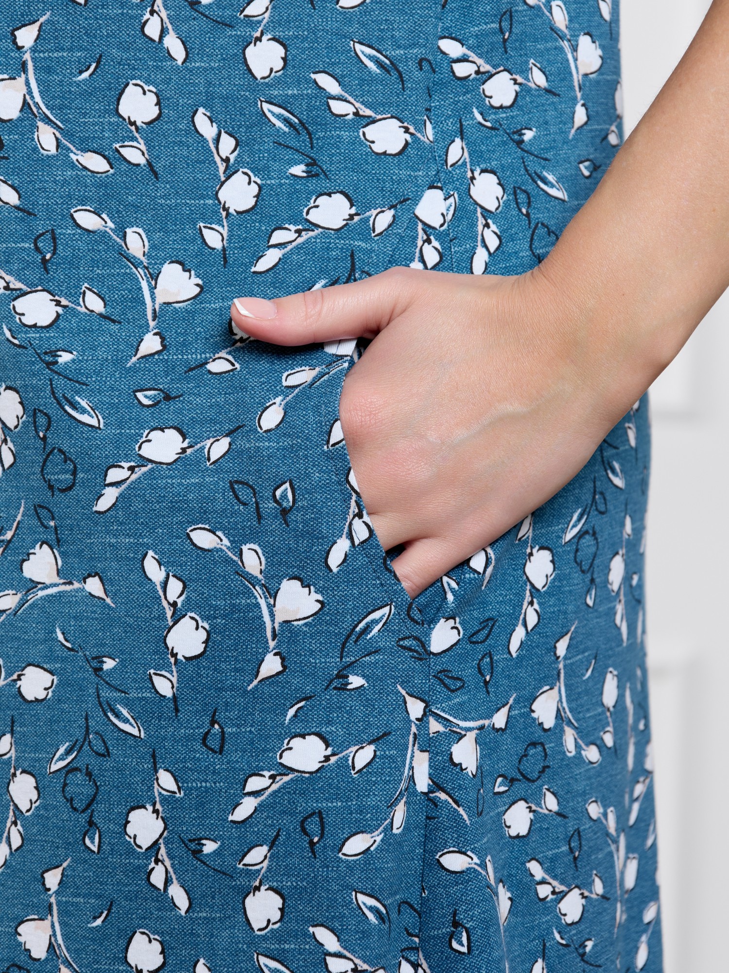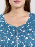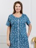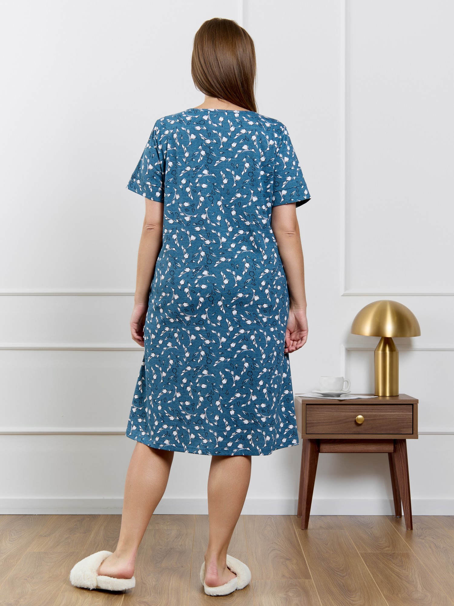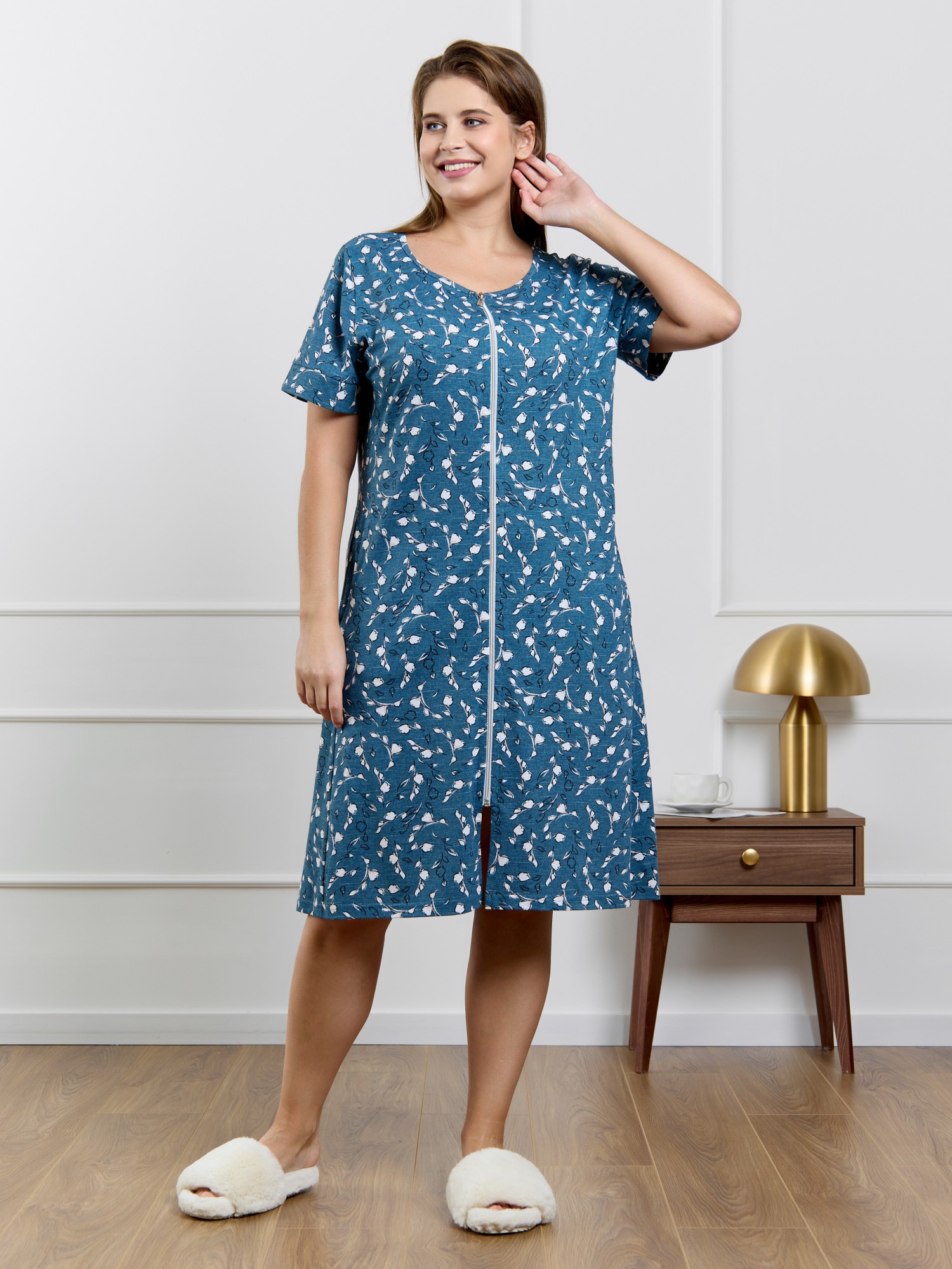 Халат женский из трикотажного полотна кулирка с набивным рисунком, прямого силуэта, с короткими втачными рукавами, обработанными манжетами, бортовой застежкой на тесьму «молния» и карманами в боковых швах. Горловина овальной формы окантована основным материалом.