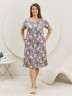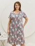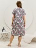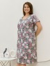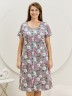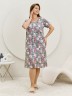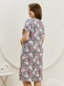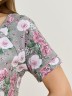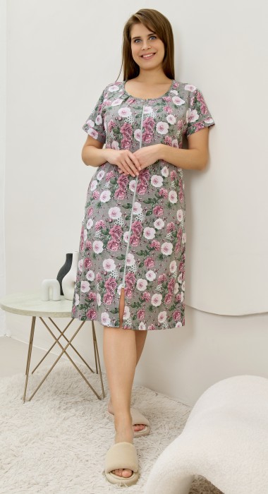 Халат женский из гладкокрашенного трикотажно полотна «кулирка» с набивным рисунком, полуприталенного силуэта, с короткими рукавами покроя «реглан» и горловиной овальной формы, окантованной основным материалом, с центральной бортовой застежкой на тесьму «молния». По срезу горловины выполнены неглубокие складки, нижние резы рукавов обработаны притачными манжетами с кантом контрастного цвета.