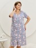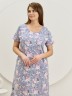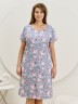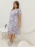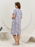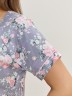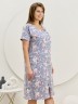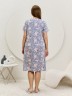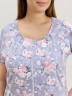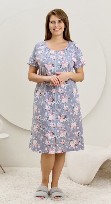 Халат женский из гладкокрашенного трикотажно полотна «кулирка» с набивным рисунком, полуприталенного силуэта, с короткими рукавами покроя «реглан» и горловиной овальной формы, окантованной основным материалом, с центральной бортовой застежкой на тесьму «молния». По срезу горловины выполнены неглубокие складки, нижние резы рукавов обработаны притачными манжетами с кантом контрастного цвета.