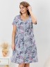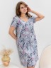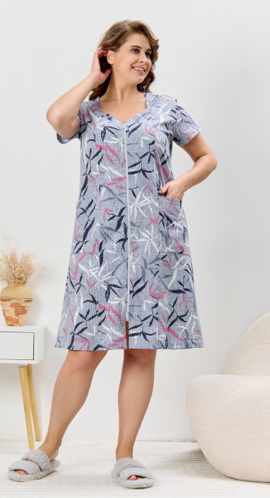 Халат женский из трикотажного полотна «кулирка» с набивным рисунком, прямого силуэта, с короткими втачными рукавами, горловиной фигурной формы, двумя накладными карманами на уровне бедер и центральной бортовой застежкой на тесьму «молния». Полочка – с рельефными швами, выходящими из горловины. Нижние срезы горловины обработаны притачными планками. Остальная часть горловины окантована основным материалом.