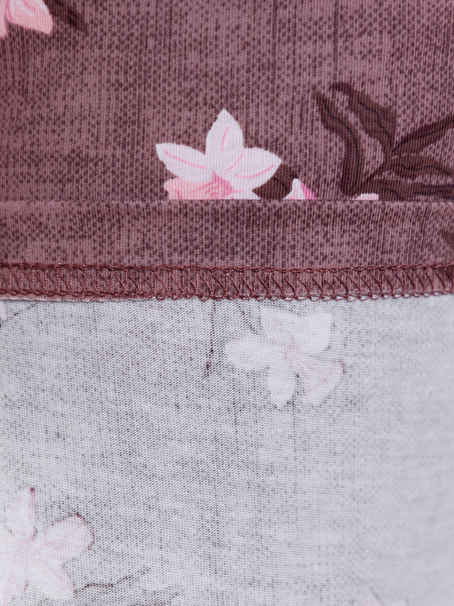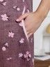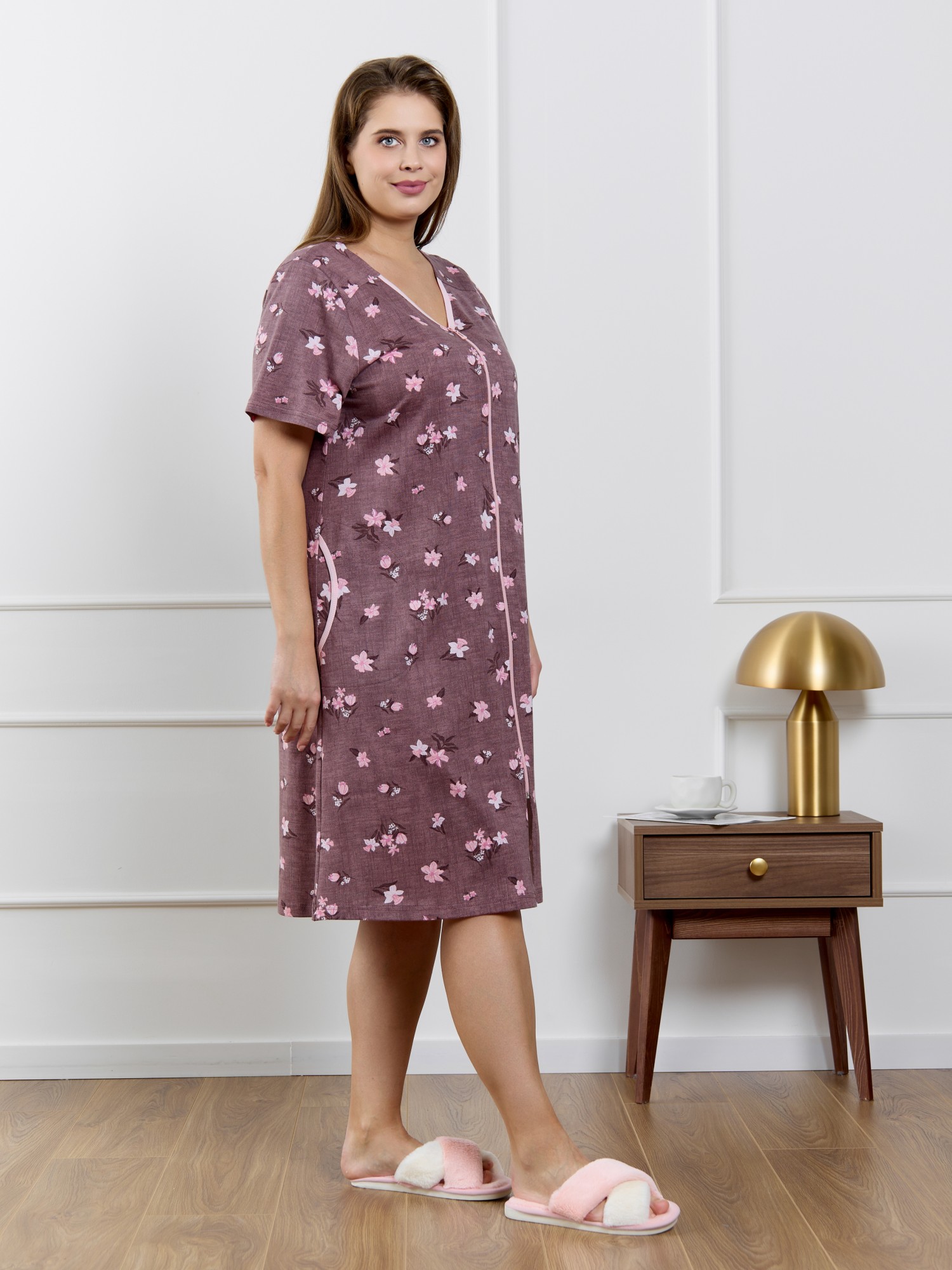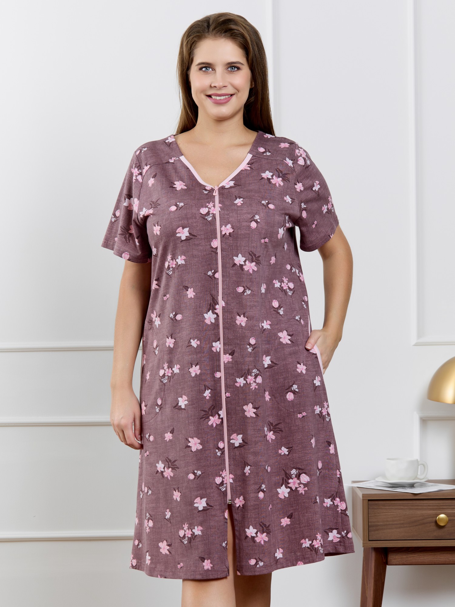 Халат женский из трикотажного полотна «кулирка» с набивным рисунком, прямого силуэта, с короткими втачными рукавами, горловиной V- образной формы, карманами в боковых швах и центральной бортовой застежкой на тесьму «молния». Полочка – с двумя небольшими двойными кокетками, выполненными по косой линии. Горловина переда, входы в карманы окантованы контрастным материалом.