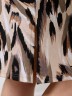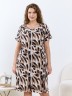 Халат - женский трикотажного полотна «кулирка» с набивным рисунком, свободного покроя, расширенный к низу, с короткими цельнокроеными рукавами, горловиной овальной формы, окантованной двойным кантом и разрезами в боковых швах, центральной бортовой застежкой на тесьму « молния». Рукава с притачными манжетами и кантом, полочки с отрезными бочками в нижней части и боковыми карманами на уровне бедер. Верхние срезы карманов обработаны притачными планками с кантом.