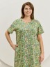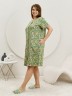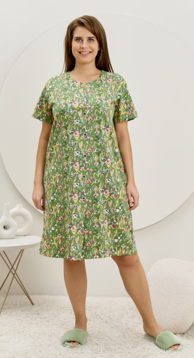 Халат женский из трикотажного полотна «кулирка» с набивным рисунком, прямого силуэта, с короткими втачными рукавами, карманами в боковых швах и центральной бортовой застежкой на обметанные петли и пуговицы. Горловина – овальной формы, переходящая в небольшой v-образный вырез выше верхней пуговицы. Входы в карманы и горловина спинки окантованы.