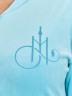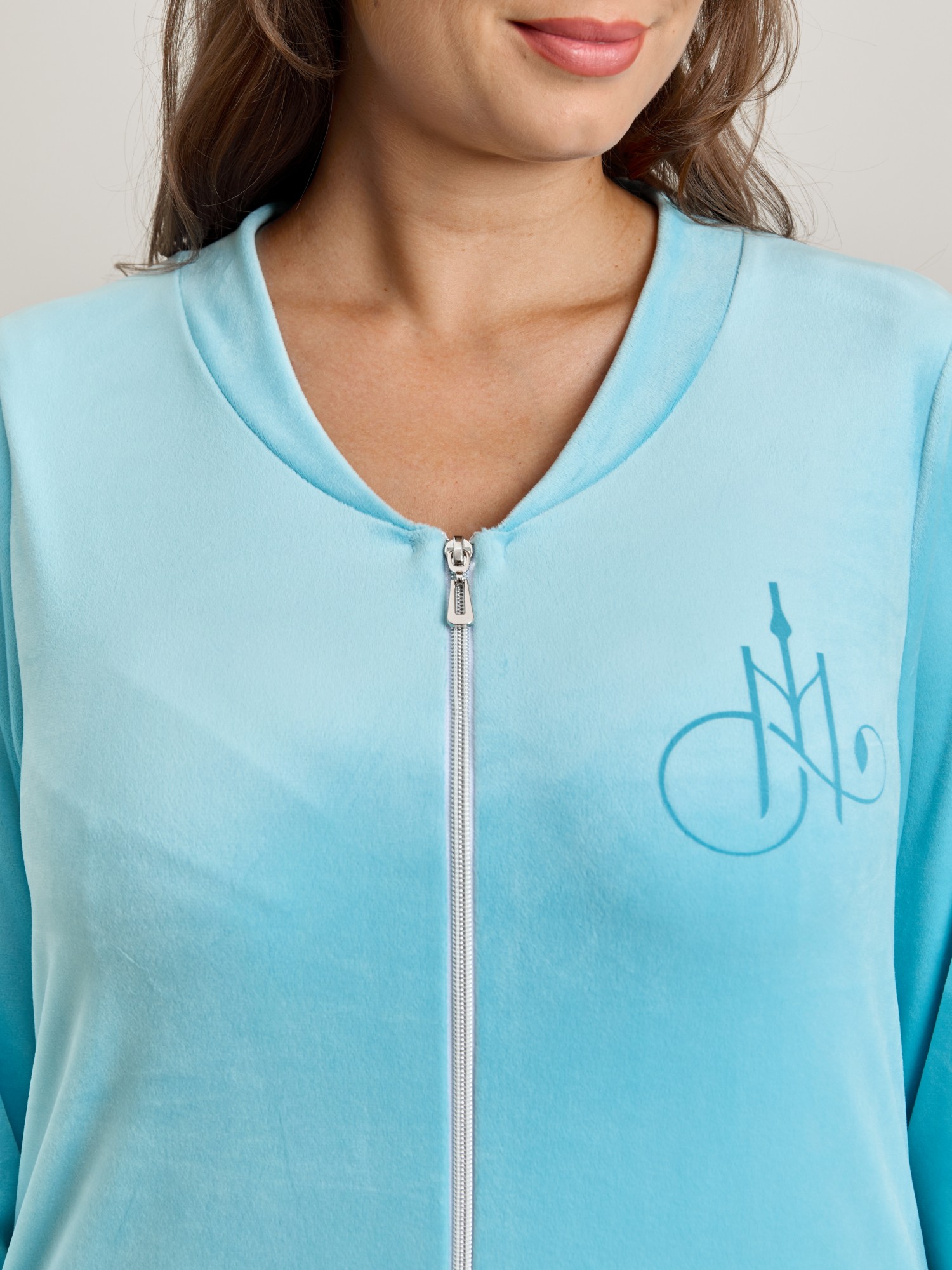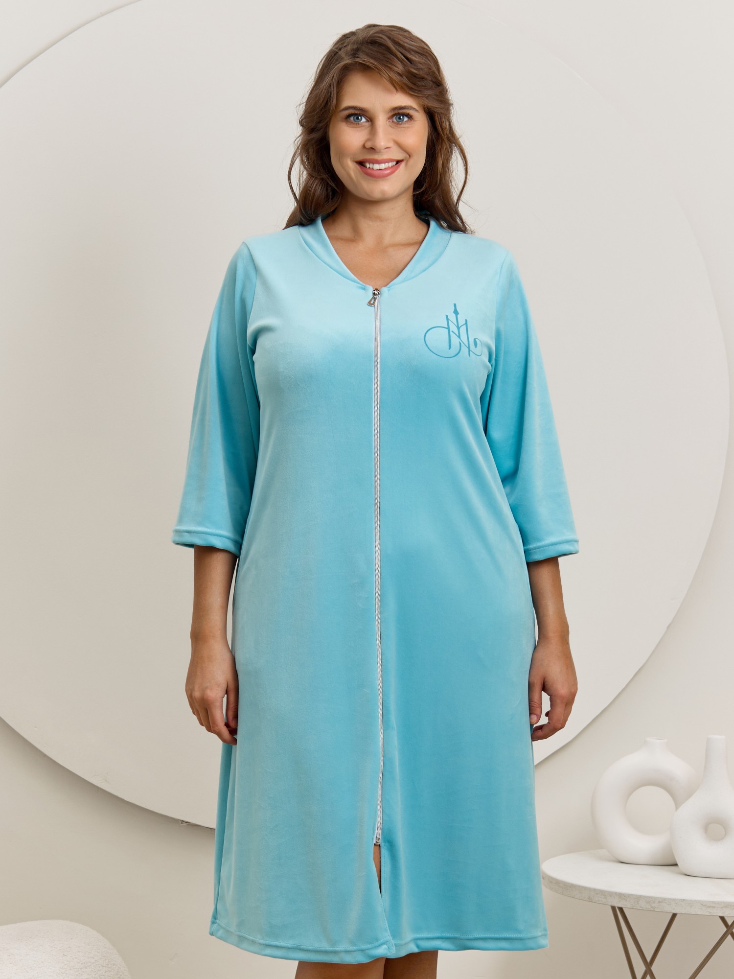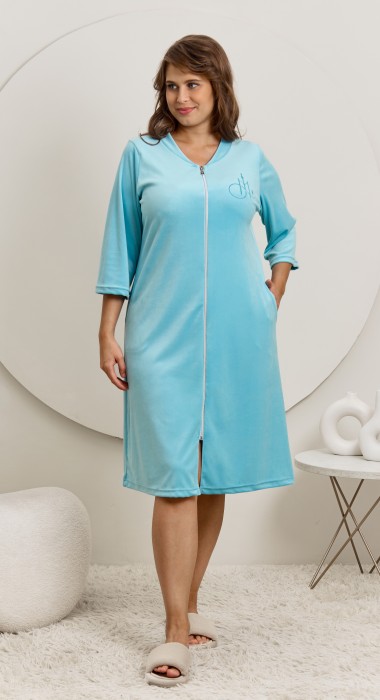 Халат женский из гладкокрашенного трикотажного полотна «велюр стрейч», прямого силуэта, с втачными рукавами длиной ¾ и карманами в боковых швах. Горловина v-образной формы обработана втачной планкой, переходящей в центральную бортовую застежку на тесьму «молния», на левой полочке печать, выполненная в технике «шелкографии».
