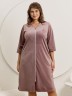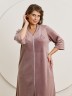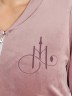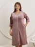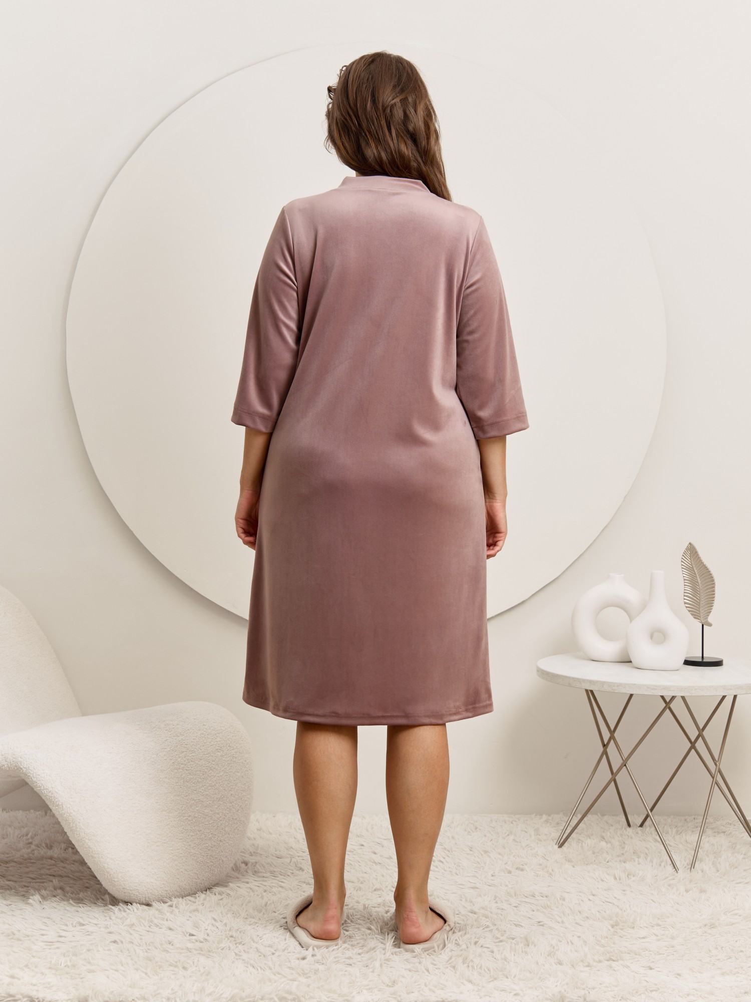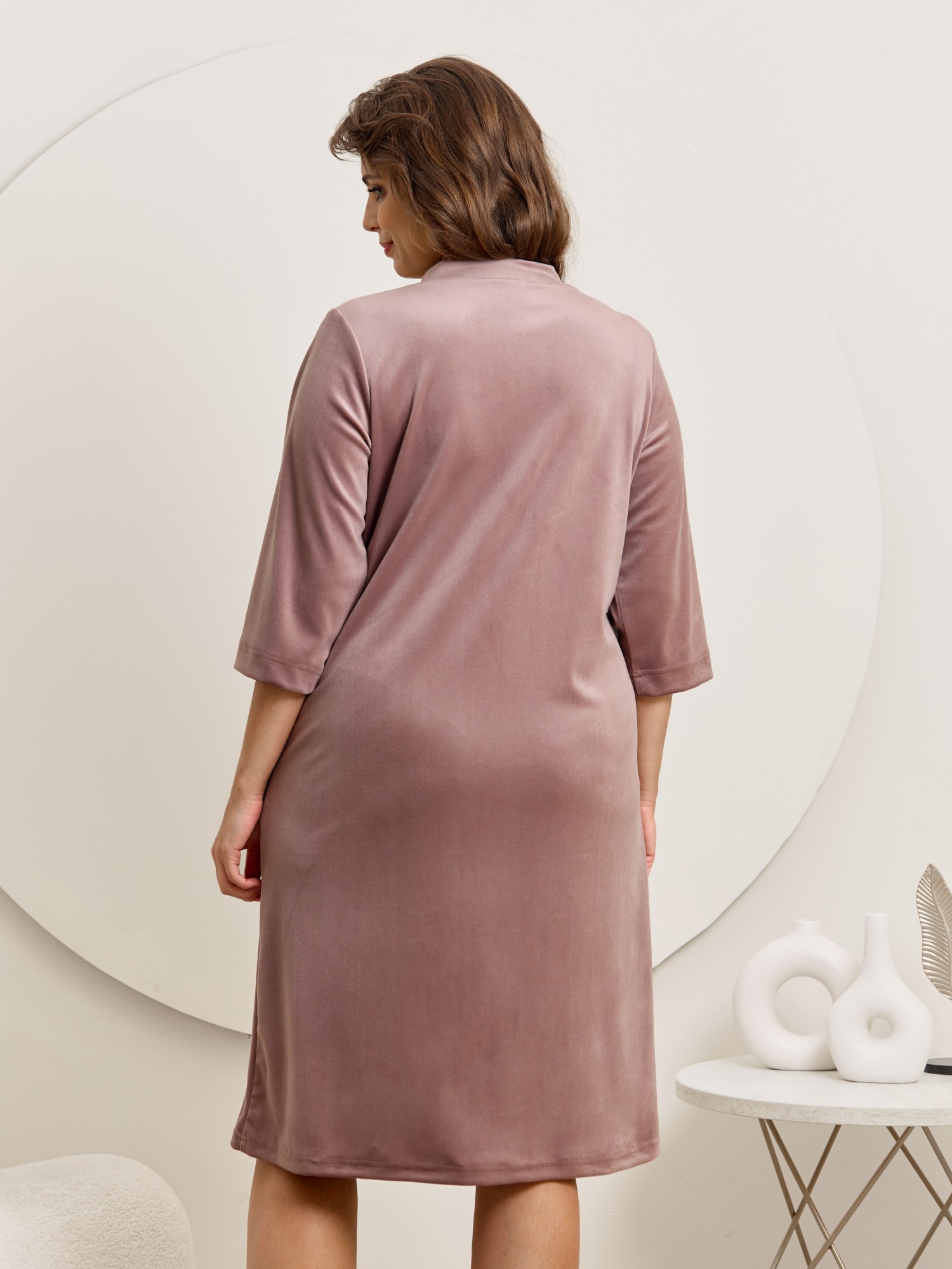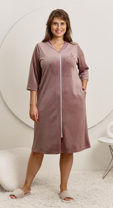 Халат женский из гладкокрашенного трикотажного полотна «велюр стрейч», прямого силуэта, с втачными рукавами длиной ¾ и карманами в боковых швах. Горловина v-образной формы обработана втачной планкой, переходящей в центральную бортовую застежку на тесьму «молния», на левой полочке печать, выполненная в технике «шелкографии».