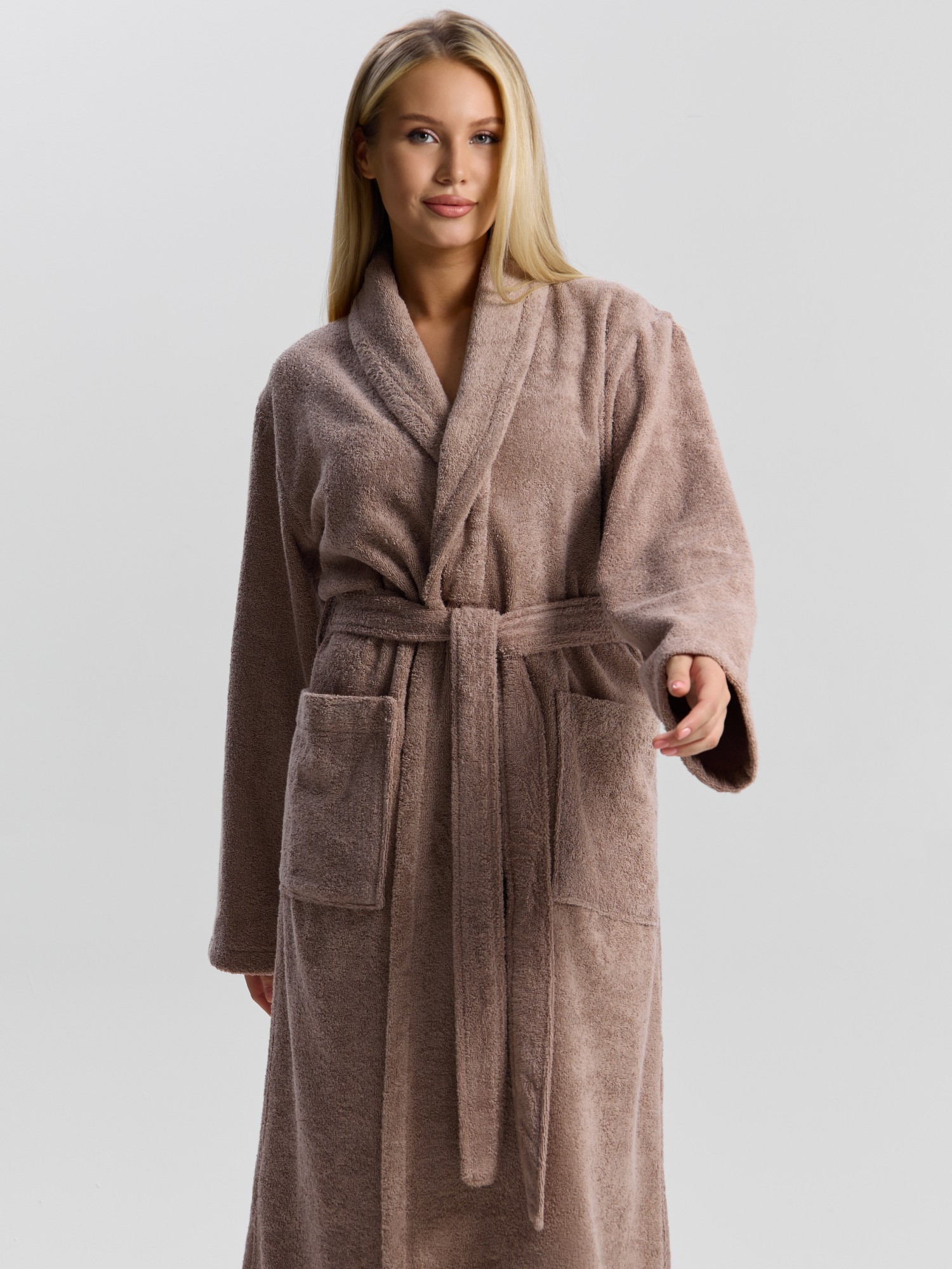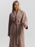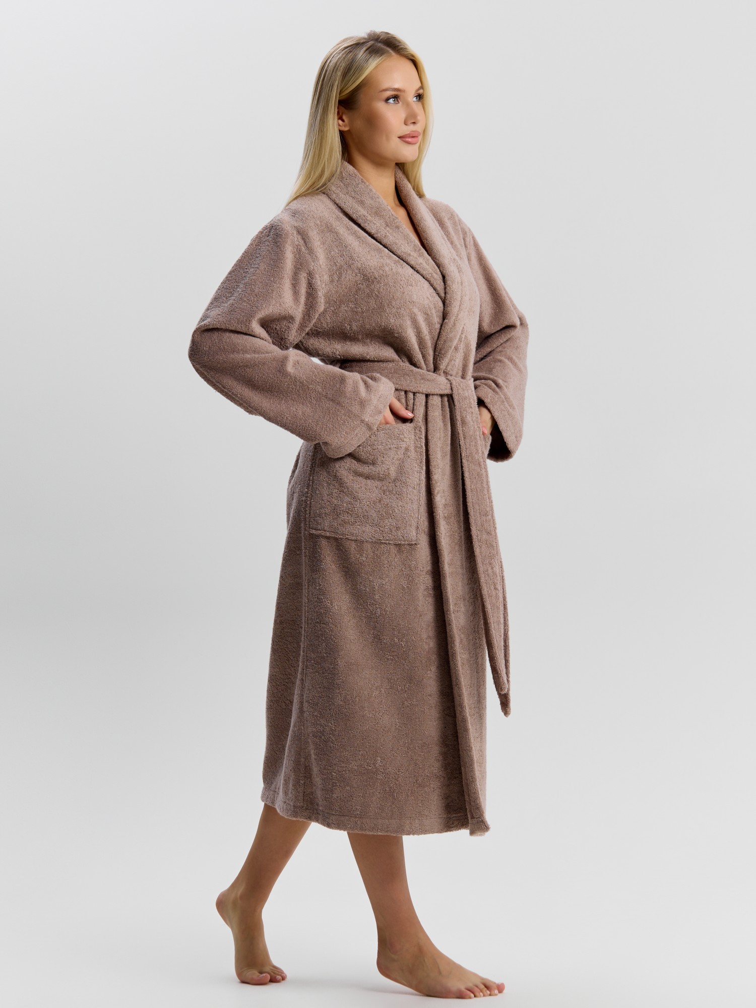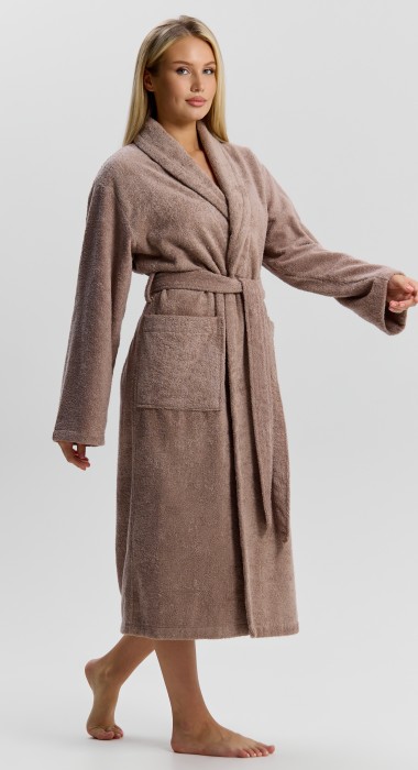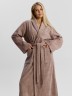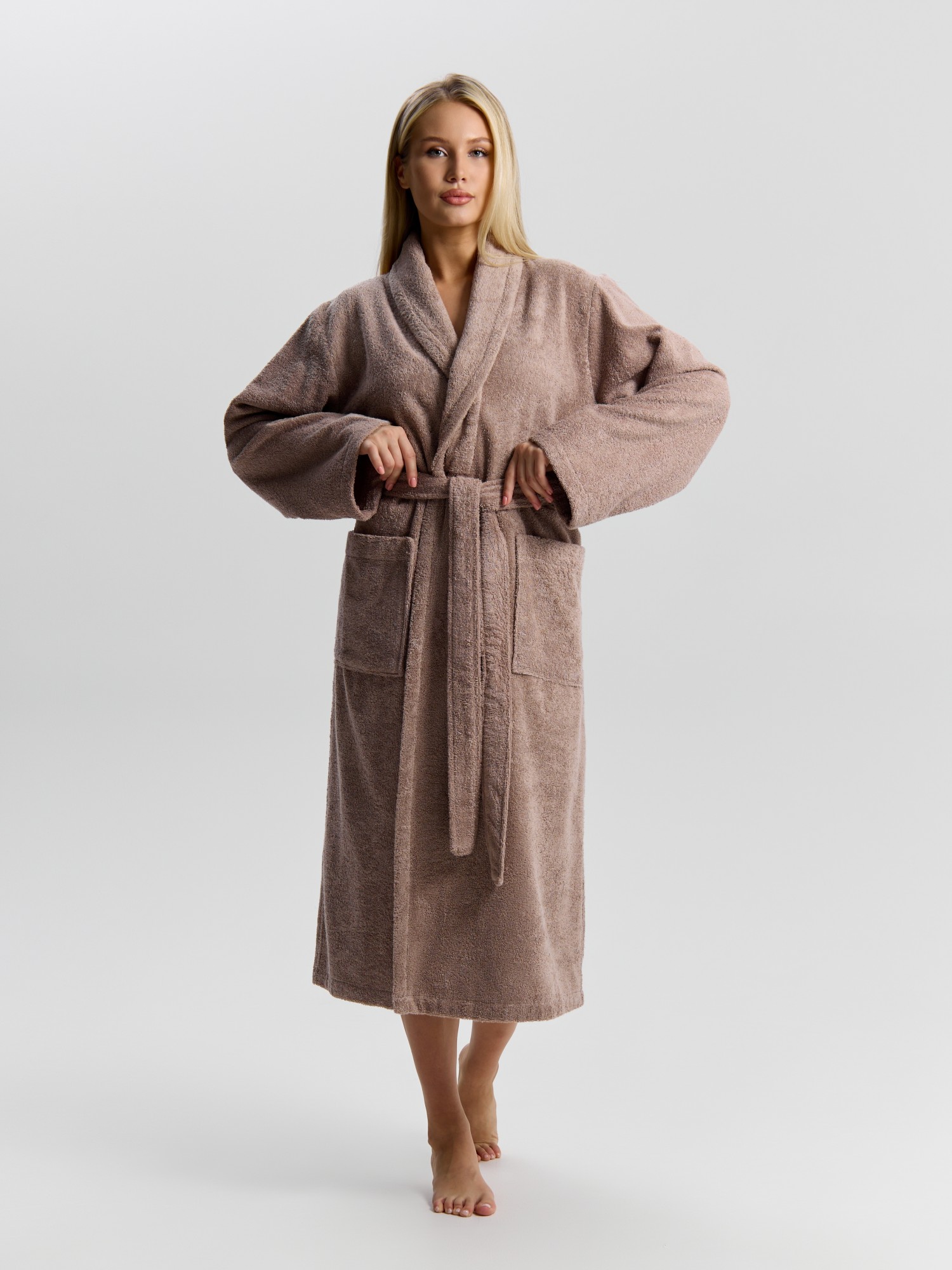 Женский халат из двустороннего махрового хлопкового полотна. Модель на запах, с поясом в шлёвках, с боковыми карманами, с воротником "шаль", с петлей-вешалкой по горловине спинки.