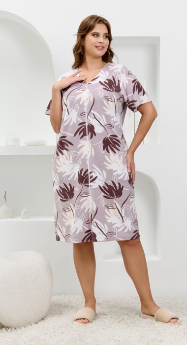 Халат женский из трикотажного полотна «махра» с набивным рисунком. Изделие прямого силуэта, с короткими втачными рукавами, горловиной V- образной формы, карманами в боковых швах и центральной бортовой застежкой на тесьму «молния».