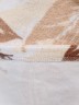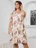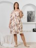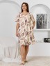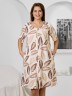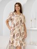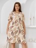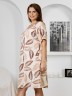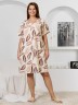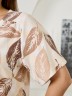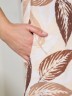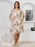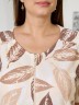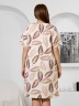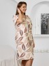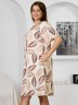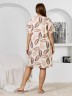 Халат женский из трикотажного полотна «махра» с набивным рисунком, слегка расширенный книзу, с короткими втачными рукавами, карманами в боковых швах, горловиной V-образной формы, центральной бортовой застежкой на тесьму «молния». Плечевые швы изделия переходят на деталь переда, имитируя притачные кокетки со сборкой.