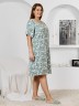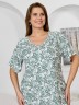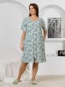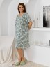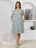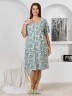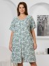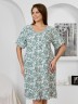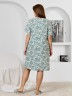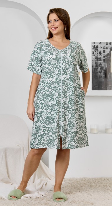 Халат женский из трикотажного полотна «махра» с набивным рисунком, слегка расширенный книзу, с короткими втачными рукавами, карманами в боковых швах, горловиной V-образной формы, центральной бортовой застежкой на тесьму «молния». Плечевые швы изделия переходят на деталь переда, имитируя притачные кокетки со сборкой.