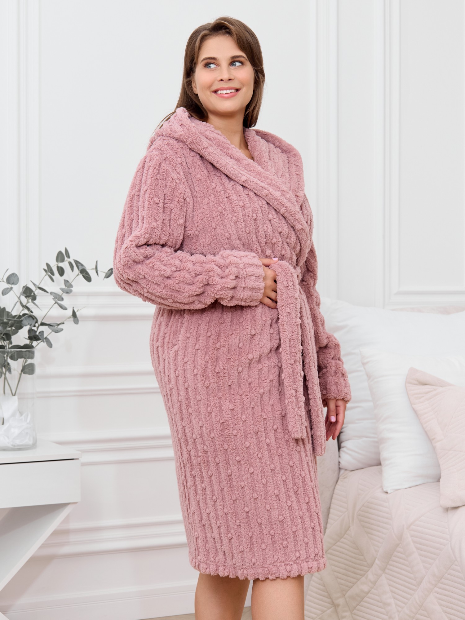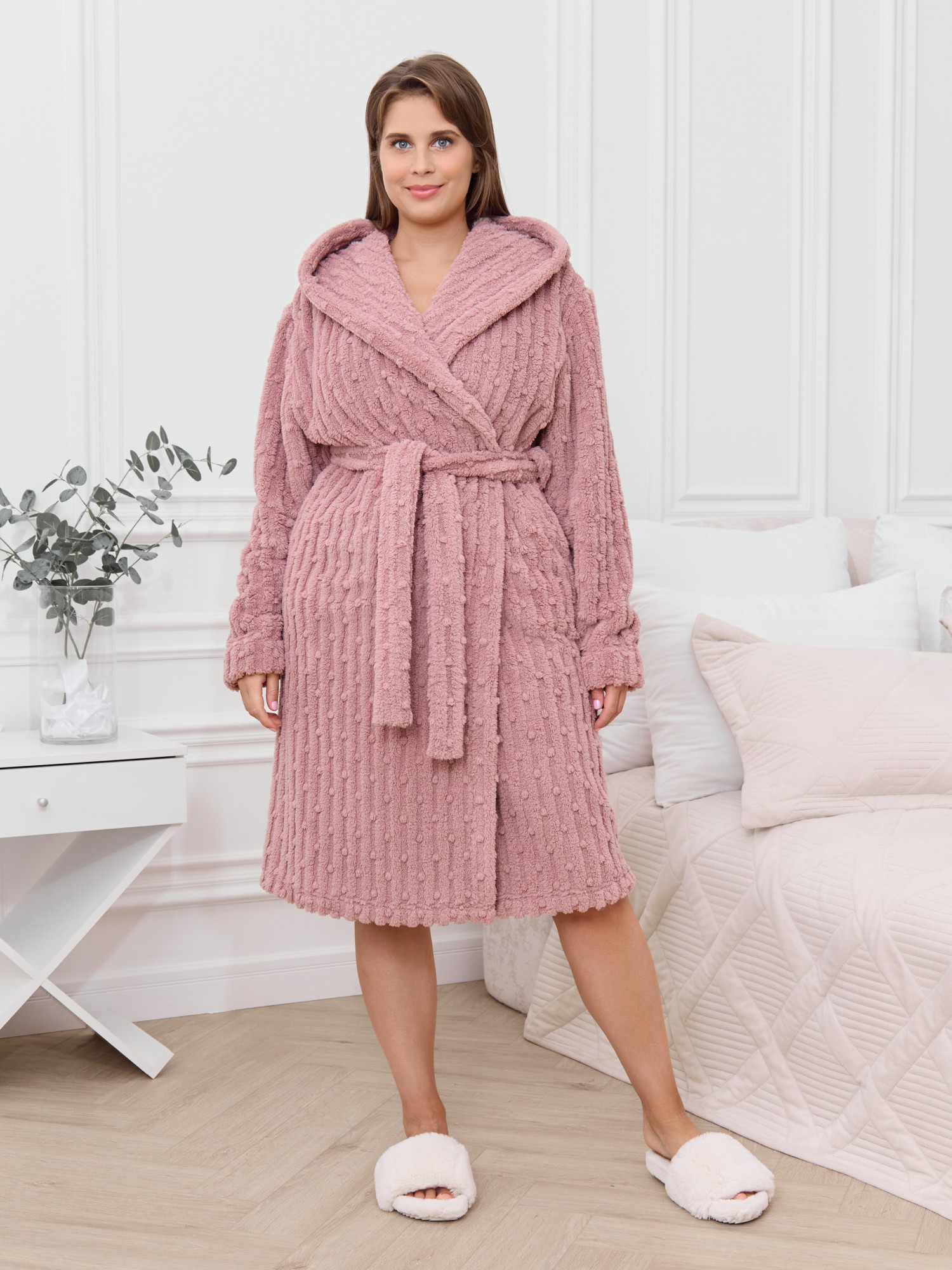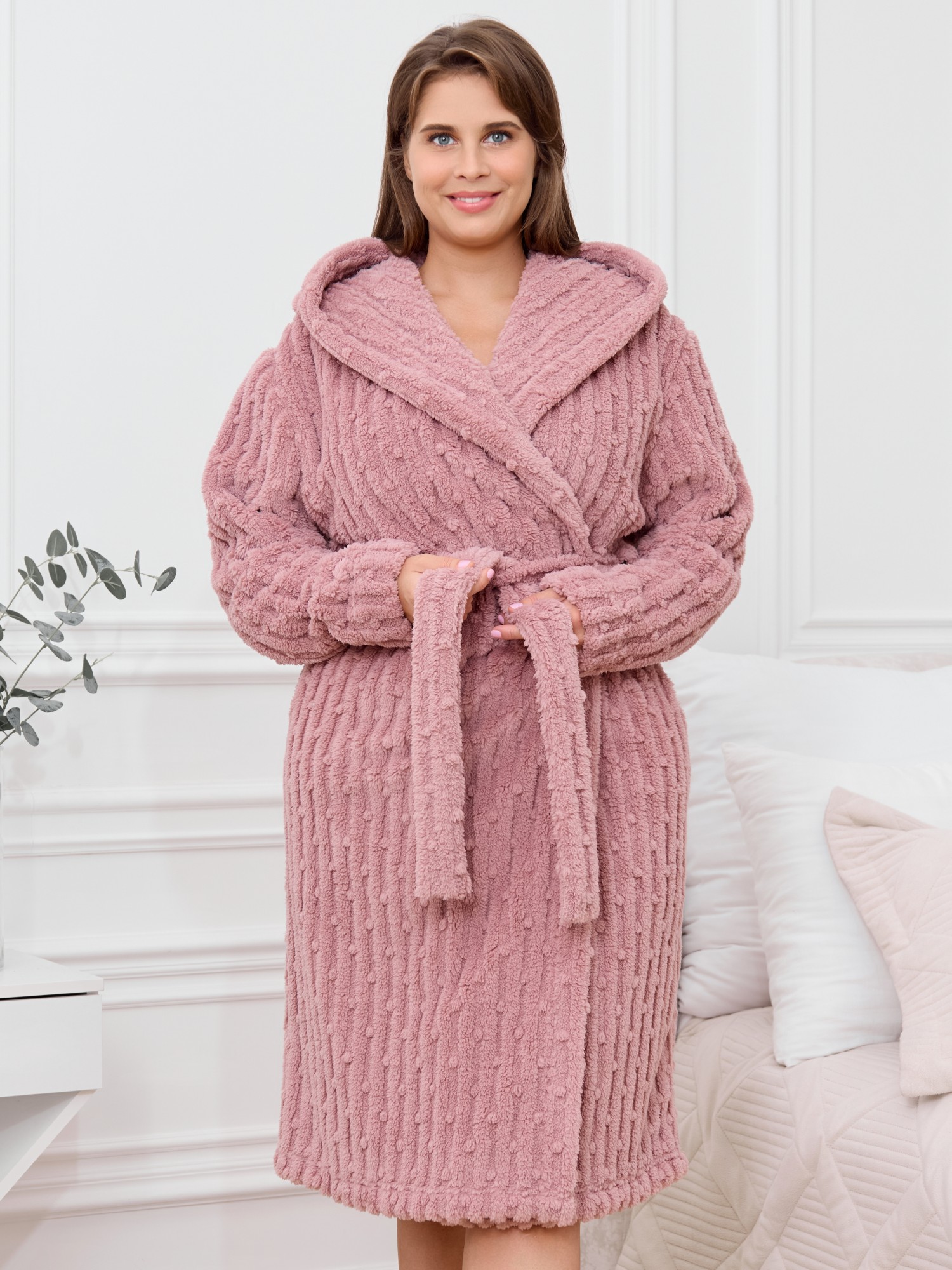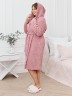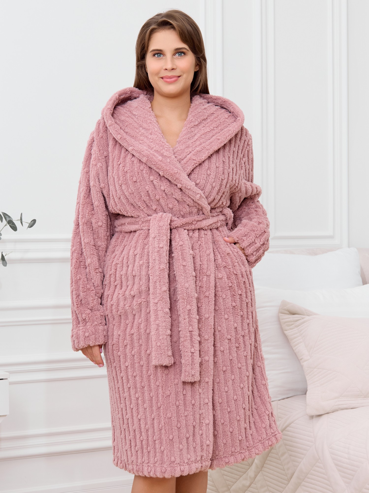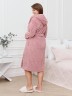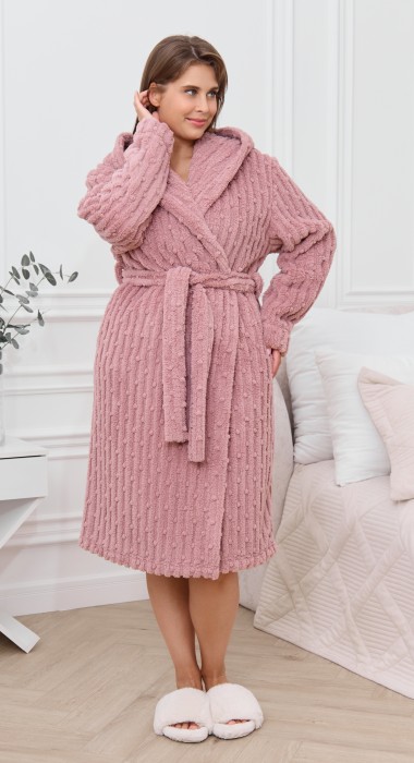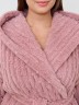 Халат женский из гладкокрашенного трикотажного полотна «велсофт» со стриженым рисунком, прямого силуэта, на запахе, с длинными втачными рукавами, капюшоном, карманами в боковых швах и съемным поясом, фиксирующимся на талии двумя шлевками в боковых швах.