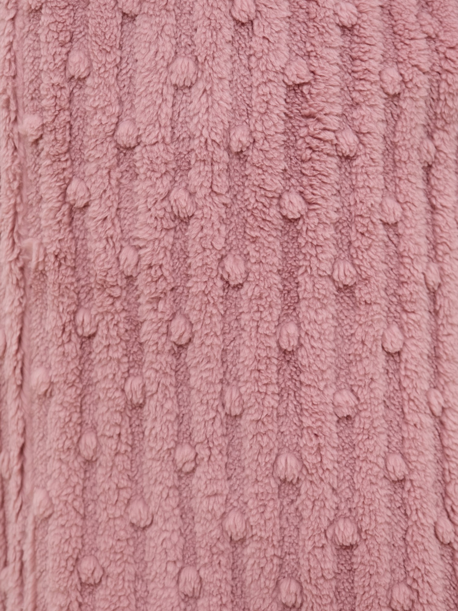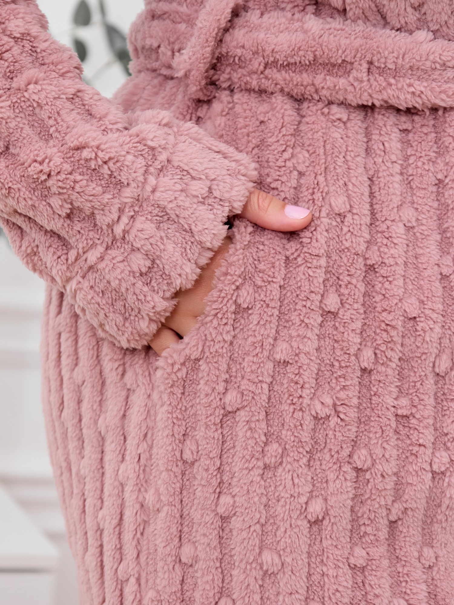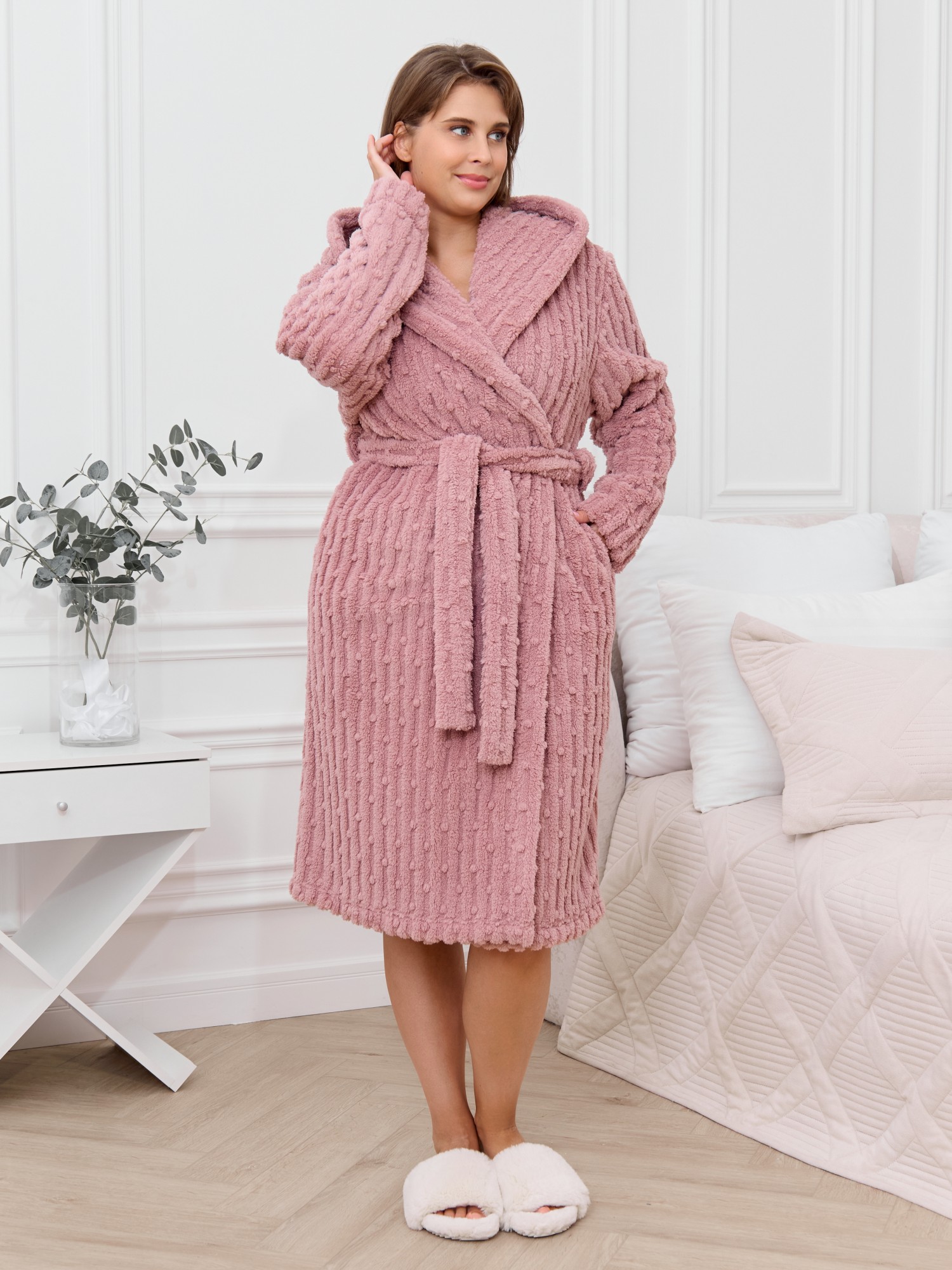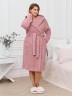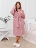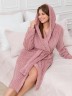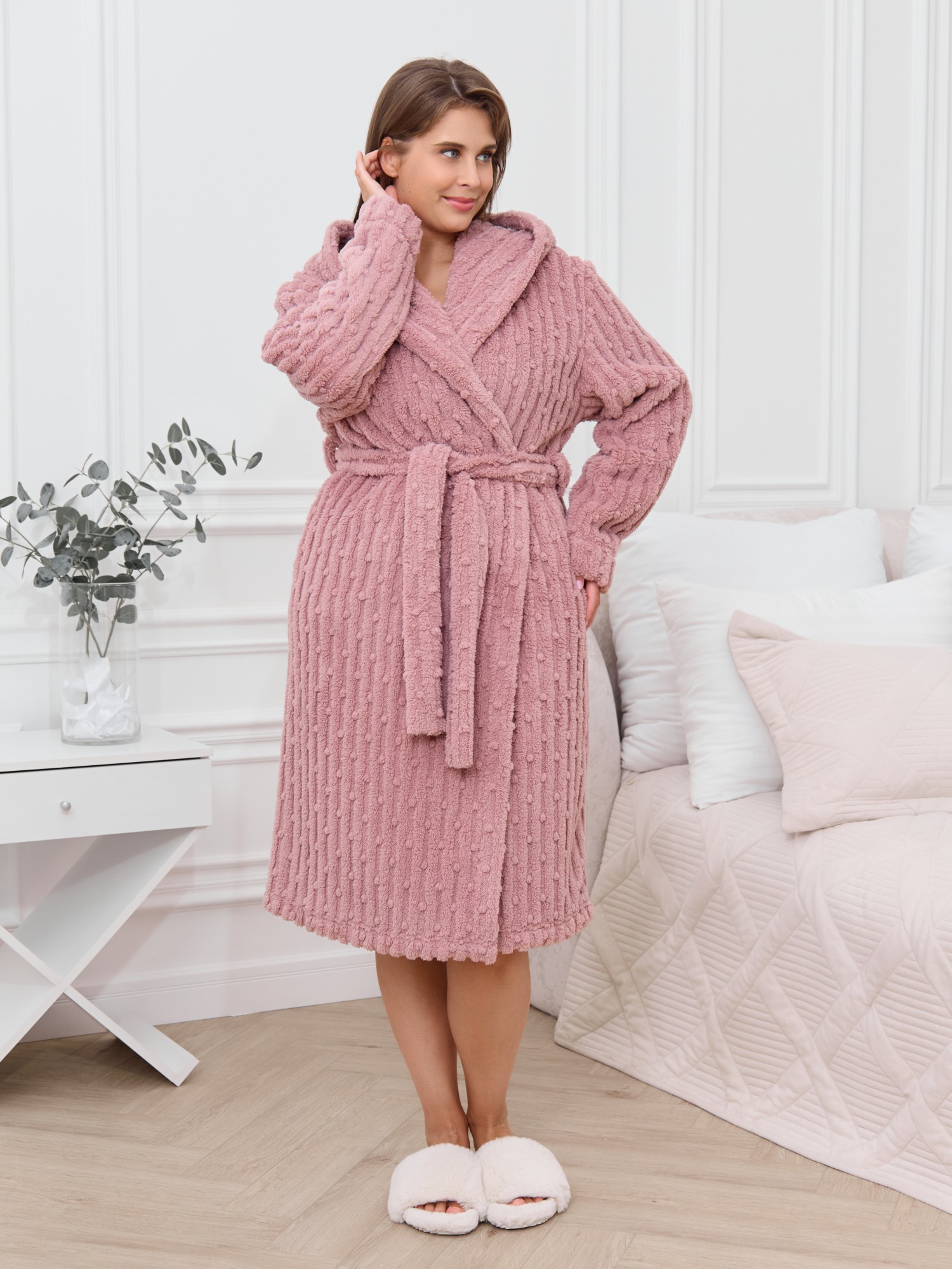 Халат женский из гладкокрашенного трикотажного полотна «велсофт» со стриженым рисунком, прямого силуэта, на запахе, с длинными втачными рукавами, капюшоном, карманами в боковых швах и съемным поясом, фиксирующимся на талии двумя шлевками в боковых швах.