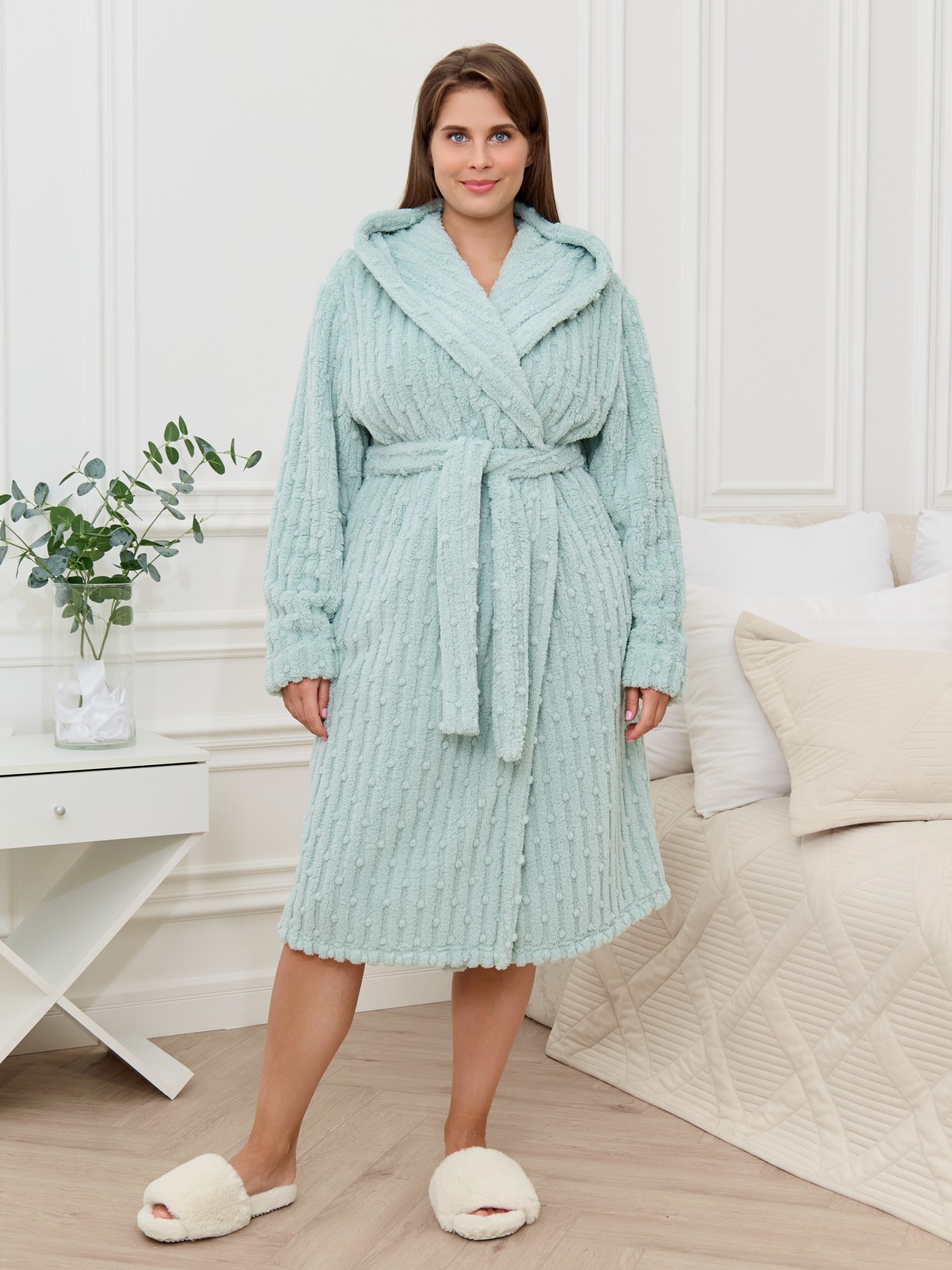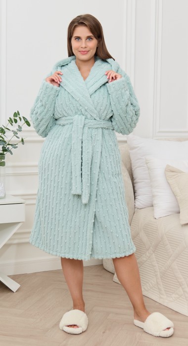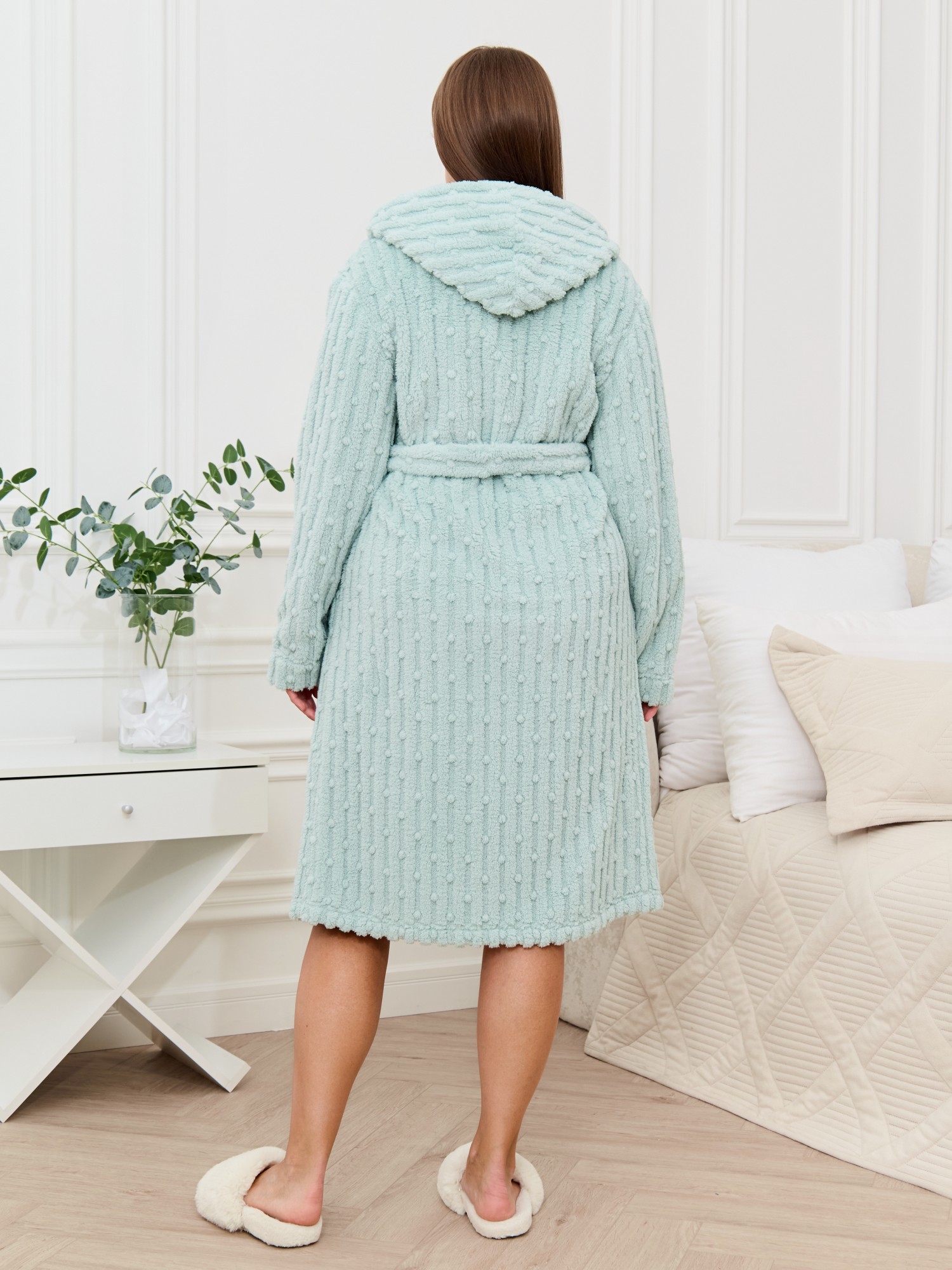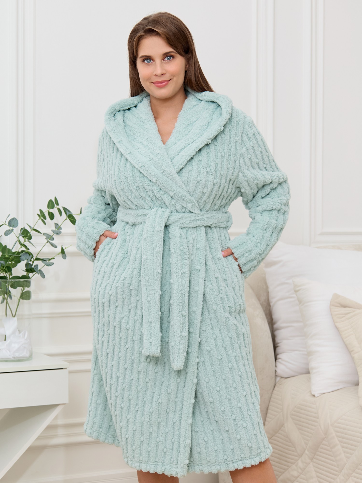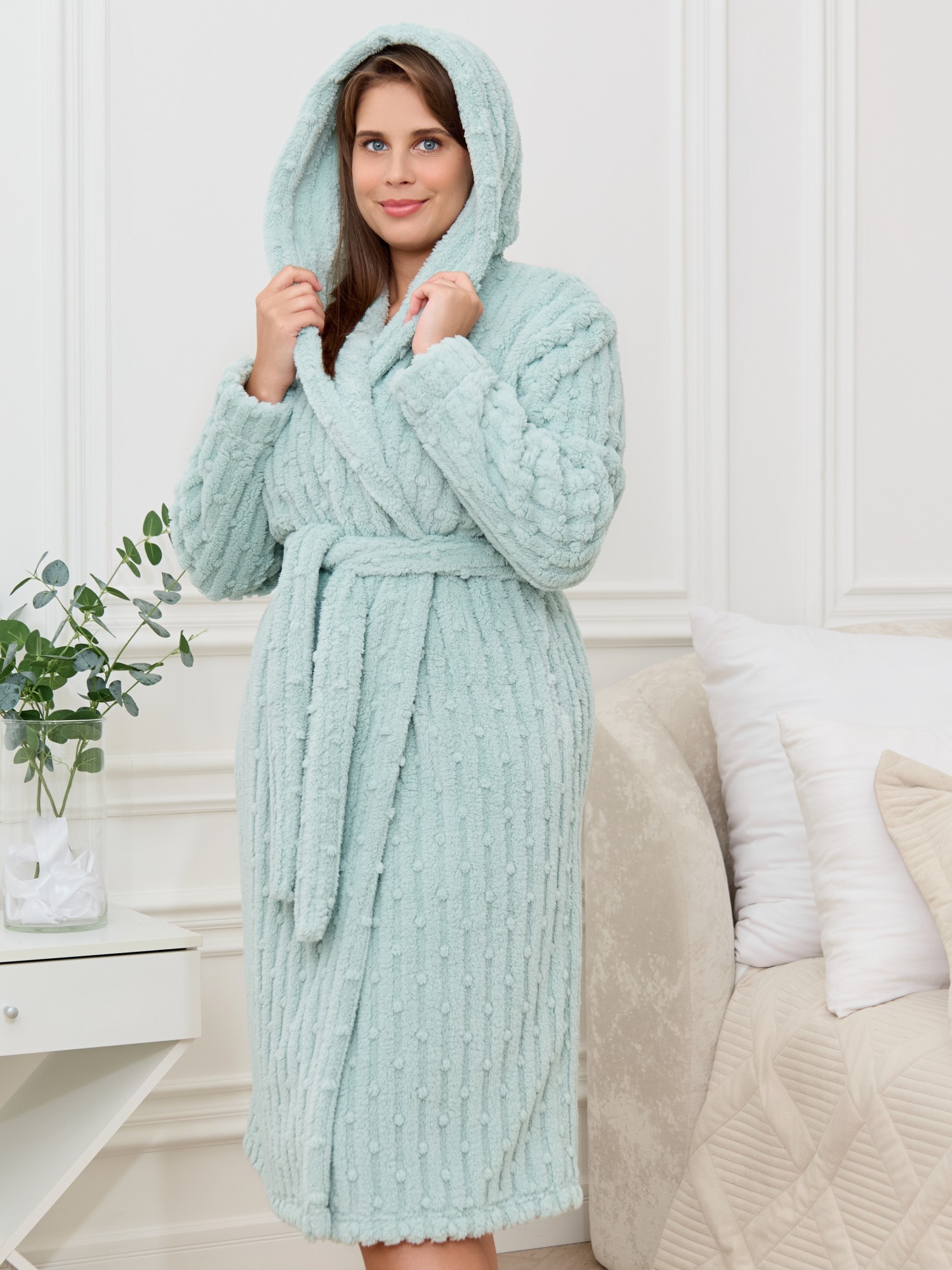 Халат женский из гладкокрашенного трикотажного полотна «велсофт» со стриженым рисунком, прямого силуэта, на запахе, с длинными втачными рукавами, капюшоном, карманами в боковых швах и съемным поясом, фиксирующимся на талии двумя шлевками в боковых швах.