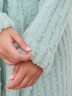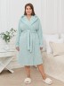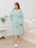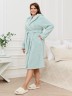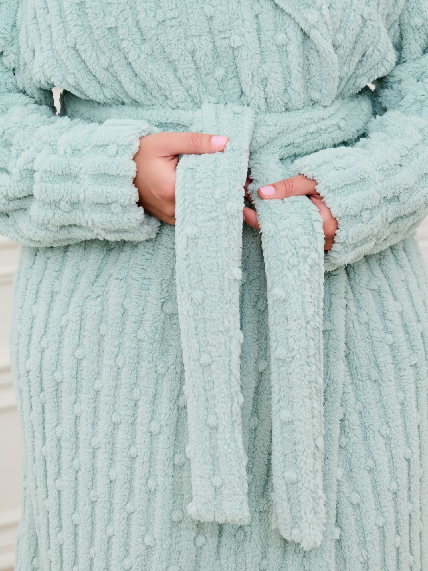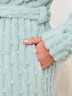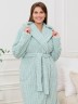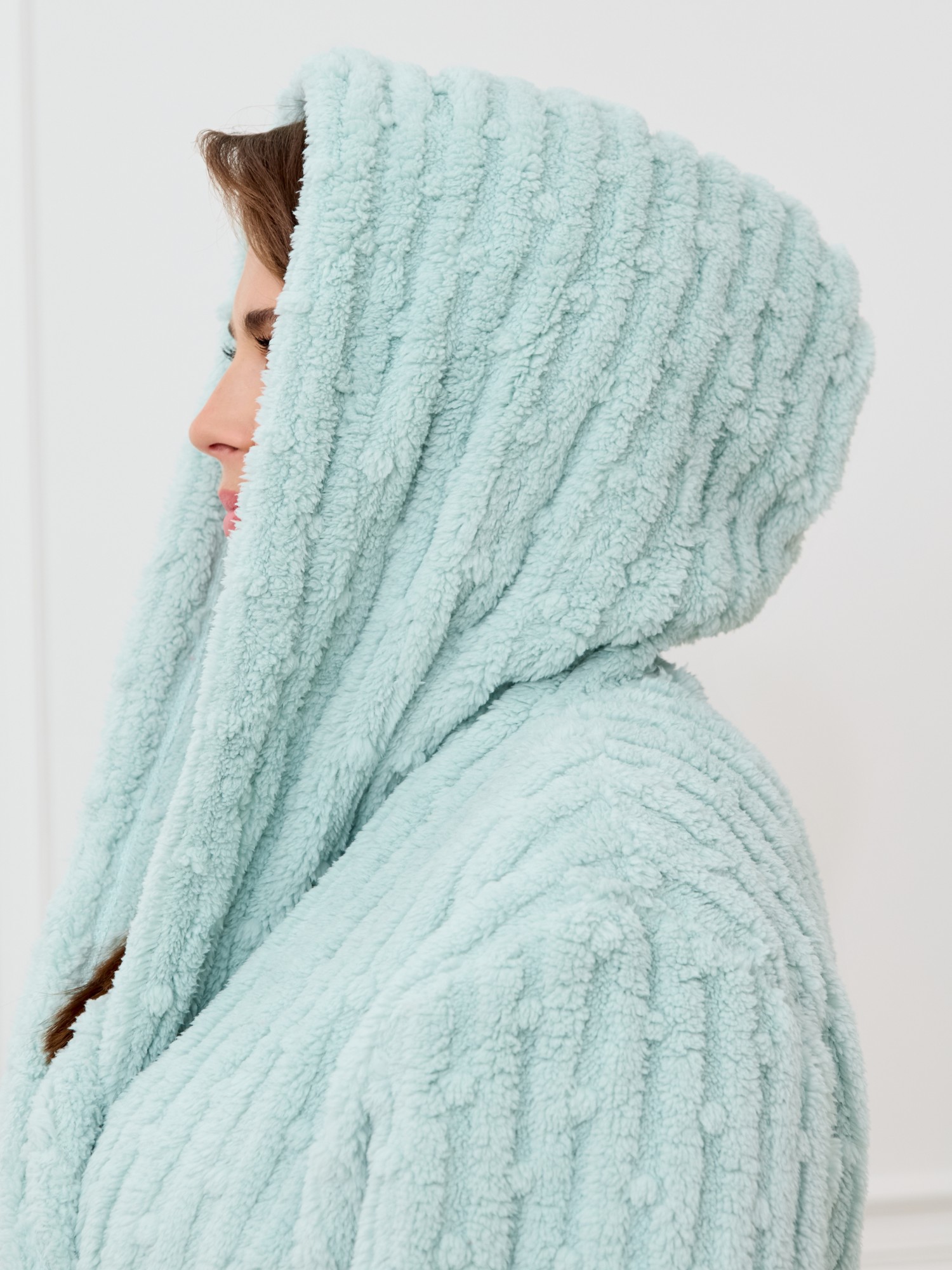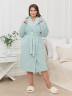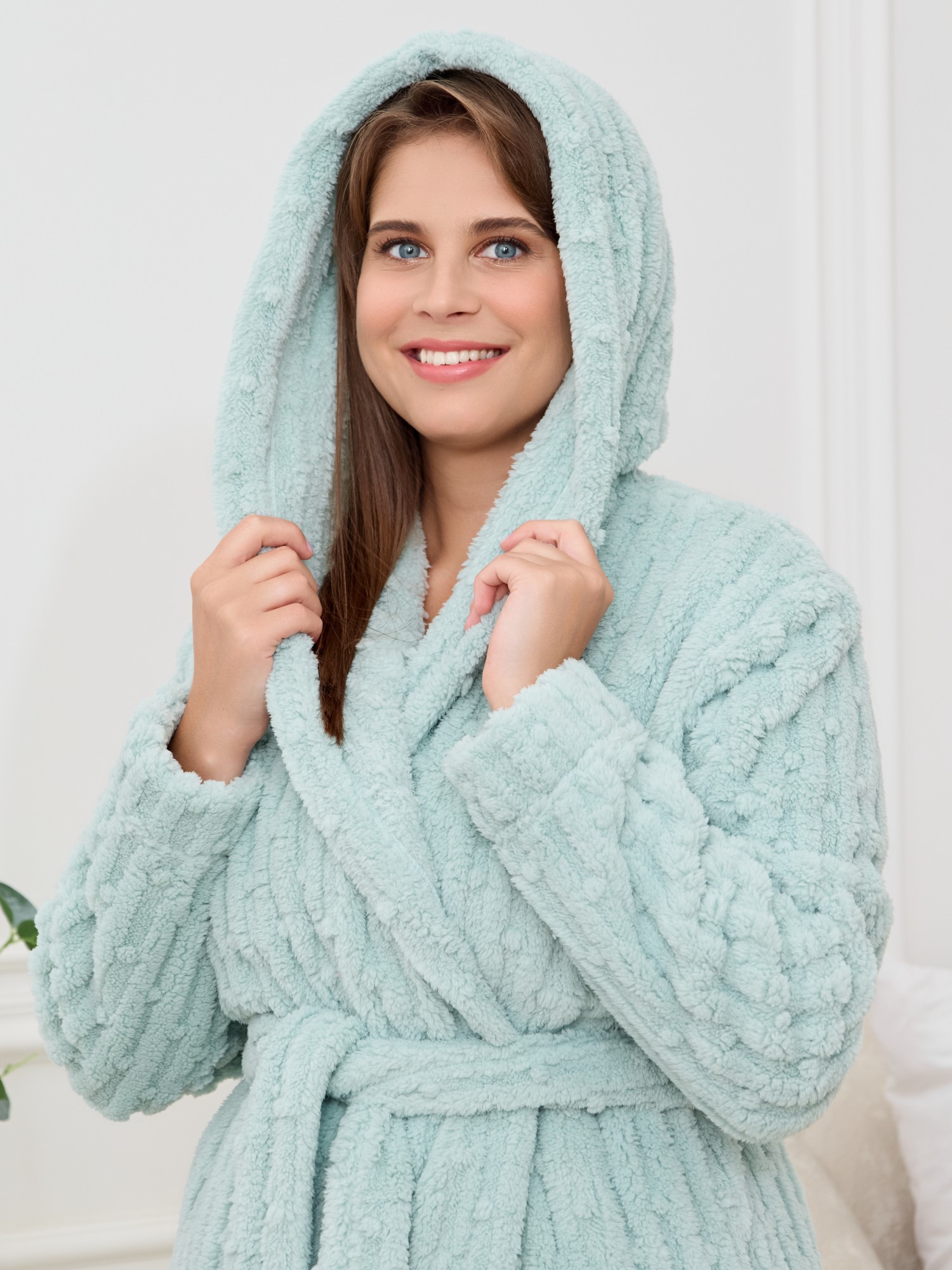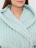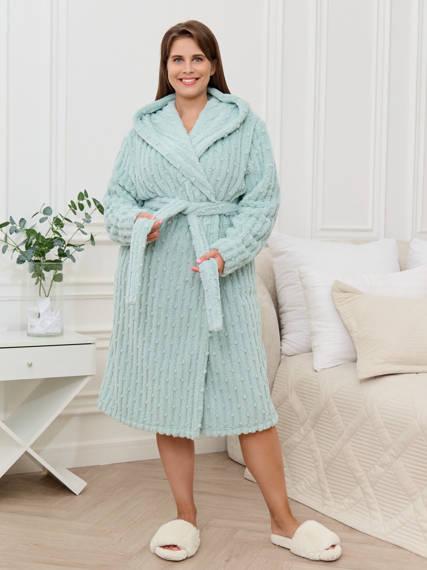 Халат женский из гладкокрашенного трикотажного полотна «велсофт» со стриженым рисунком, прямого силуэта, на запахе, с длинными втачными рукавами, капюшоном, карманами в боковых швах и съемным поясом, фиксирующимся на талии двумя шлевками в боковых швах.