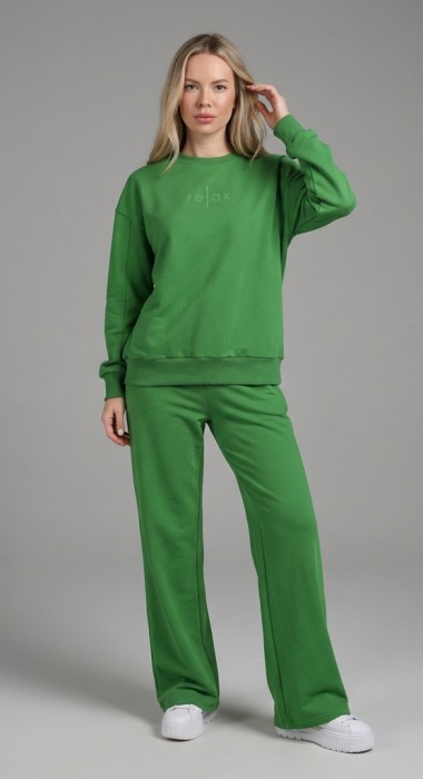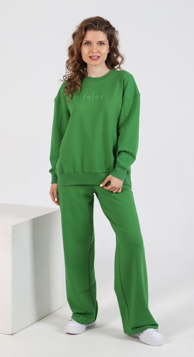 Костюм из гладкокрашеного трикотажного полотна «футер-двунитка», состоящий из джемпера и брюк. Джемпер - прямого силуэта, с длинными втачными рукавами, горловиной овальной формы, обработанной втачной планкой, притачным поясом и принтом на полочке, выполненным методом шелкографии. Манжеты рукавов, планка горловины и полупояса по низу изделия выполнены из эластичного полотна «рибана» в тон основному материалу, боковые швы смещены в сторону переда. Брюки – длинные слегка расширенные книзу, на притачном поясе с эластичной тесьмой внутри и карманами в боковых швах.