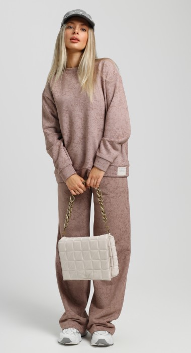 Костюм молодежный из трикотажного полотна футер трехнитка с «эффектом замши», состоящий из джемпера и брюк. Джемпер – прямого силуэта, с длинными втачными рукавами, горловиной овальной формы, обработанной втачной планкой. Рукава с манжетами, низ - с притачным поясом, дополненным декоративным элементом-нашивкой.Брюки – длинные, свободные, на притачном поясе с эластичной тесьмой внутри, карманами в боковых швах.