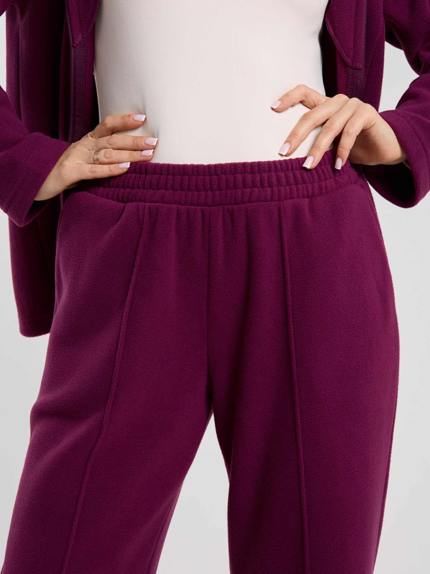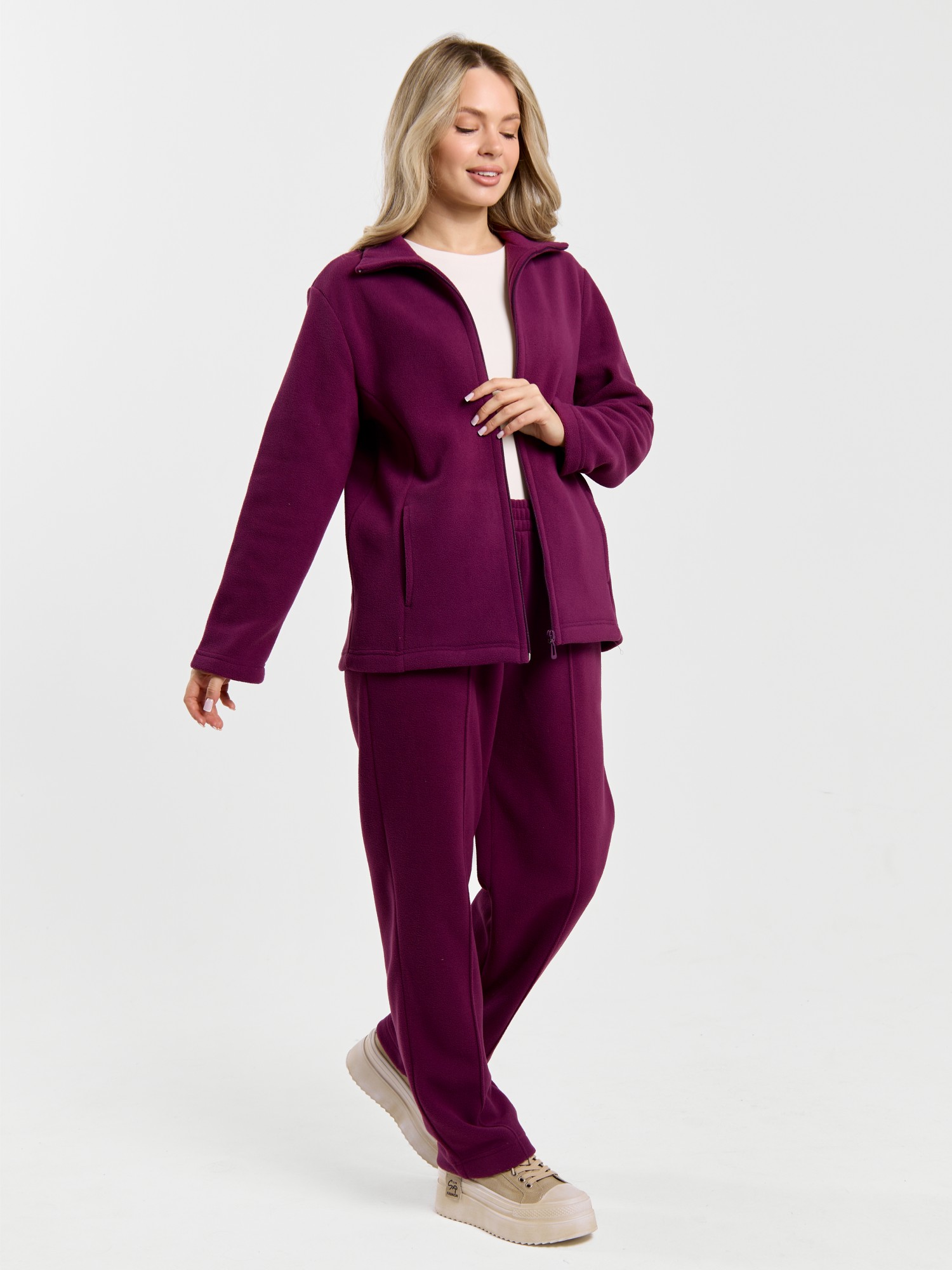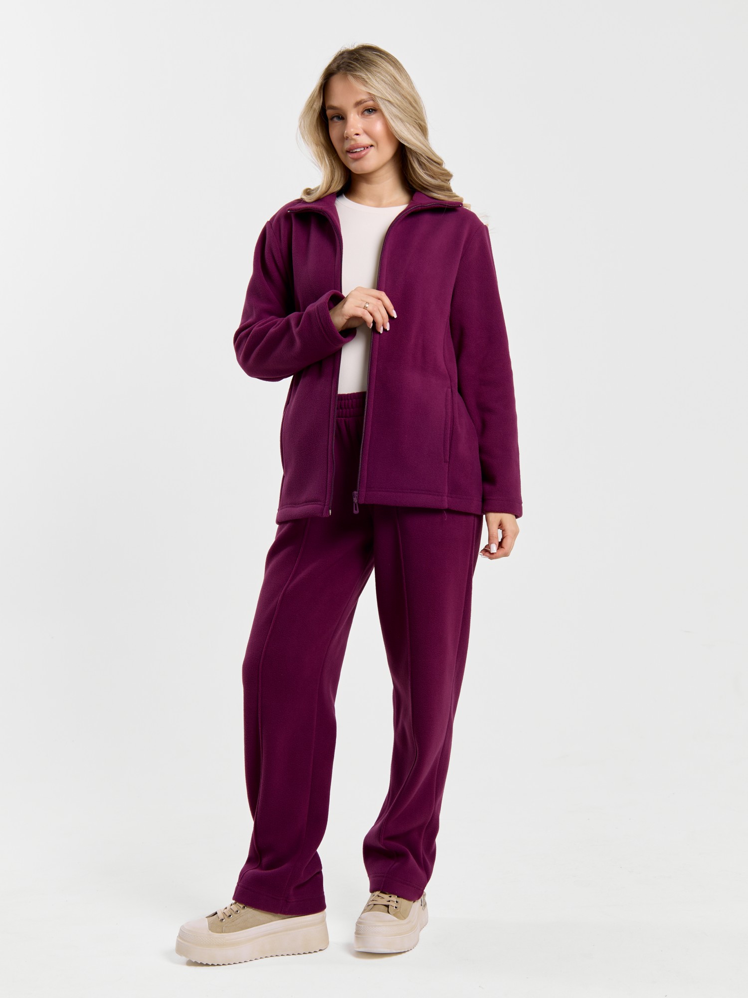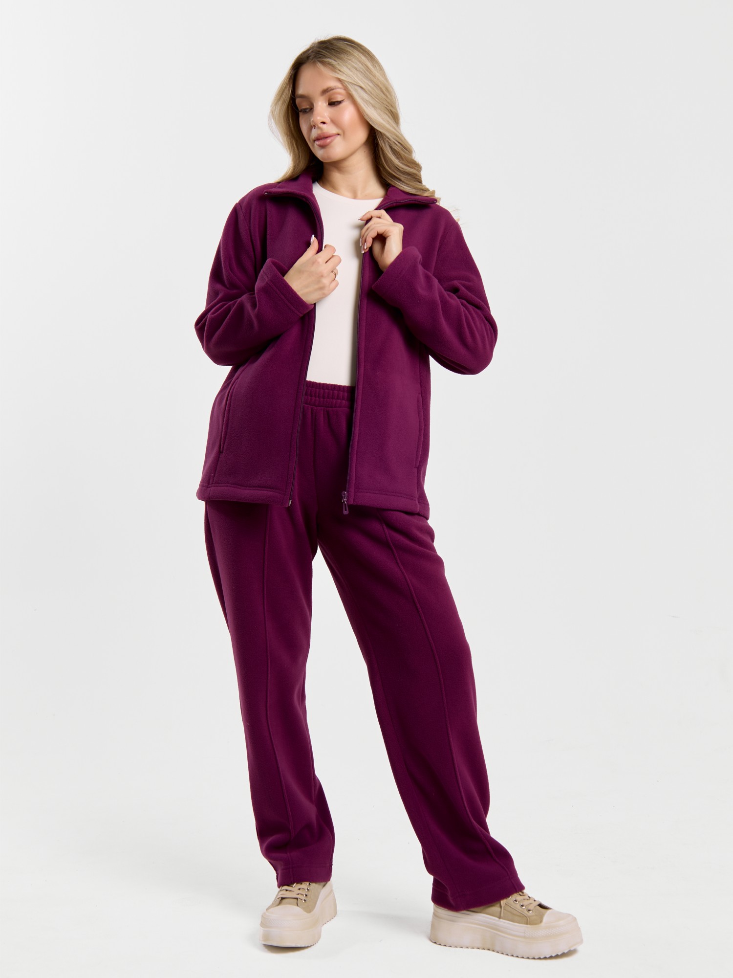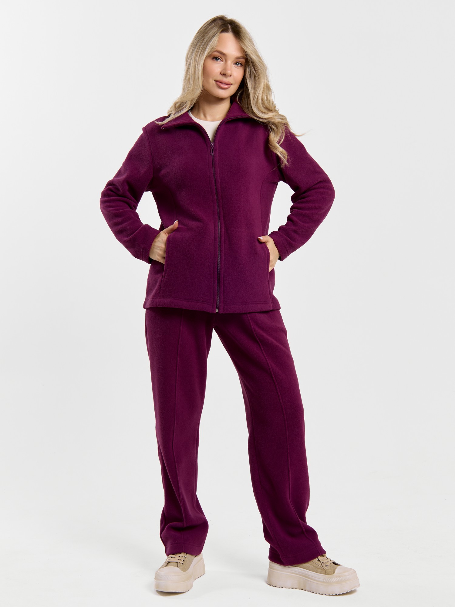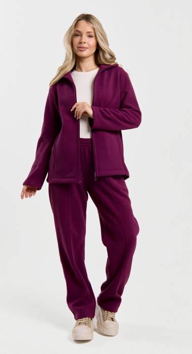 Костюм молодежный из гладкокрашенного трикотажного полотна «флис», Толстовка - полуприлегающего силуэта, с длинными втачными рукавами, воротником «стойка», карманами в рельефных швах, центральной бортовой застежкой на тесьму «молния». Брюки длинные, полуприлегающего силуэта, на притачном поясе с эластичной тесьмой внутри и карманами в боковых швах. Передние половины застрочены поцентральным линиям, низ брюк обработан подгибкой с вложением эластичной тесьмы и регулируется по ширине с помощью фиксаторов.