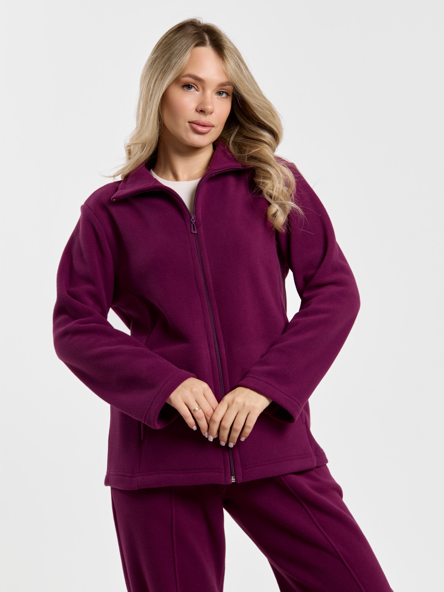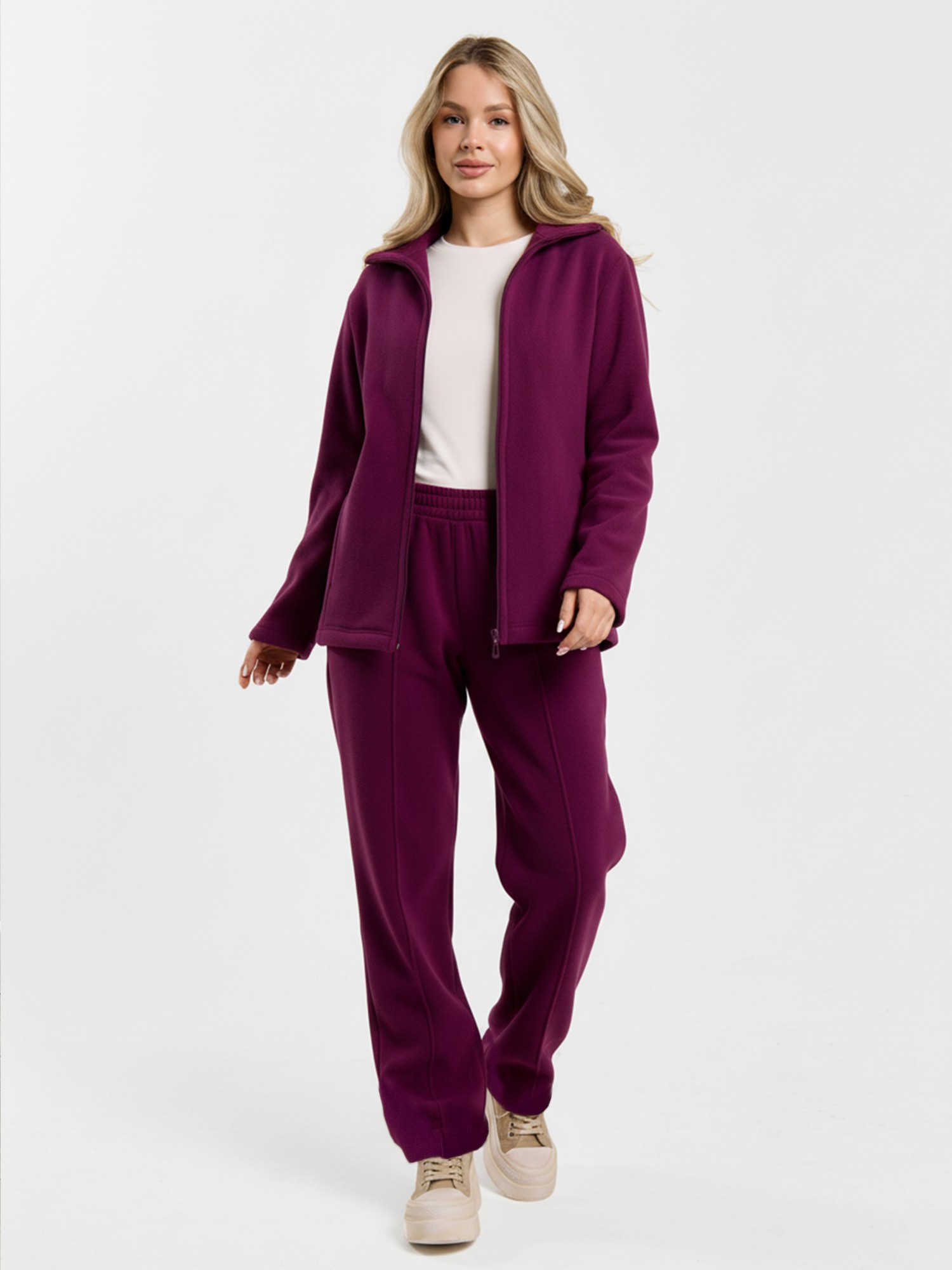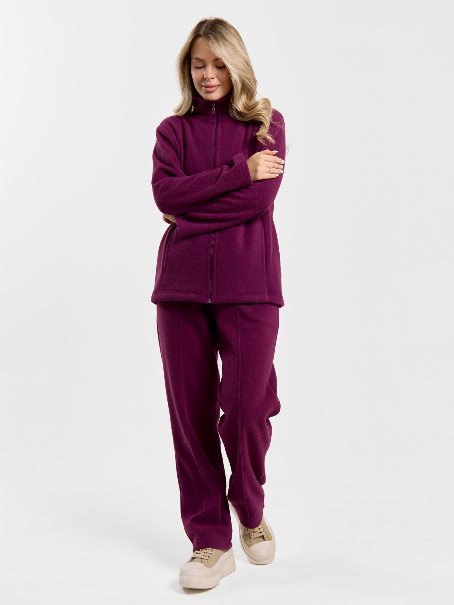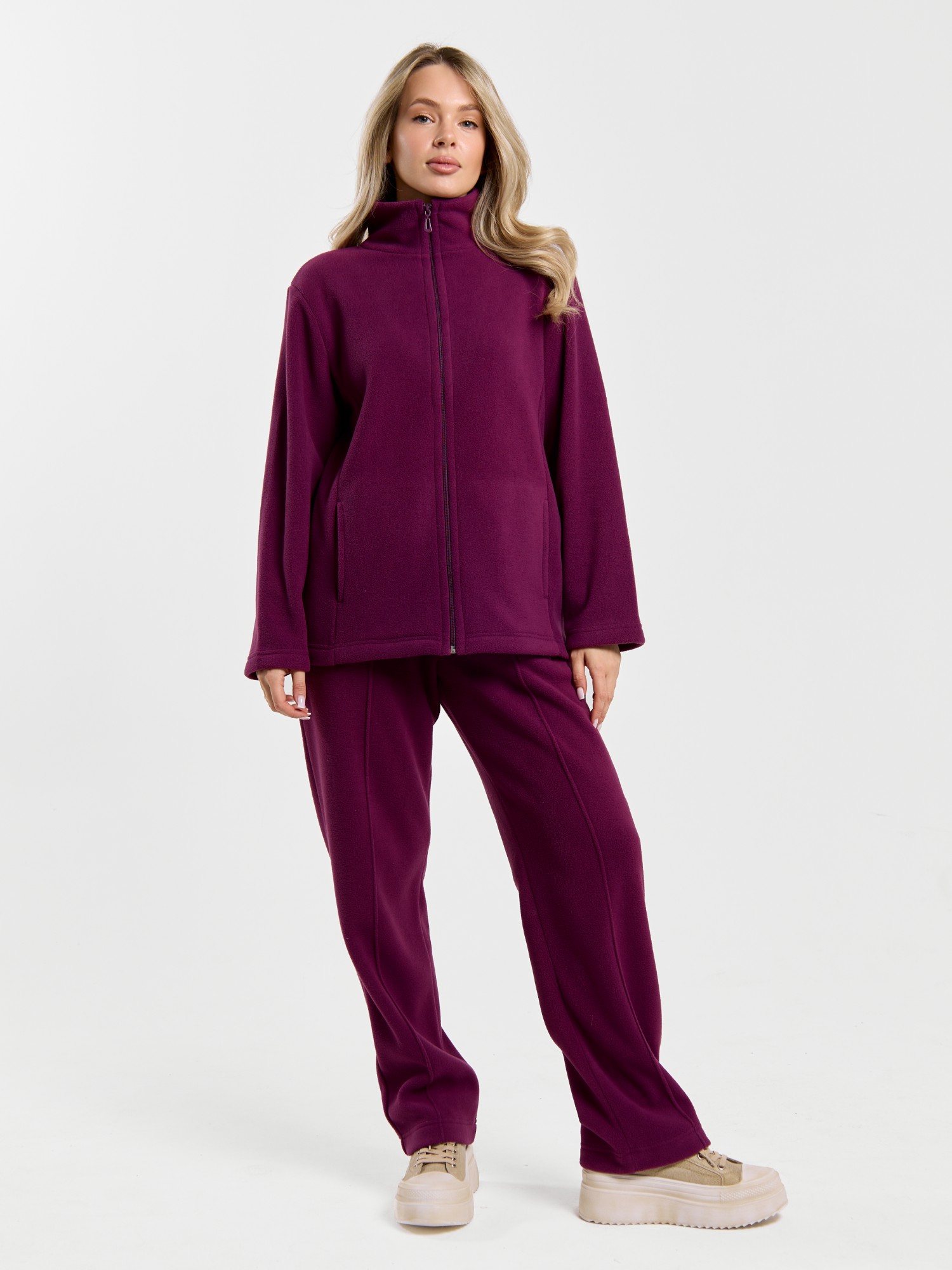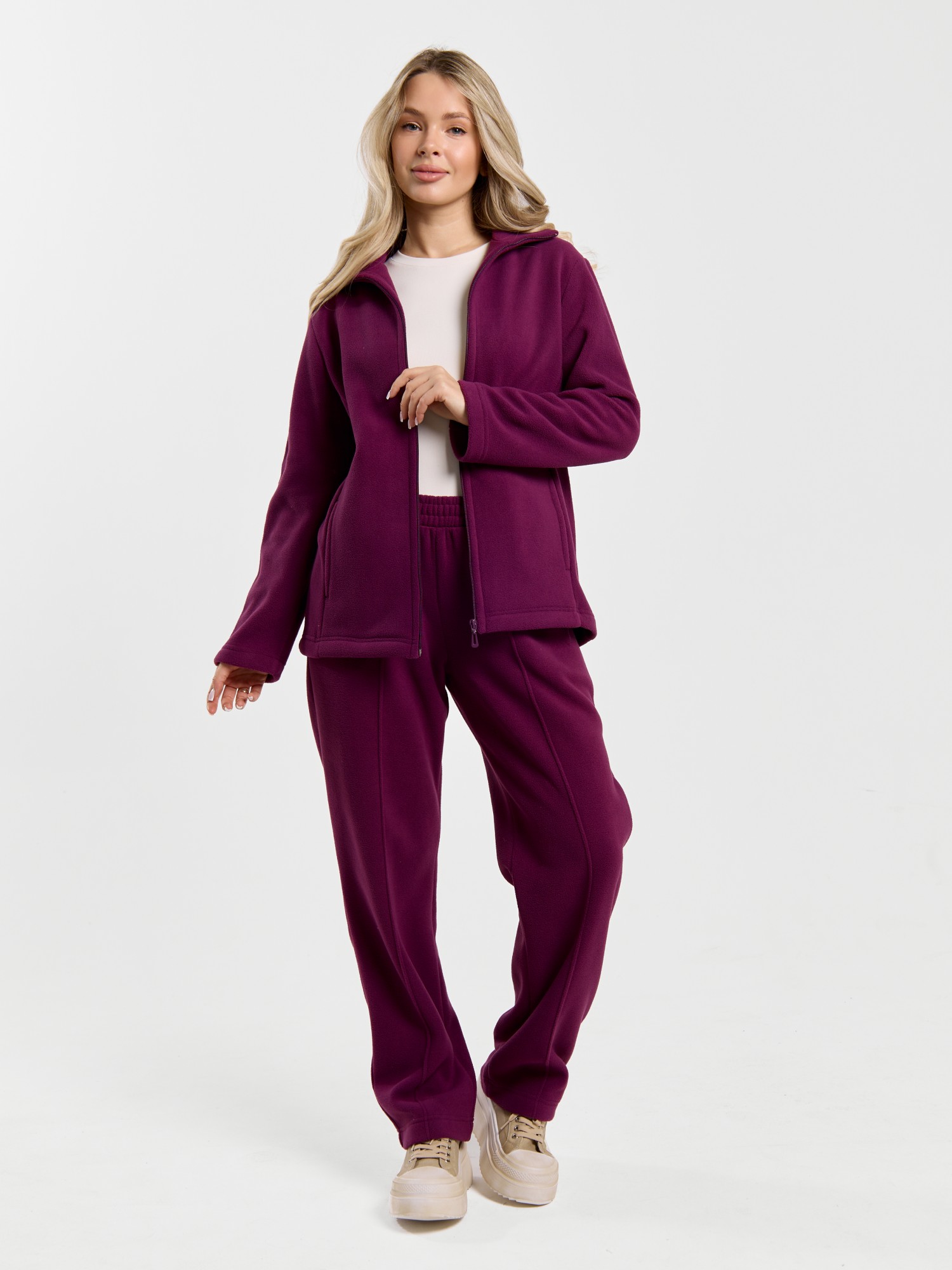 Костюм молодежный из гладкокрашенного трикотажного полотна «флис», Толстовка - полуприлегающего силуэта, с длинными втачными рукавами, воротником «стойка», карманами в рельефных швах, центральной бортовой застежкой на тесьму «молния». Брюки длинные, полуприлегающего силуэта, на притачном поясе с эластичной тесьмой внутри и карманами в боковых швах. Передние половины застрочены поцентральным линиям, низ брюк обработан подгибкой с вложением эластичной тесьмы и регулируется по ширине с помощью фиксаторов.